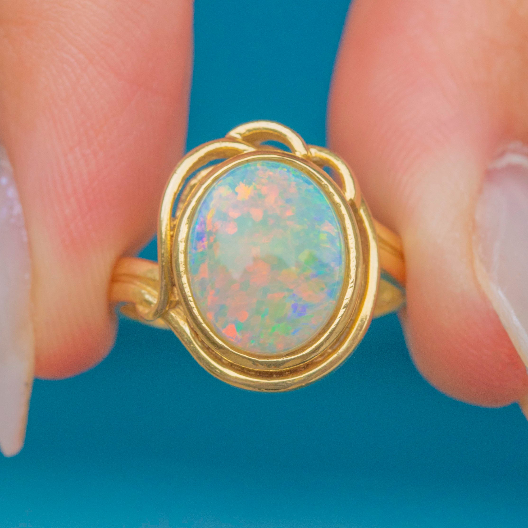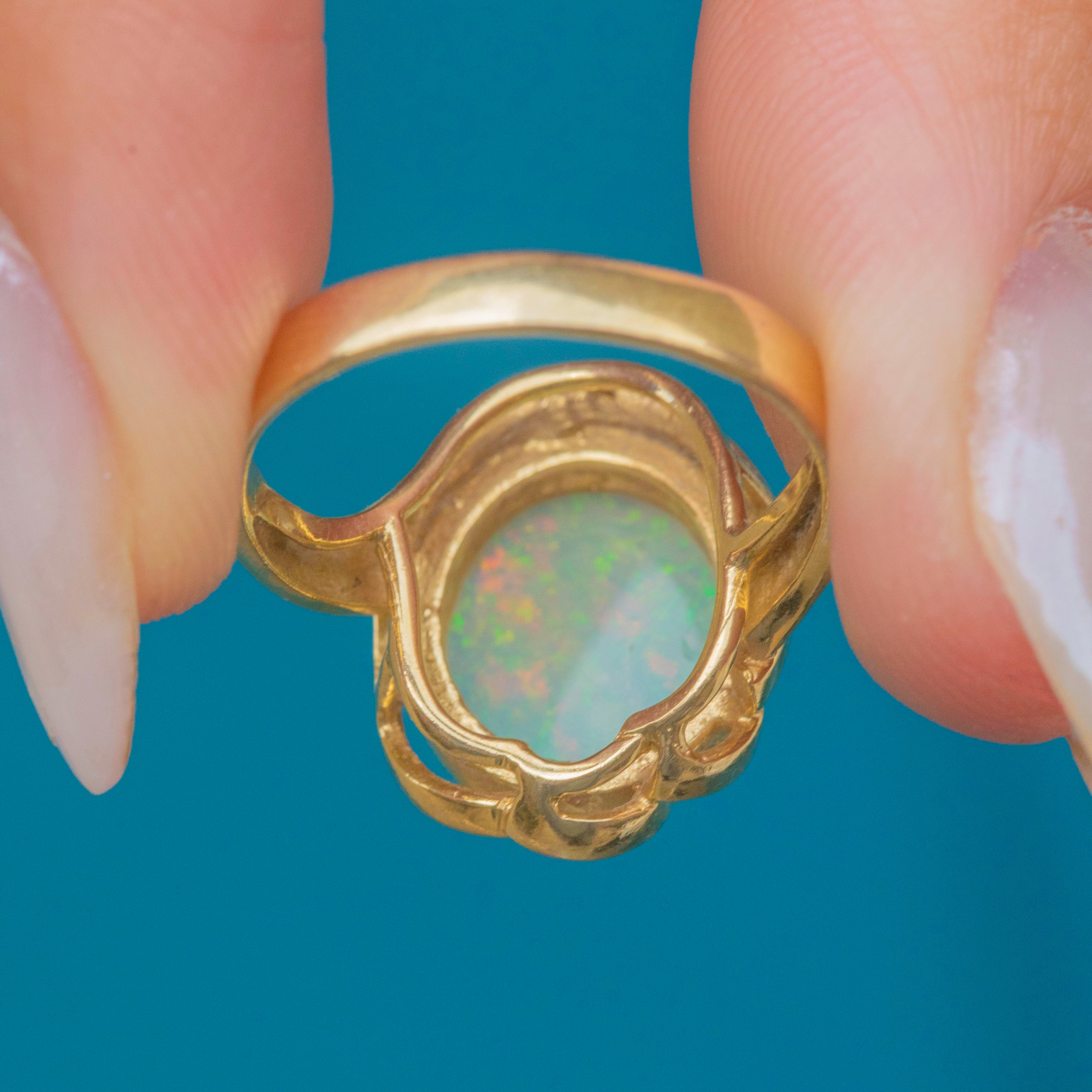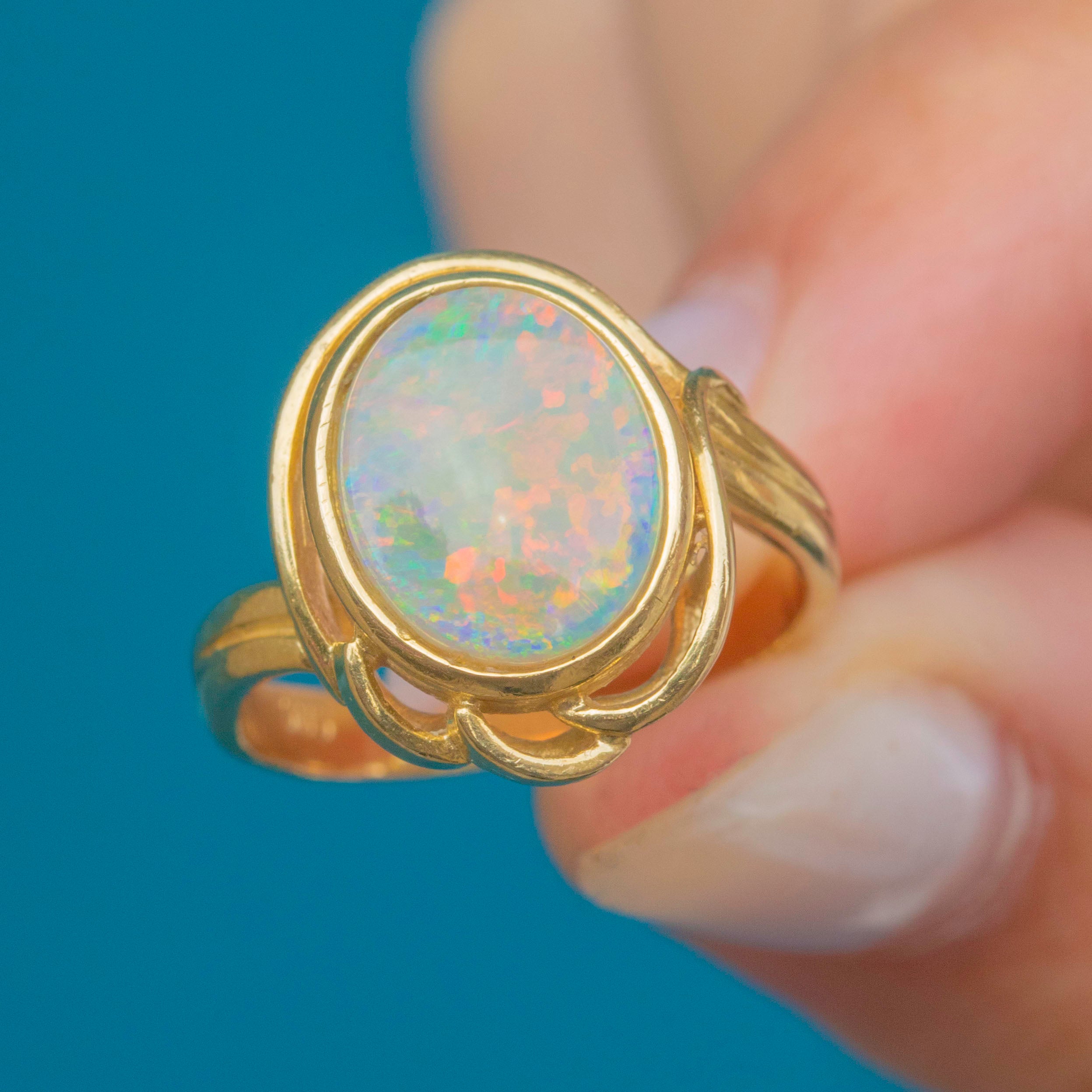 The Opal is set within a bright and glossy 14ct Gold bezel with unique wirework detailing that curves round to form the smooth ring band. Providing ample finger coverage, this vintage Opla ring will make a standout addition to your collection!
