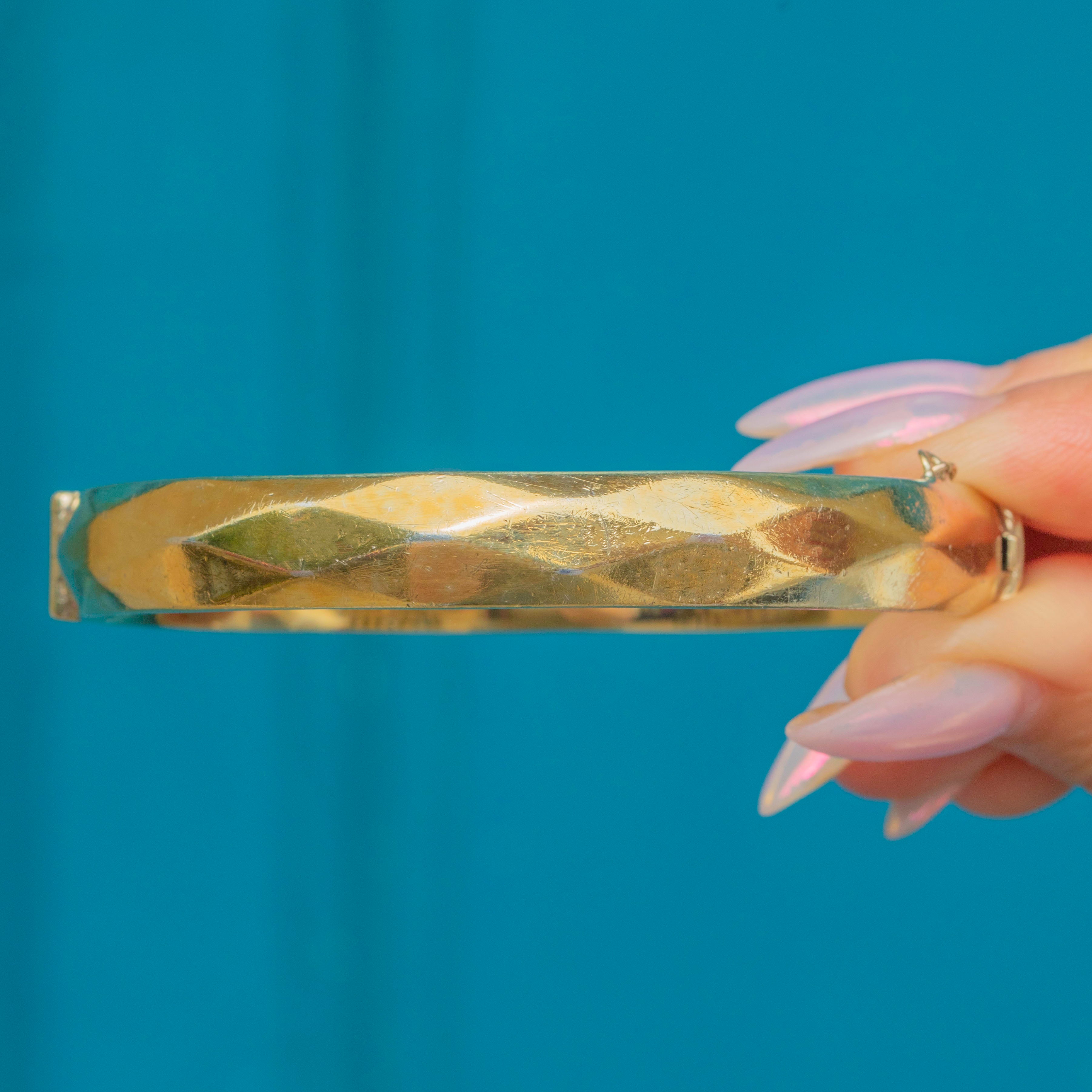This vintage bangle is crafted from Silver plated with buttery 22ct Gold, with a gorgeous faceted form akin to a mirror ball. Fully hallmarked and dated to 1966, this chunky glossy bangle radiates vintage allure as it adorns your wrist!