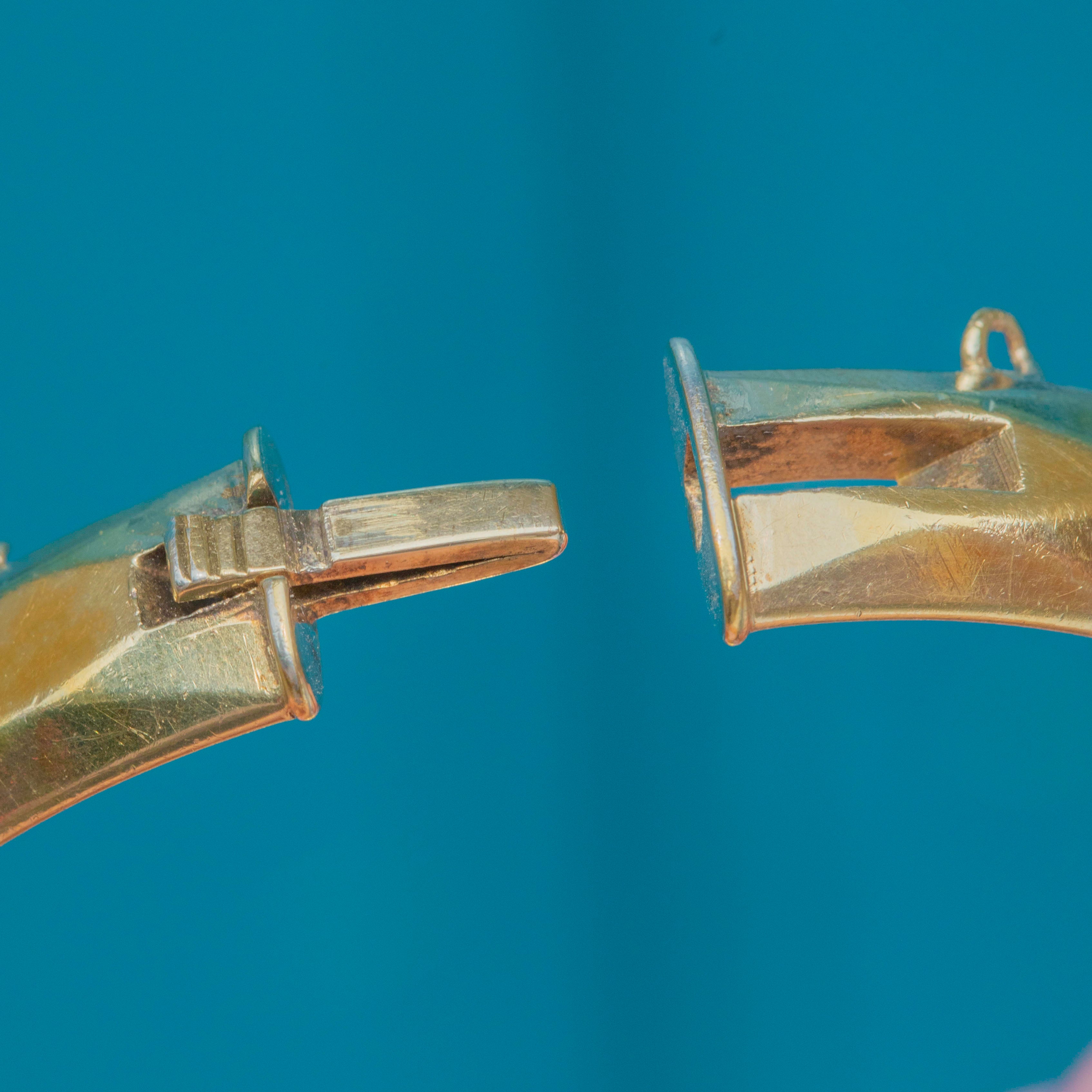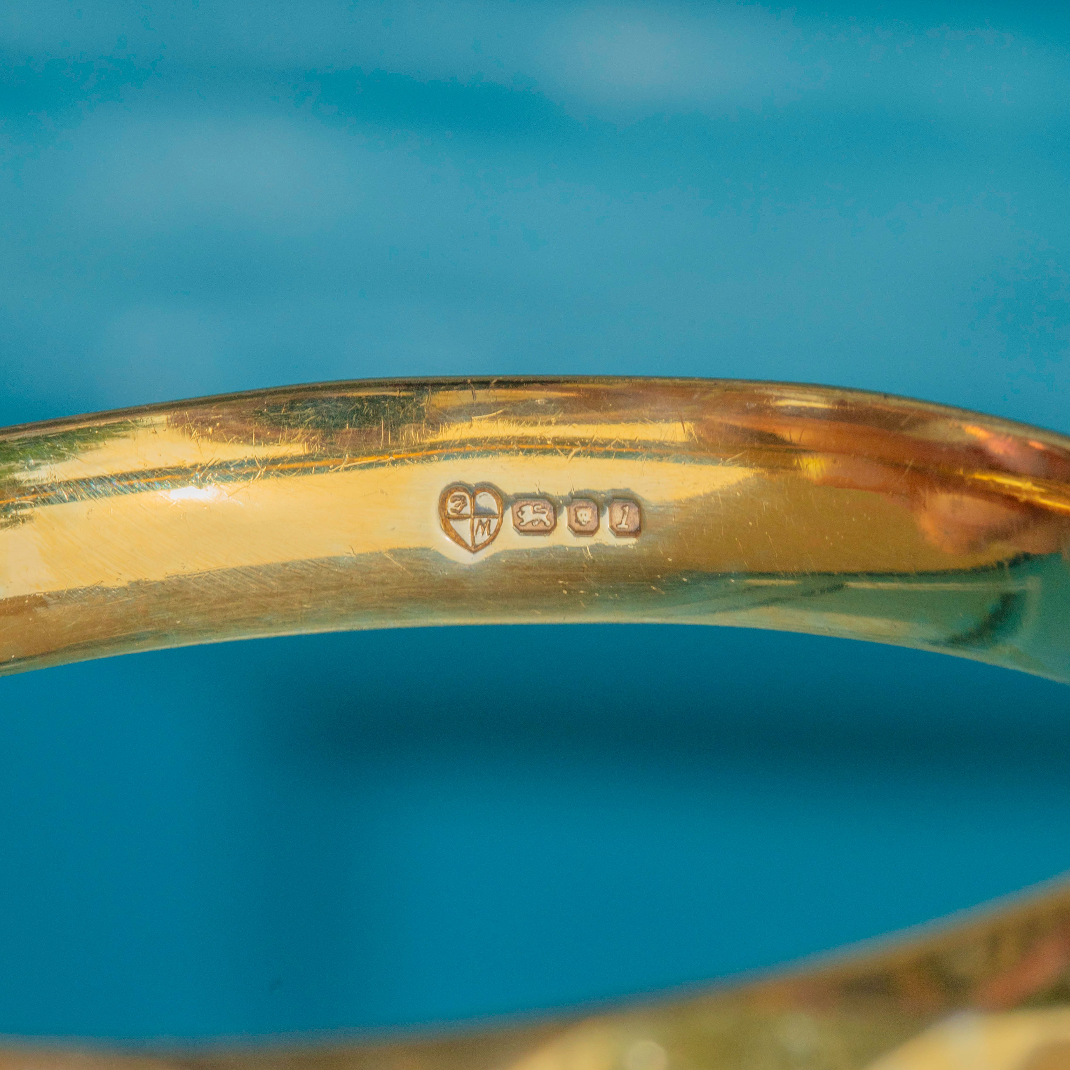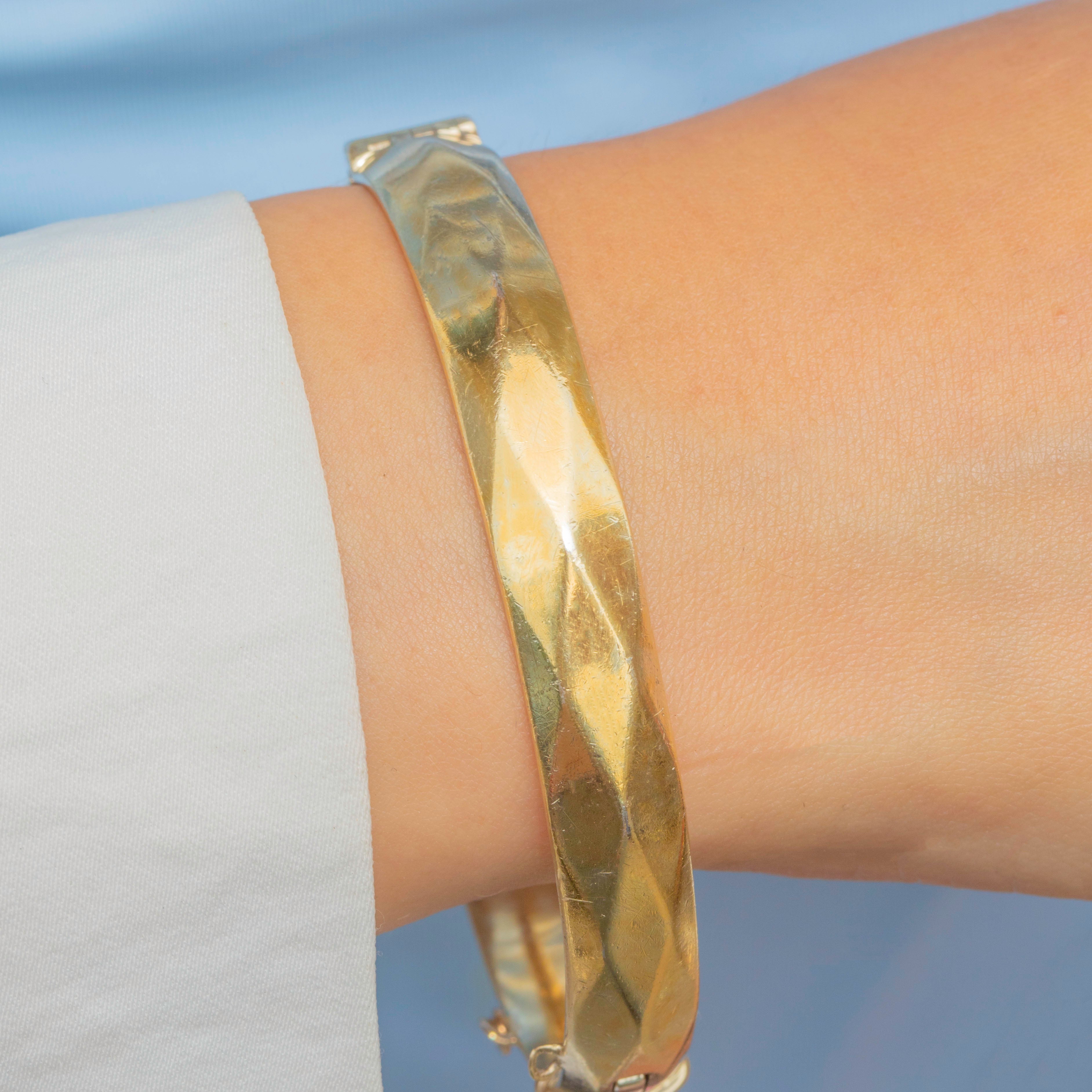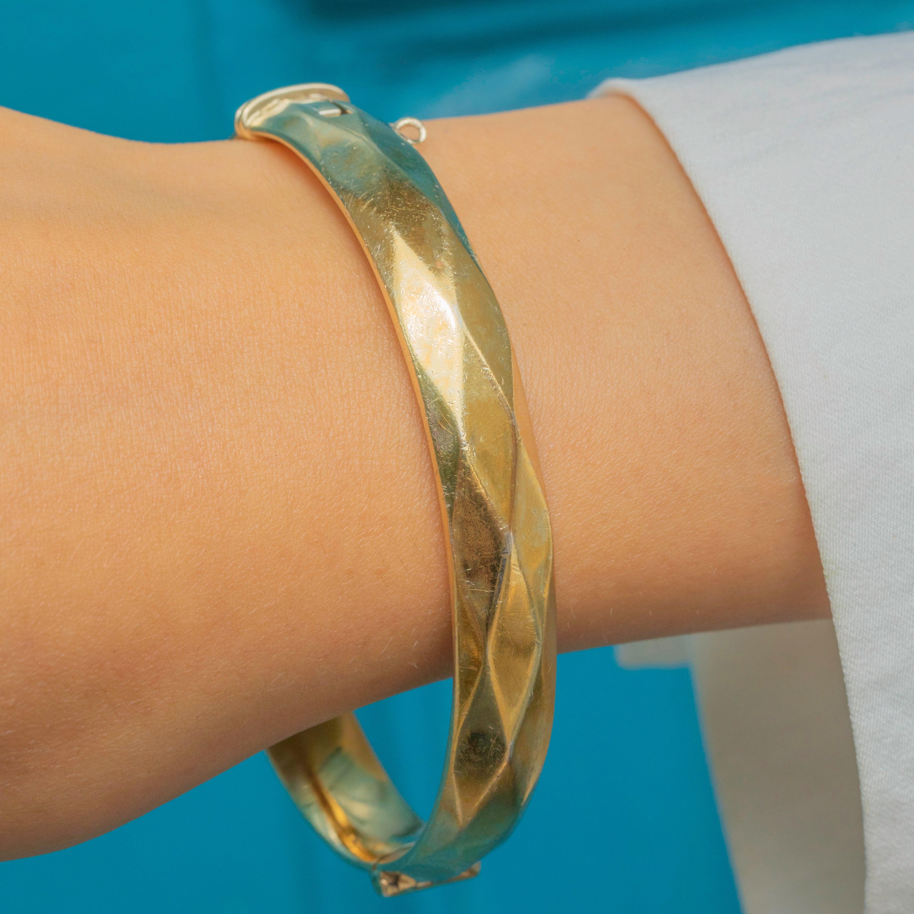 VERY GOOD: The 22ct plated Gold bangle is bright and buttery, with only mild surface wear, including spots of discolouration and scratches. Despite this, the bangle has been formed beautifully and closes with a nice 'click', ensuring you can wear it with utmost confidence!