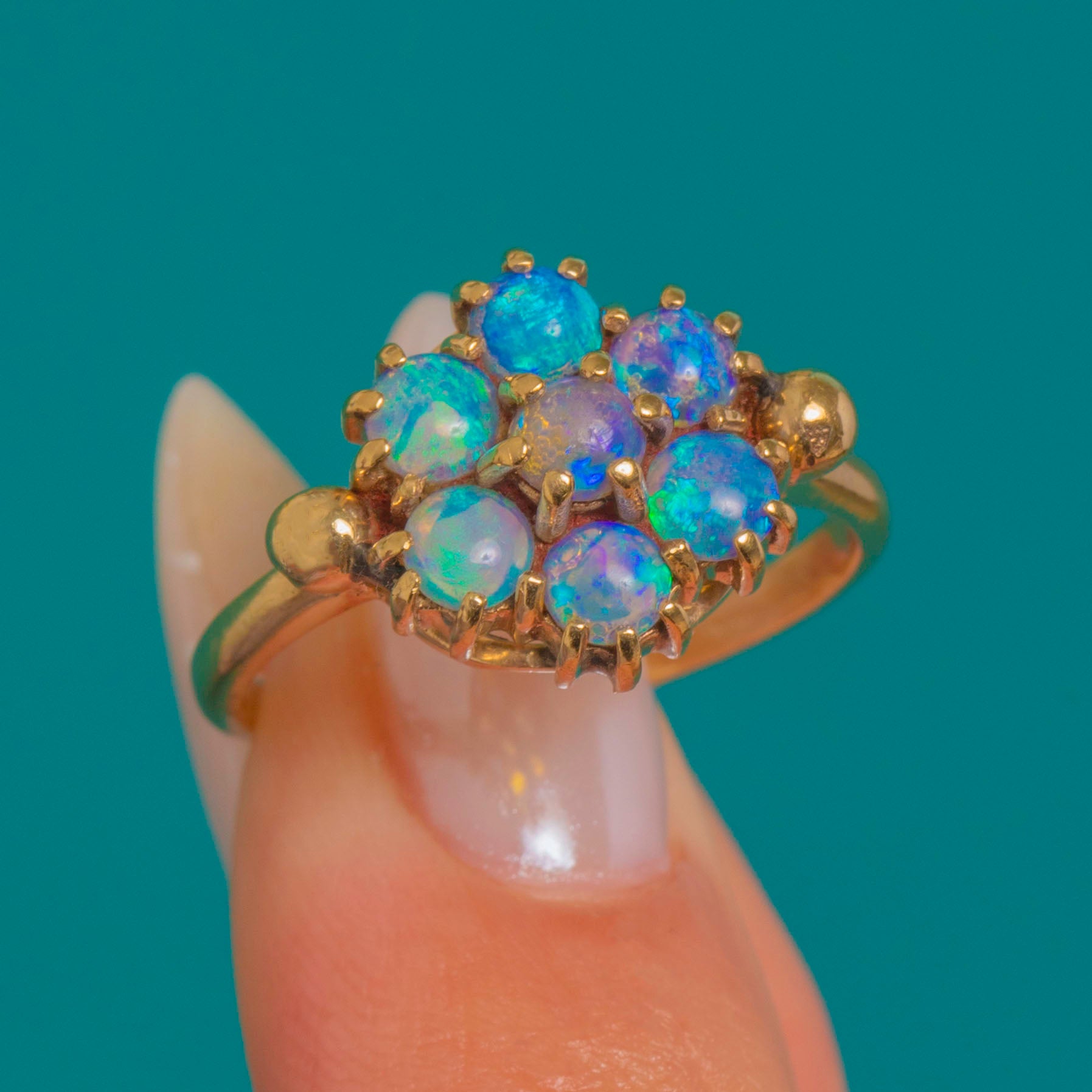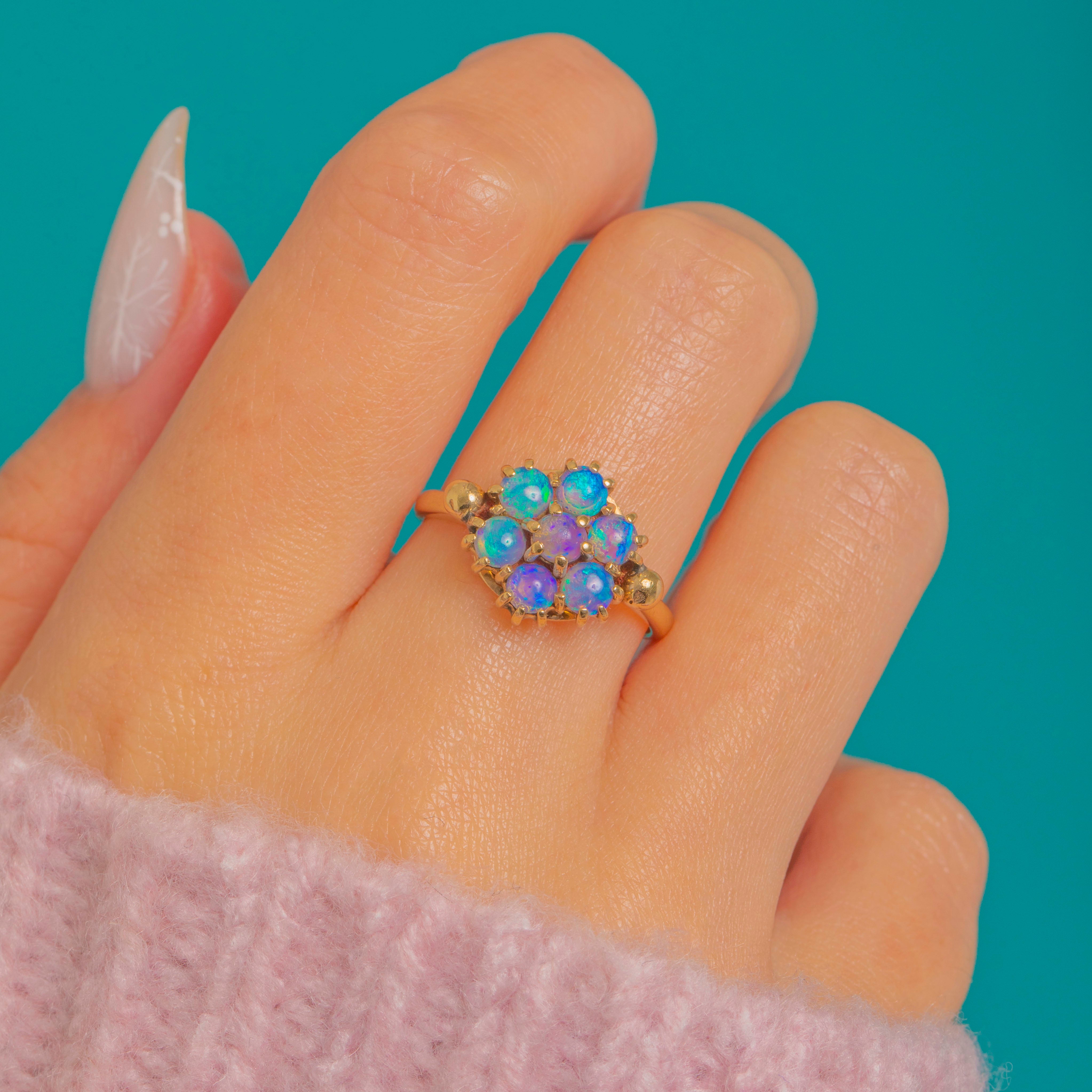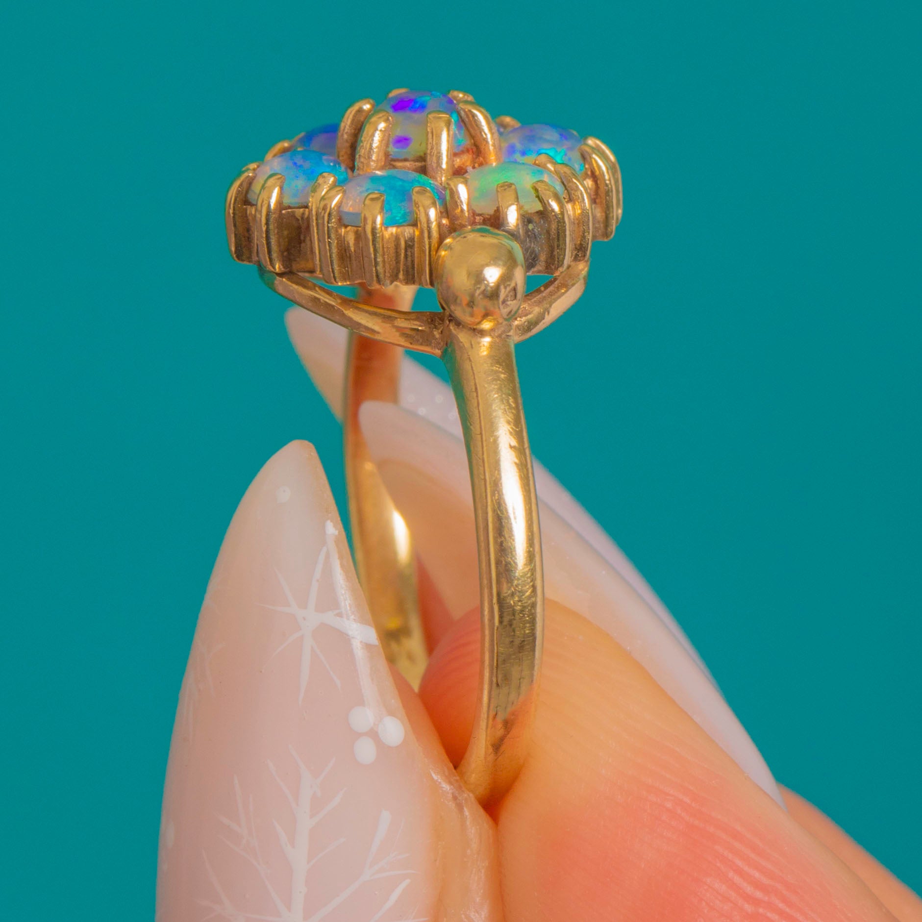 A joyful Mid-Century bloom in 9ct Gold, this glowy Opal flower ring captures the romance of a classic “daisy” cluster. Seven cabochon Opals shimmer with vivid blue-green play-of-colour, flashing lilac and pink as the light moves—petite gems that deliver a surprisingly radiant glow.