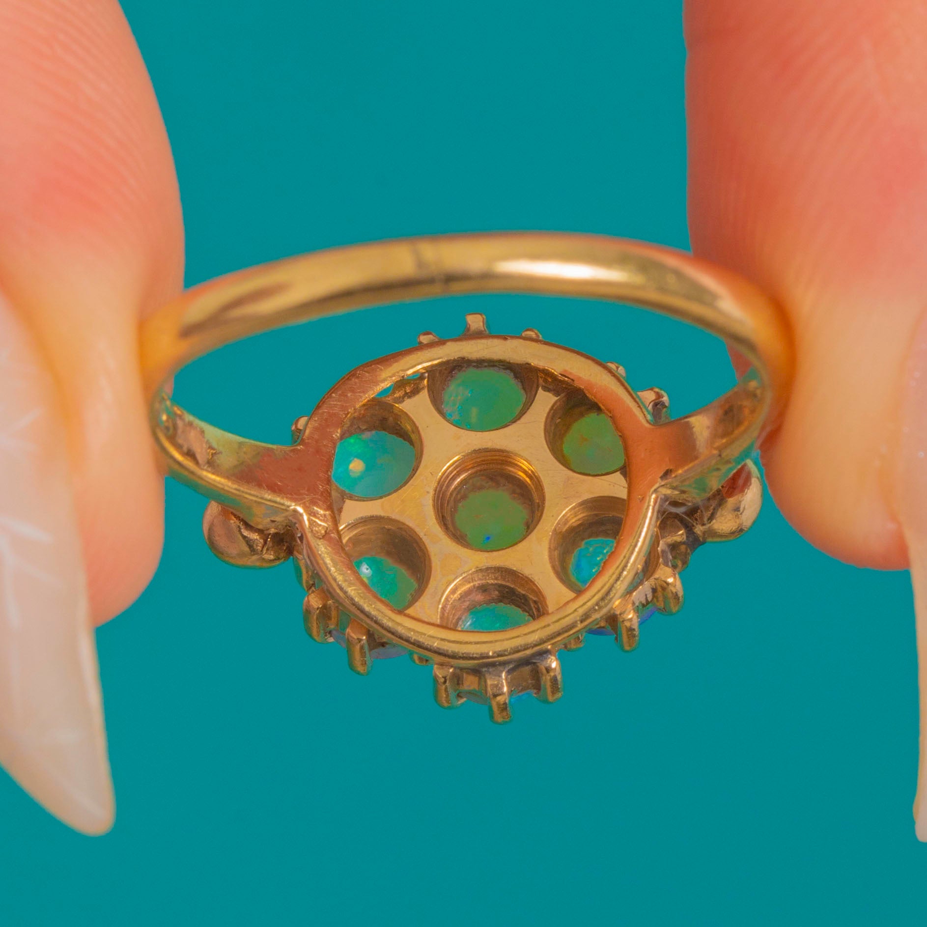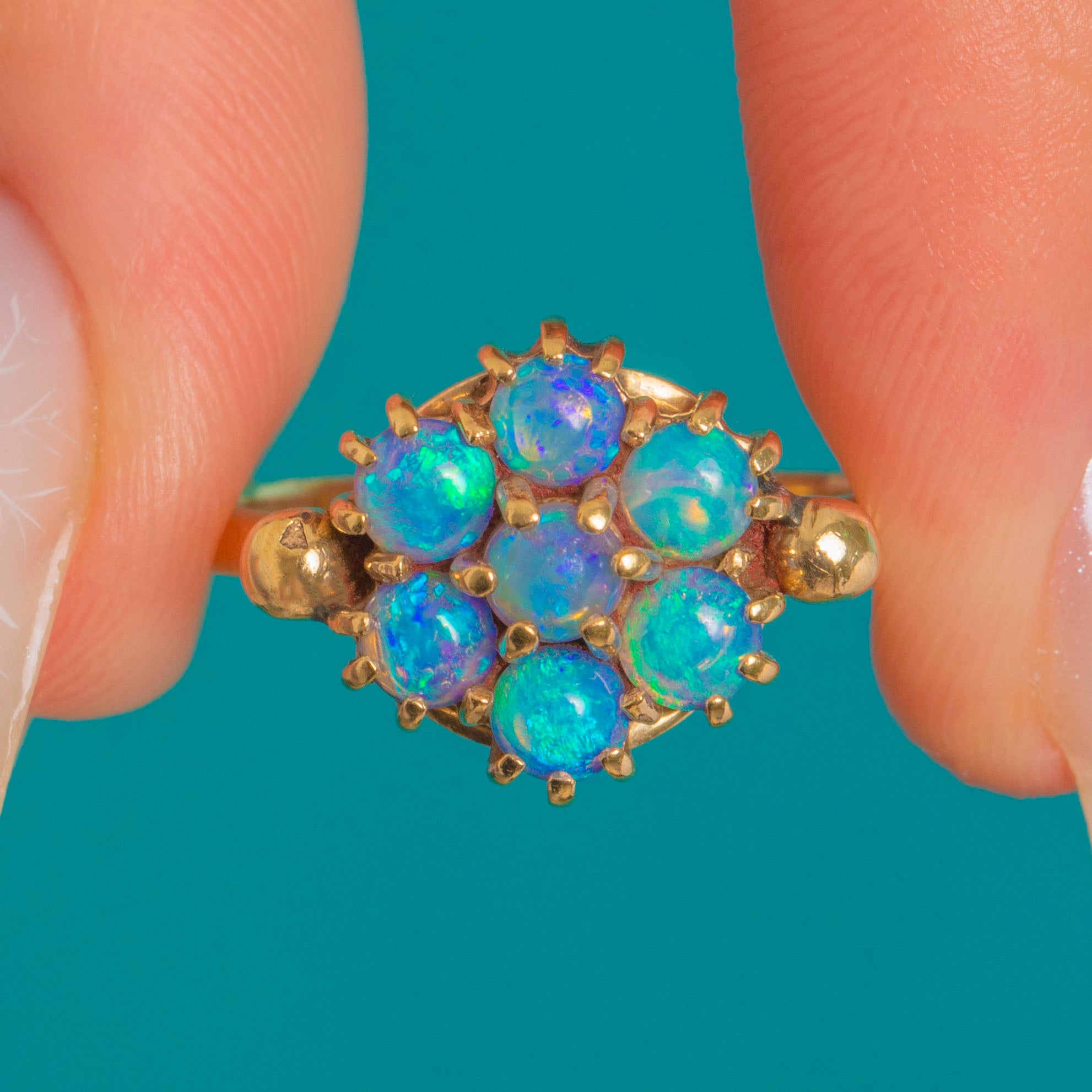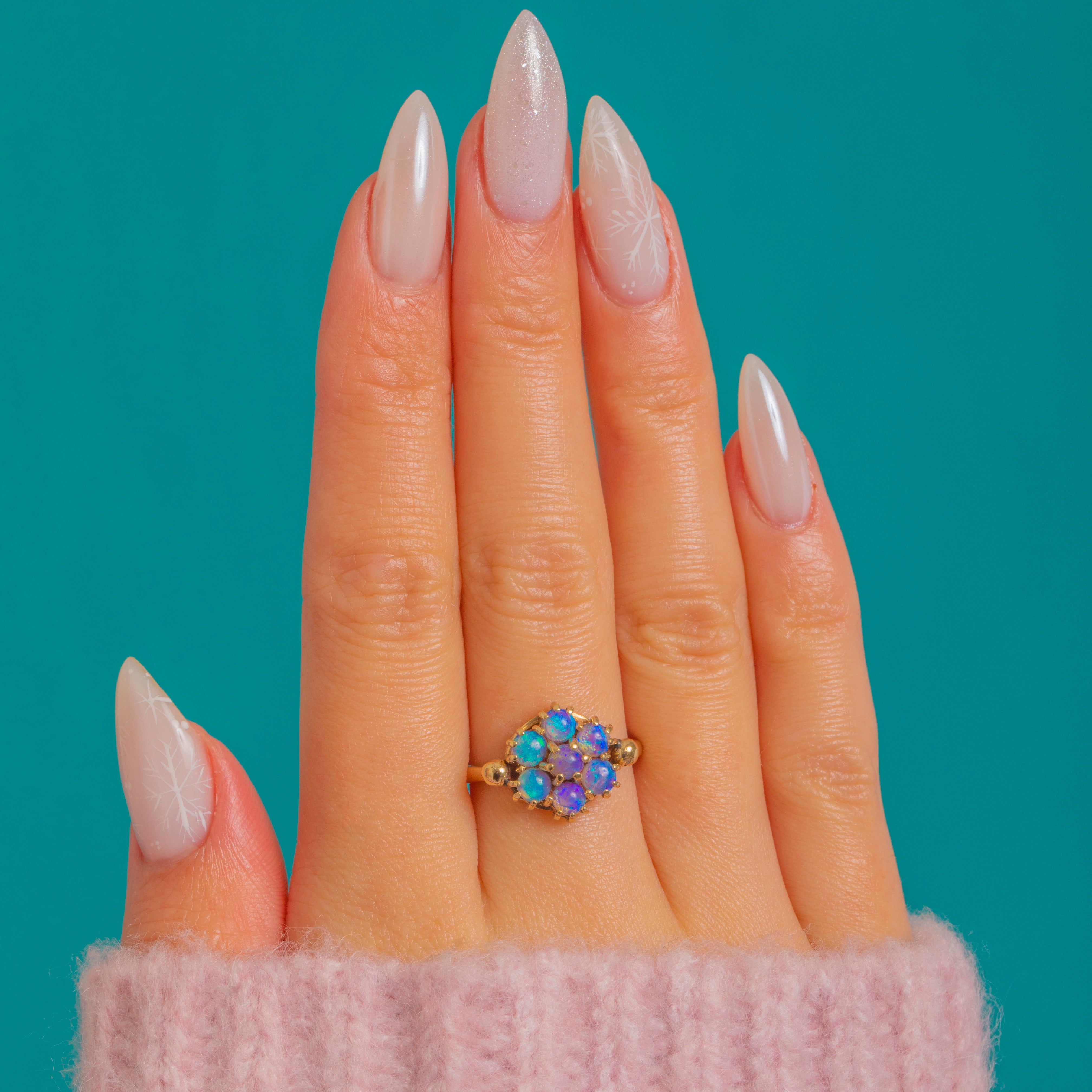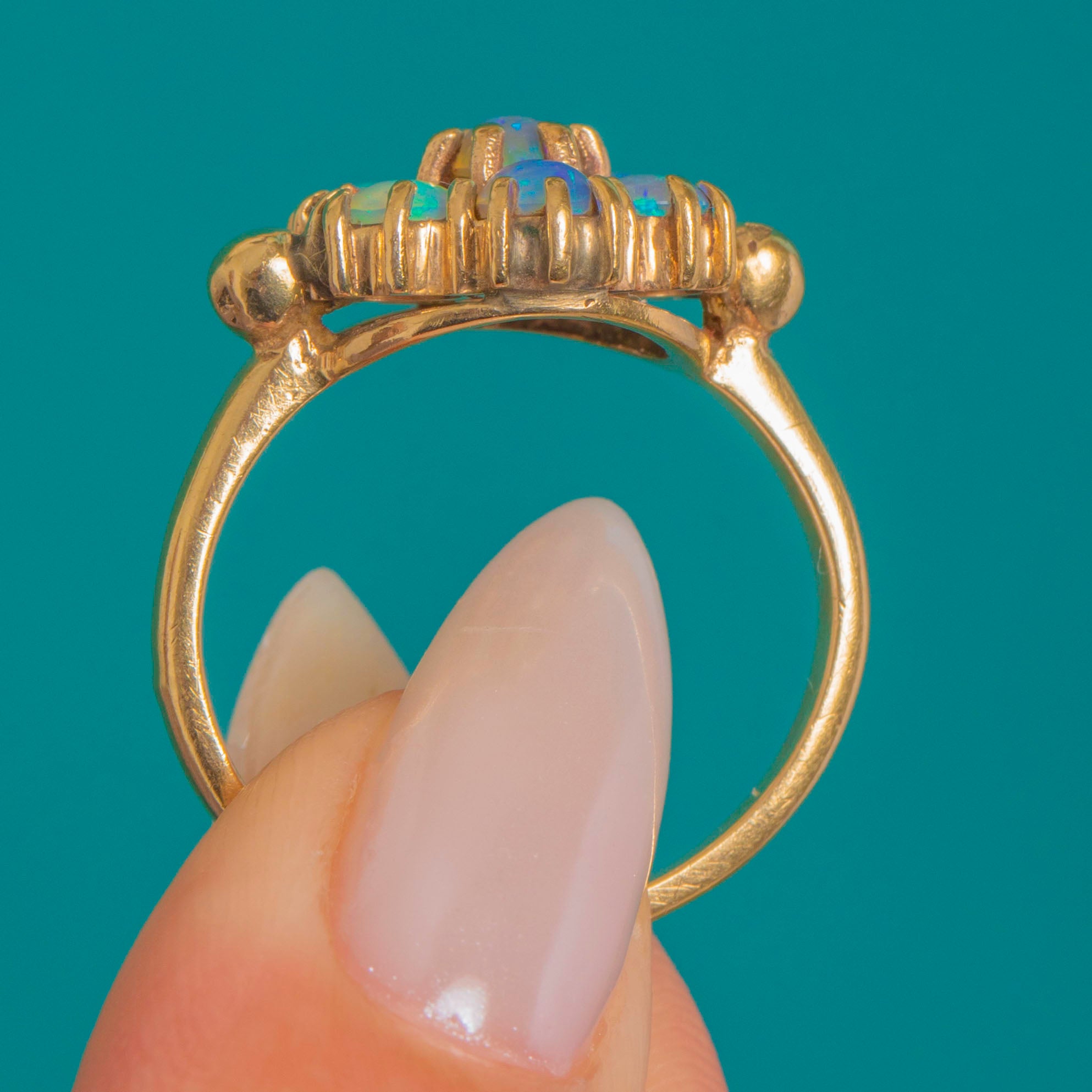 A joyful Mid-Century bloom in 9ct Gold, this glowy Opal flower ring captures the romance of a classic “daisy” cluster. Seven cabochon Opals shimmer with vivid blue-green play-of-colour, flashing lilac and pink as the light moves—petite gems that deliver a surprisingly radiant glow.