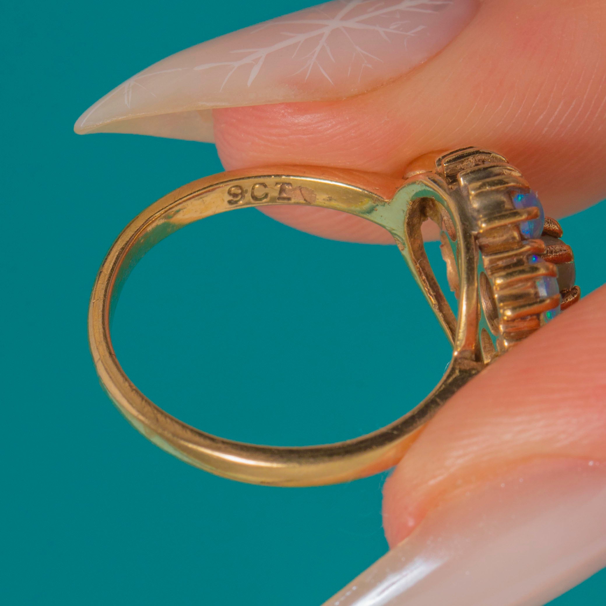 EXCELLENT: The Opals are bright with strong play-of-colour and are free from chips or notable abrasions. The 9ct Gold setting and claws are secure with only light surface wear and a gentle vintage patina. The shank is sturdy and round; a faint seam to the lower shank suggests a past size adjustment.
