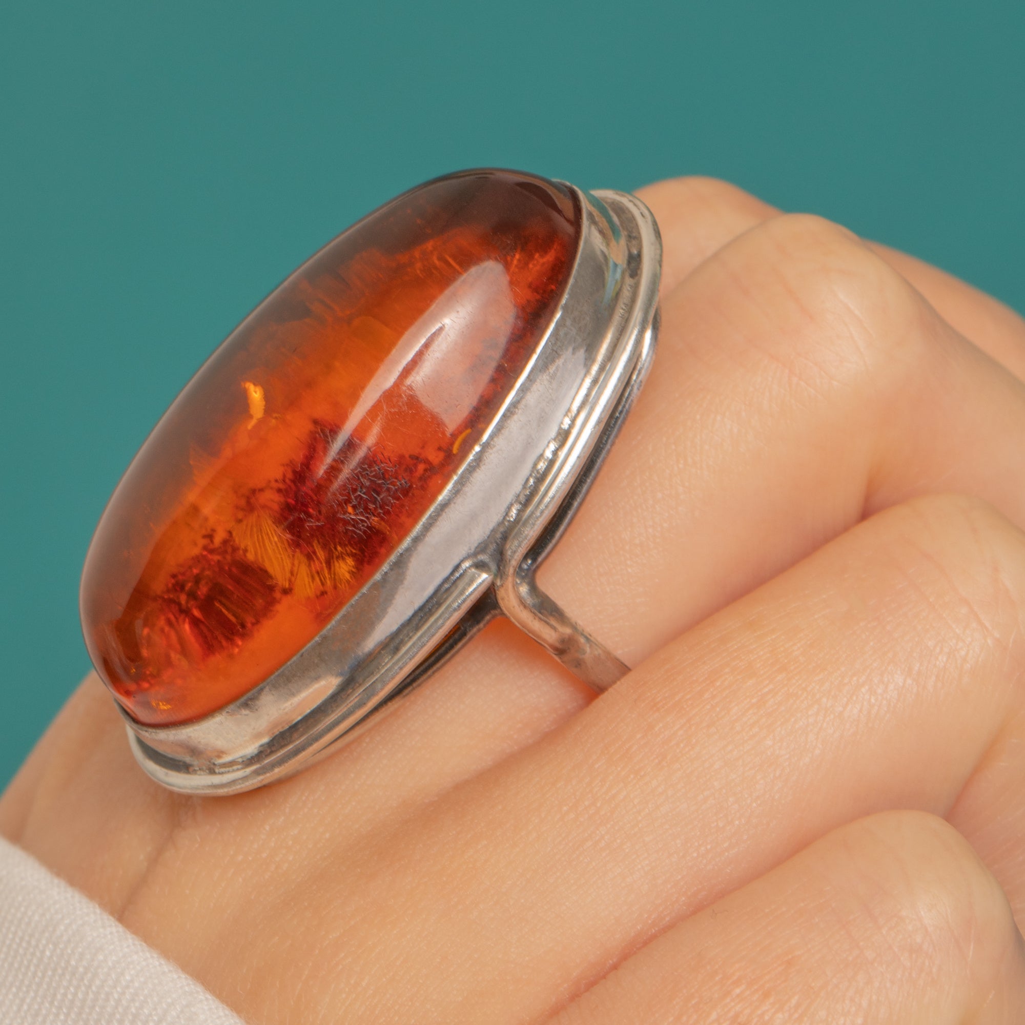Bezel-set in Sterling Silver with sculptural, hand-wrought character, the clean metalwork frames the Amber to perfection while offering everyday security and comfort. Substantial in presence at 15.5g, it’s a statement ring that feels as good as it looks—effortlessly elevating anything from denim to evening silk.