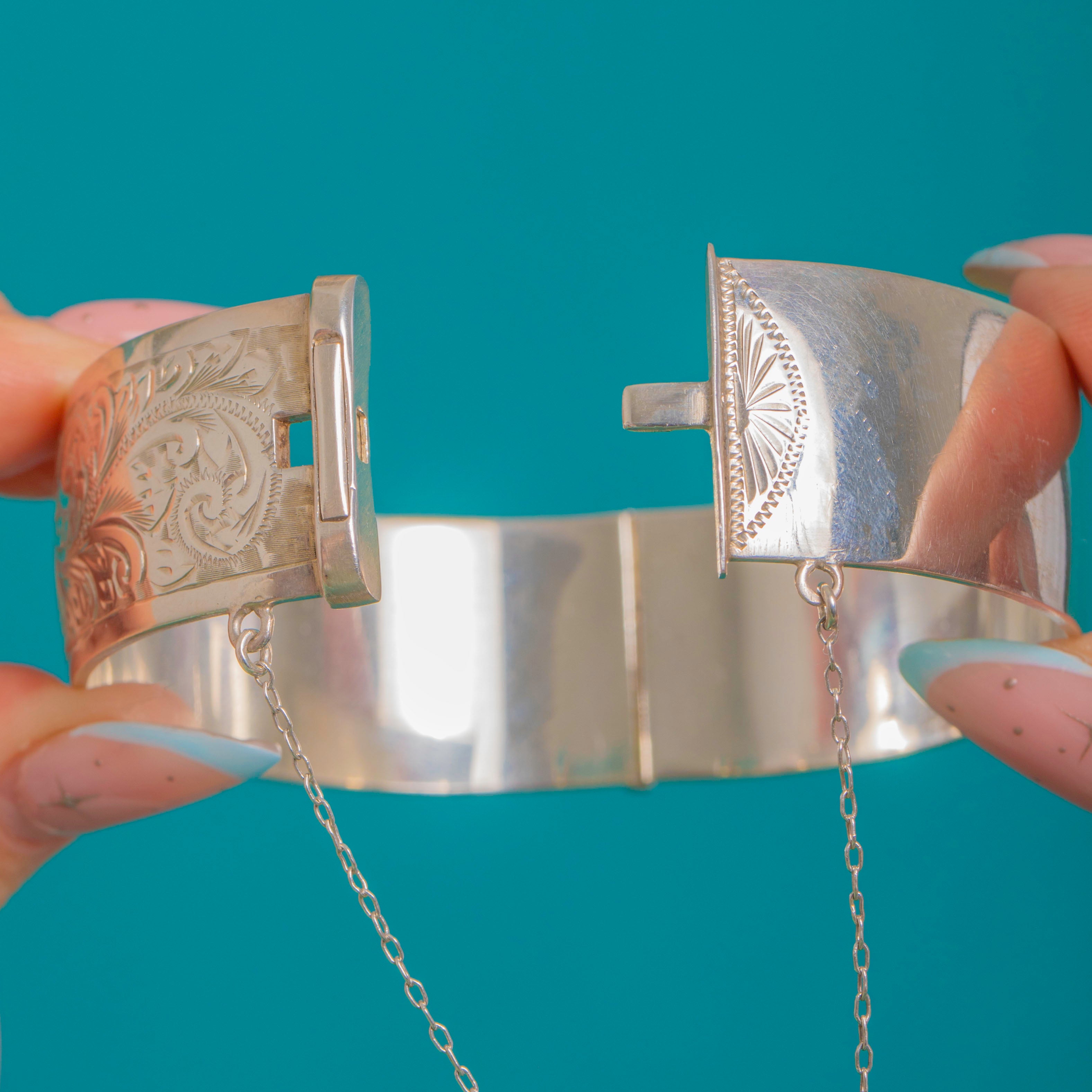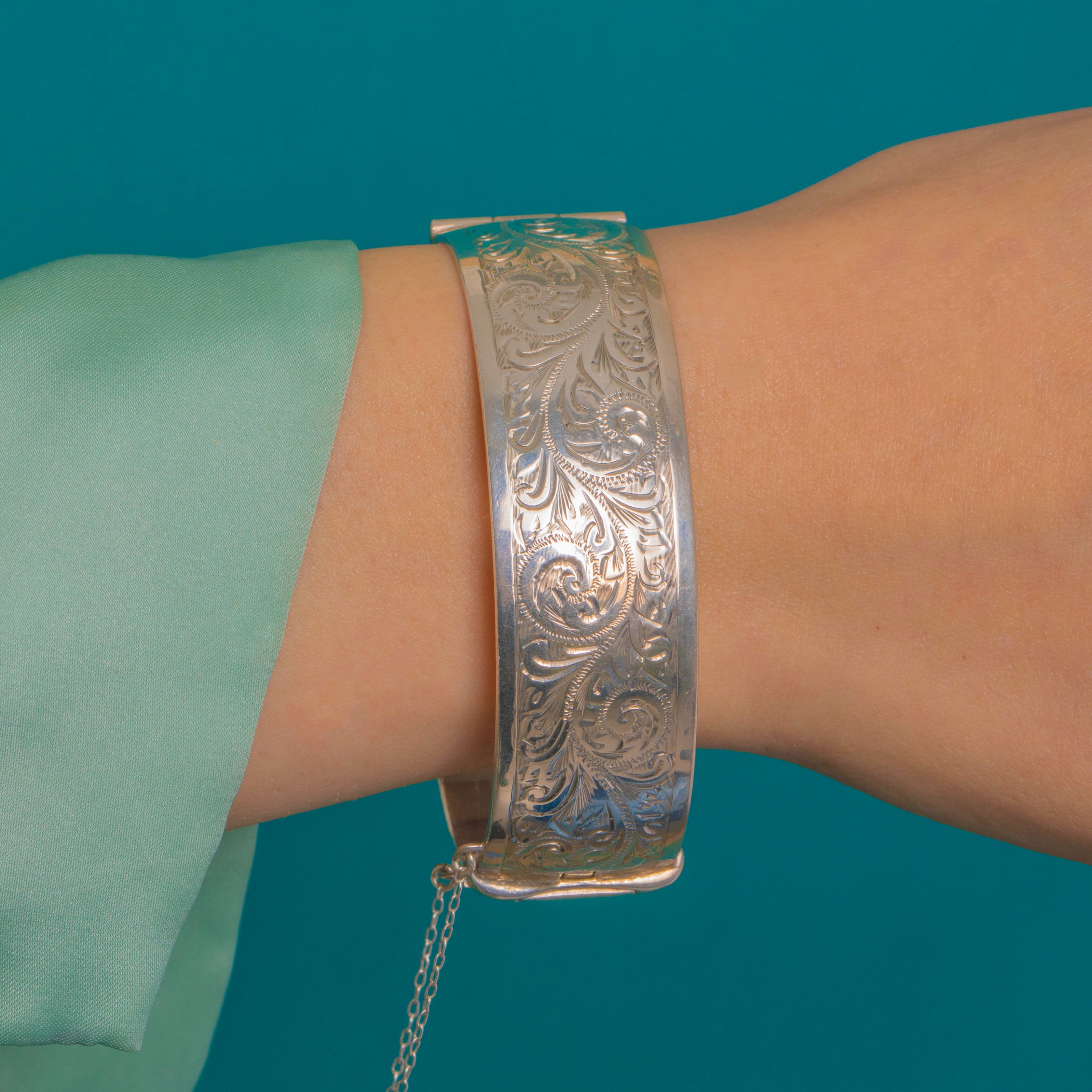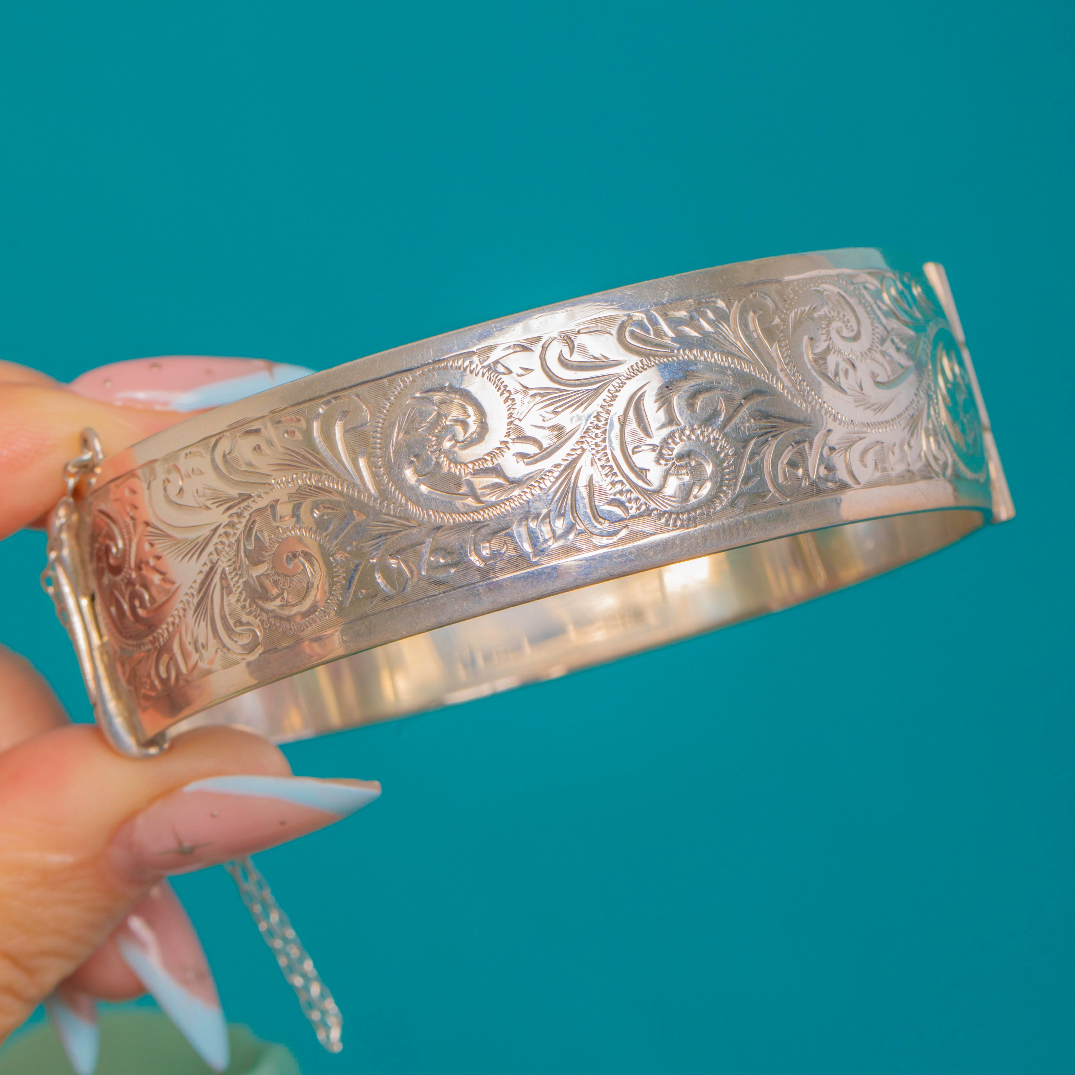 This Vintage 1973 Sterling Silver hinged bangle blends ornate engravings with sleek, modern lines. The front is beautifully bright-cut with foliate and scroll motifs framed by smooth borders, while gleaming plain sections catch the light for a bold, cuff presence.