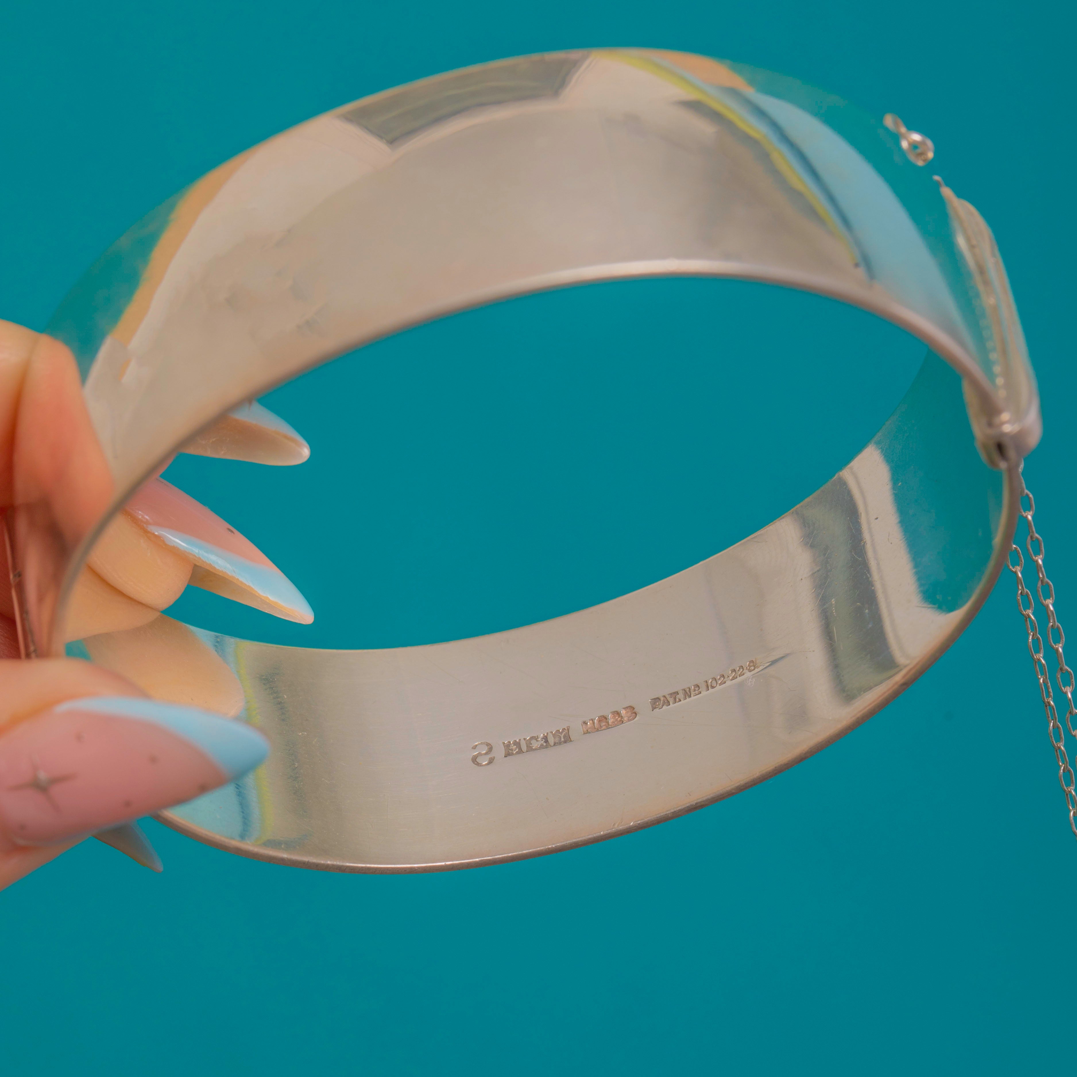 Its lightly domed profile feels refined and tactile on the wrist. A secure box clasp with push-tab release and original safety chain offers confident wear. Finished with a high-shine polish and crisp detailing, it channels the elegance of Victorian engraving in a chic mid-century silhouette.
