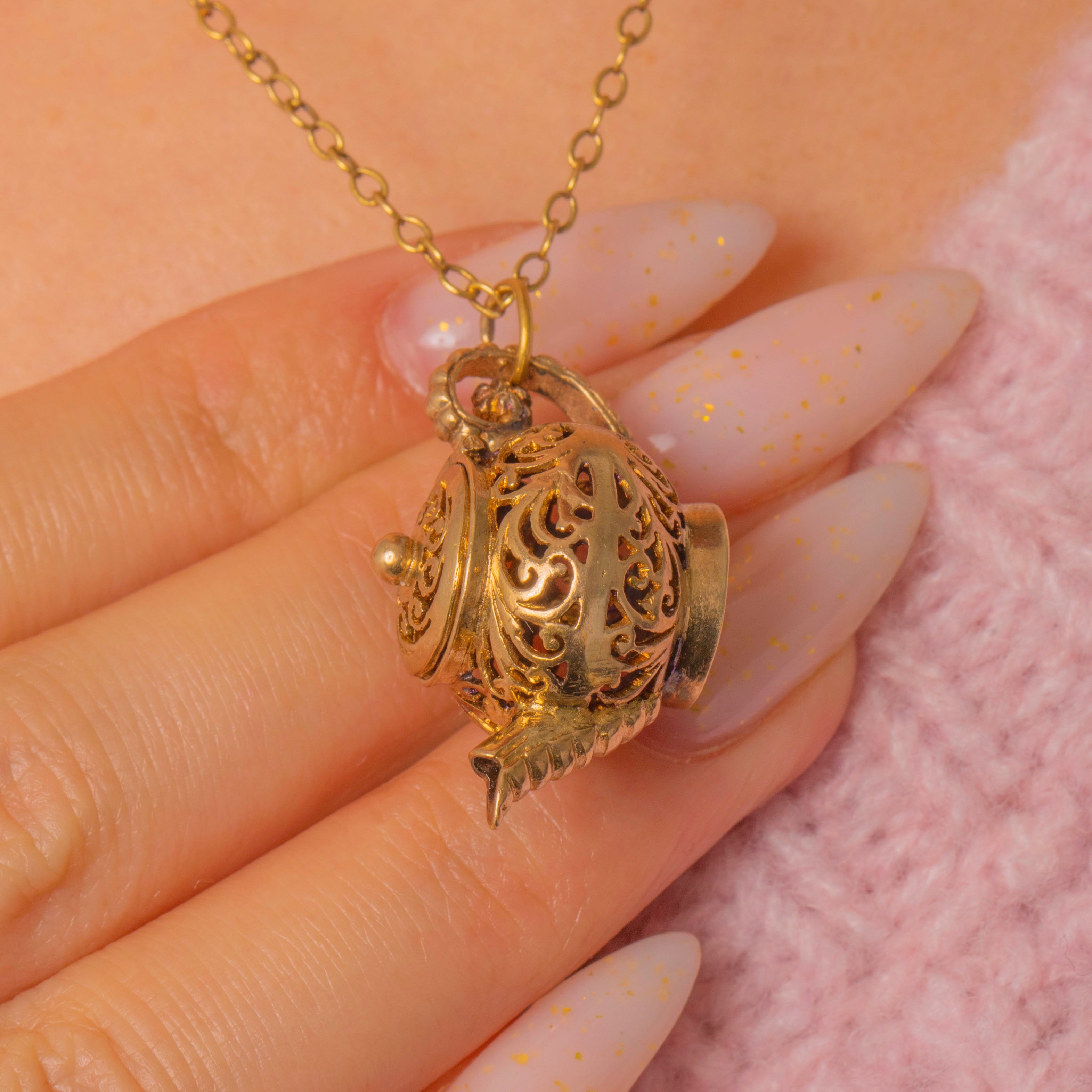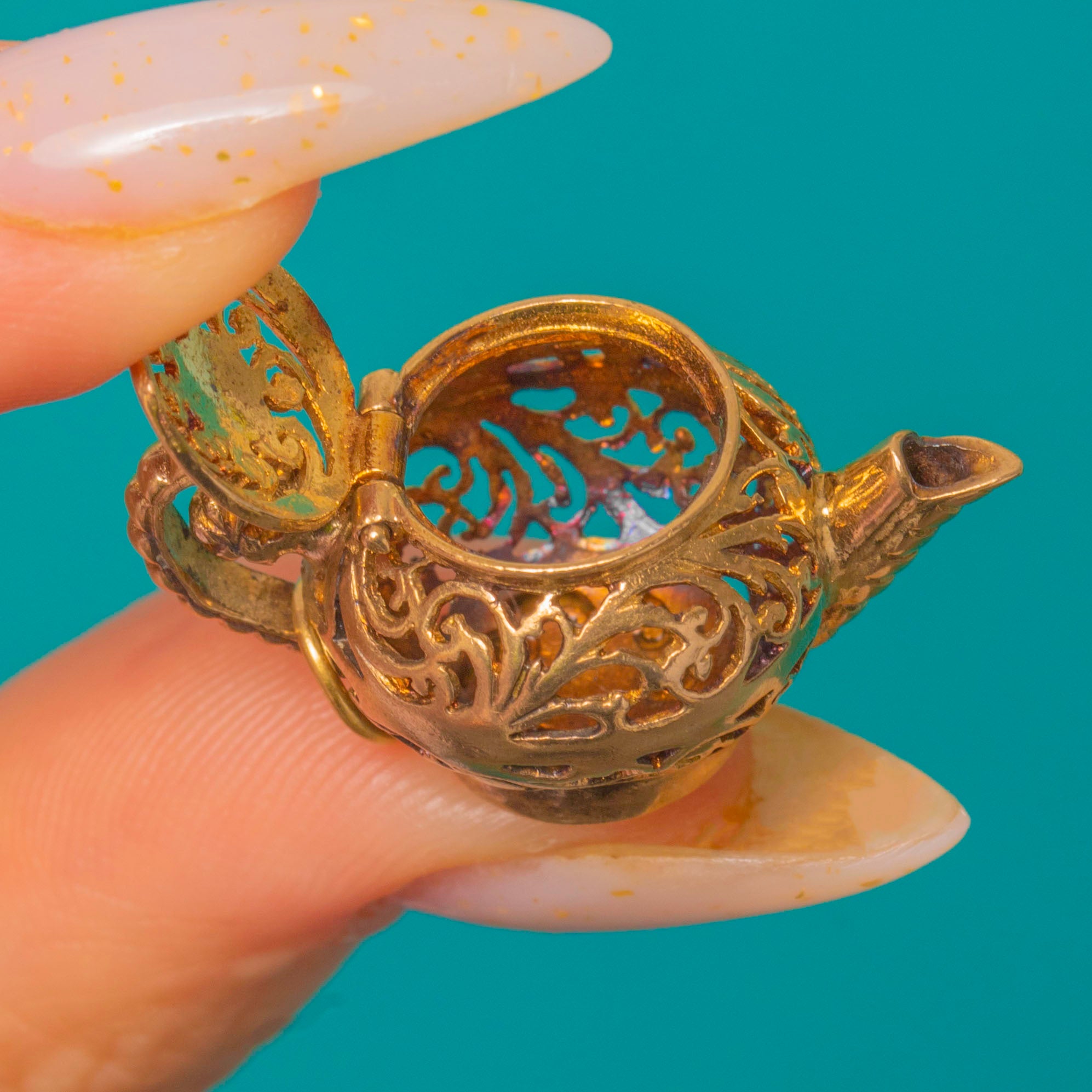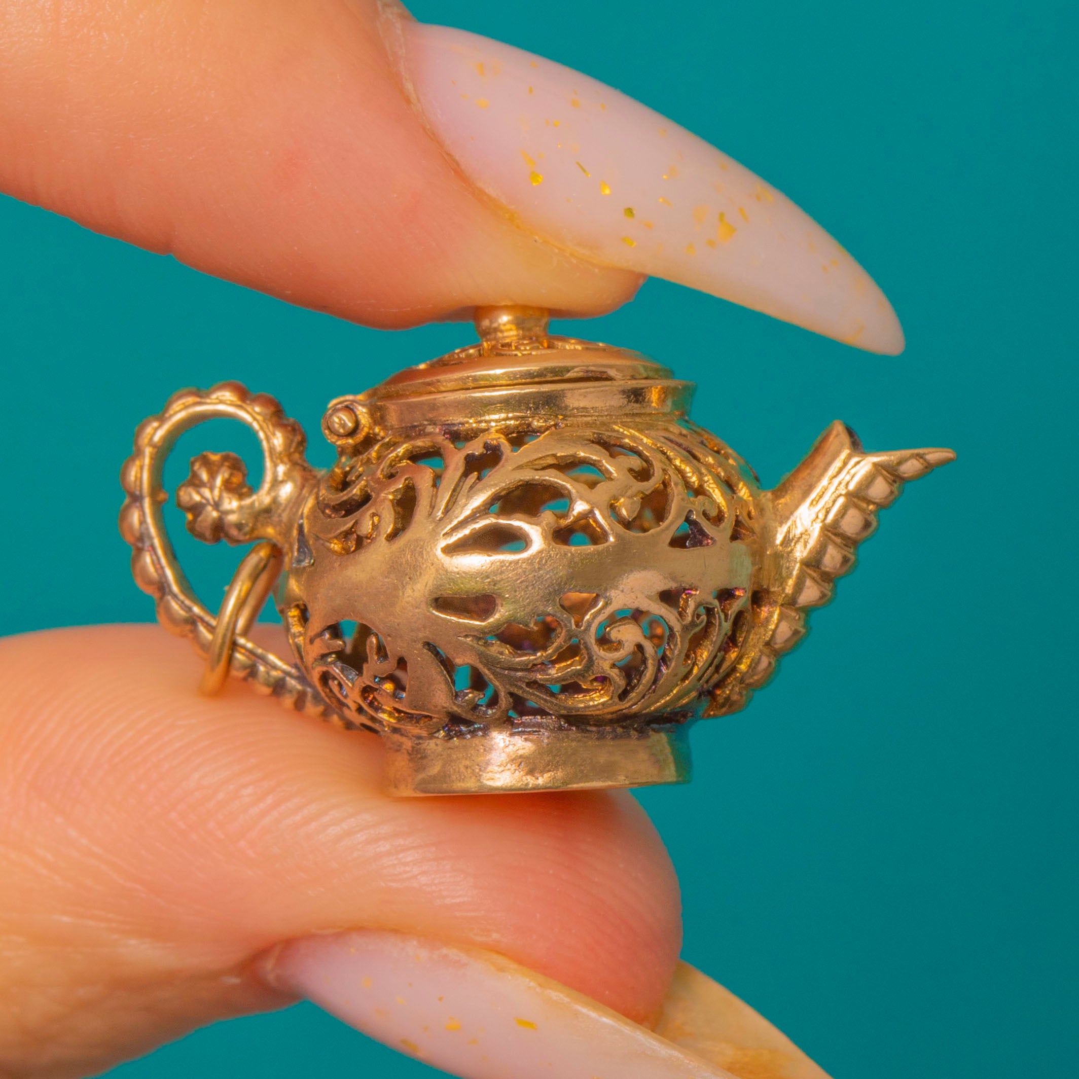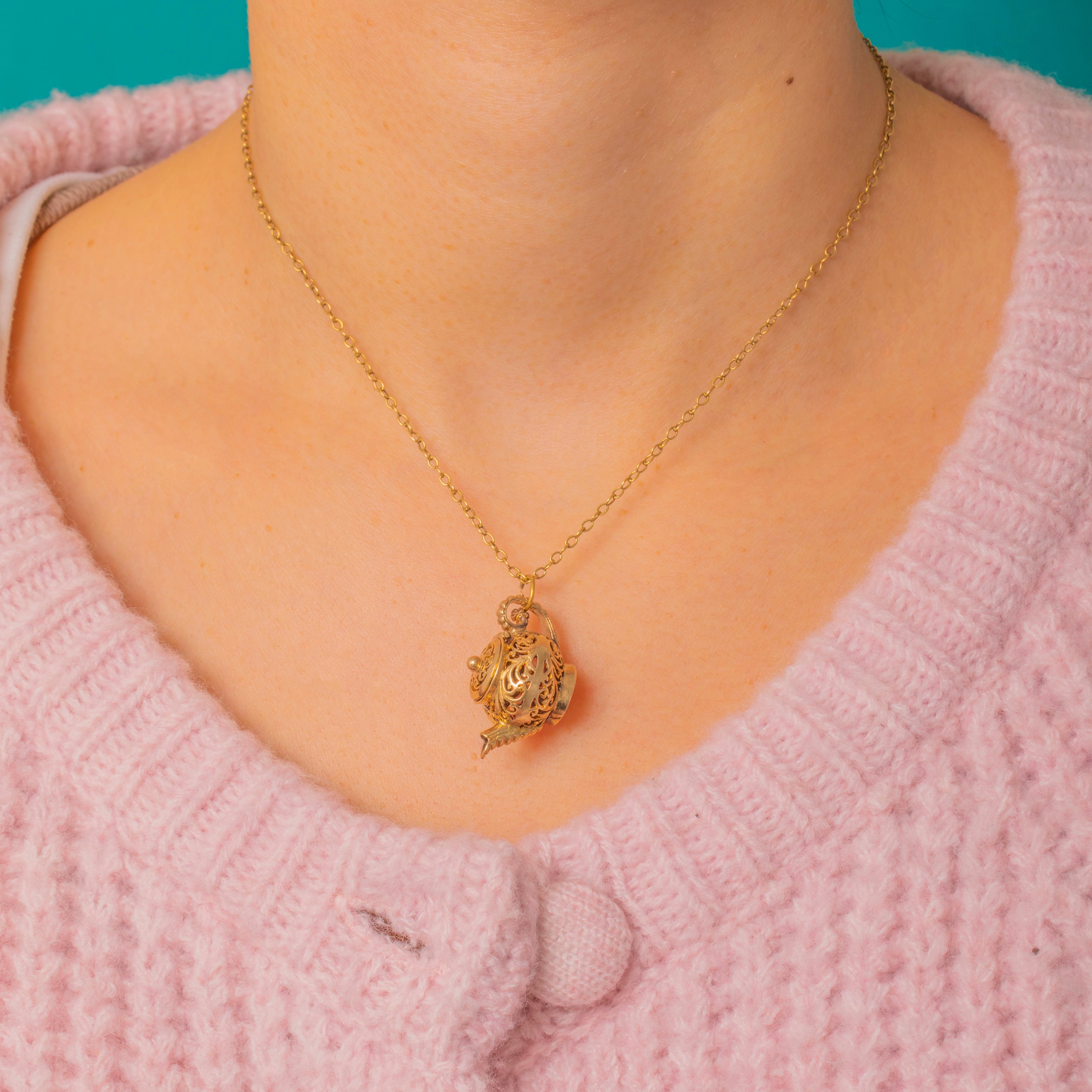A rare mid‑century charm fashioned as a miniature teapot / pomander in warm 9ct Gold. Dense pierced foliate and scrolling openwork wraps the hollow, multi‑part body, finished with a working hinged lid, a realistic spout, looped handle and a beaded finial; the effect is ornate, delicate and quietly romantic.