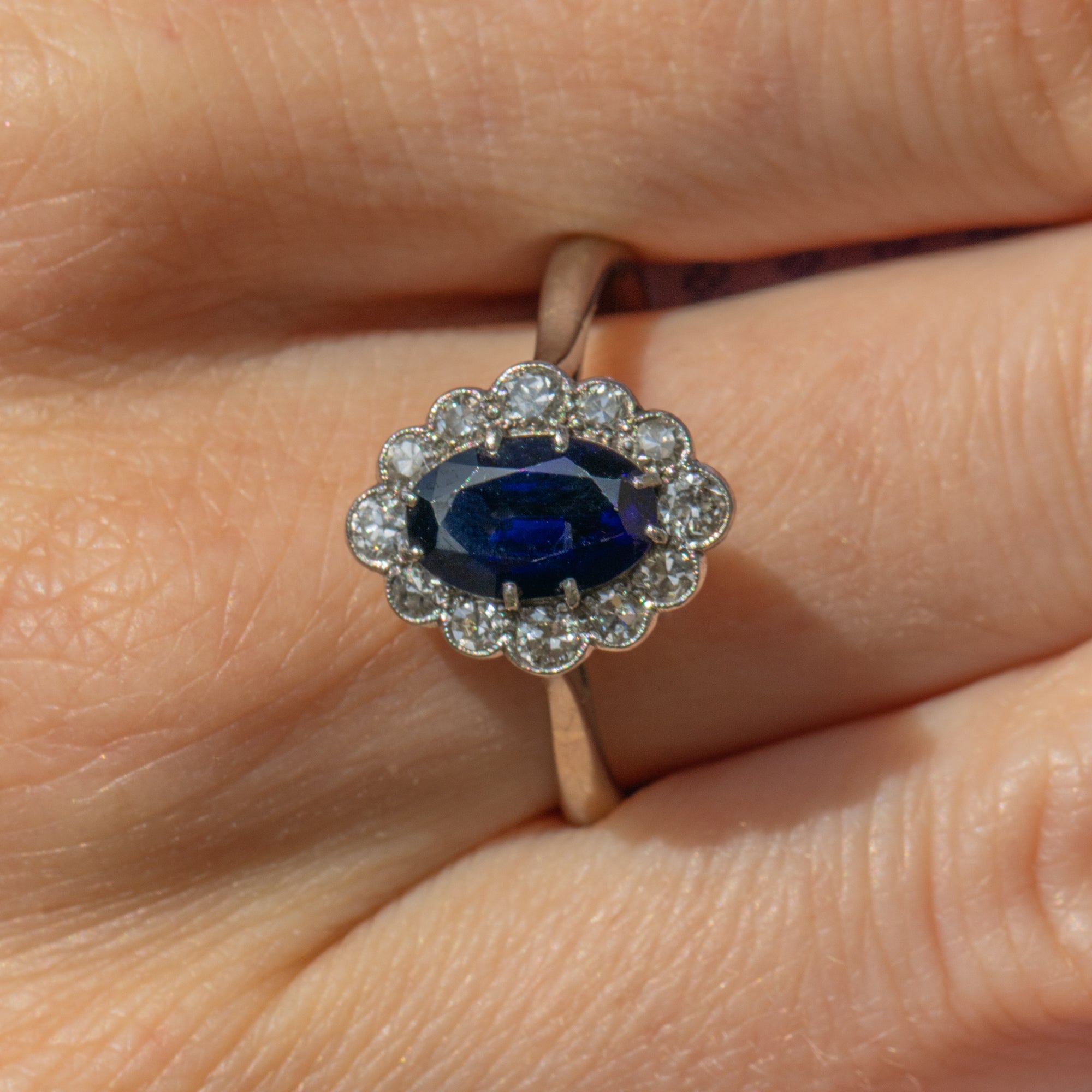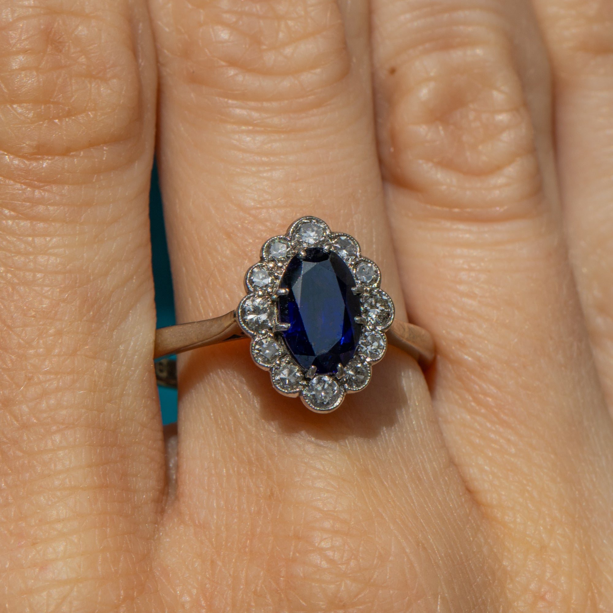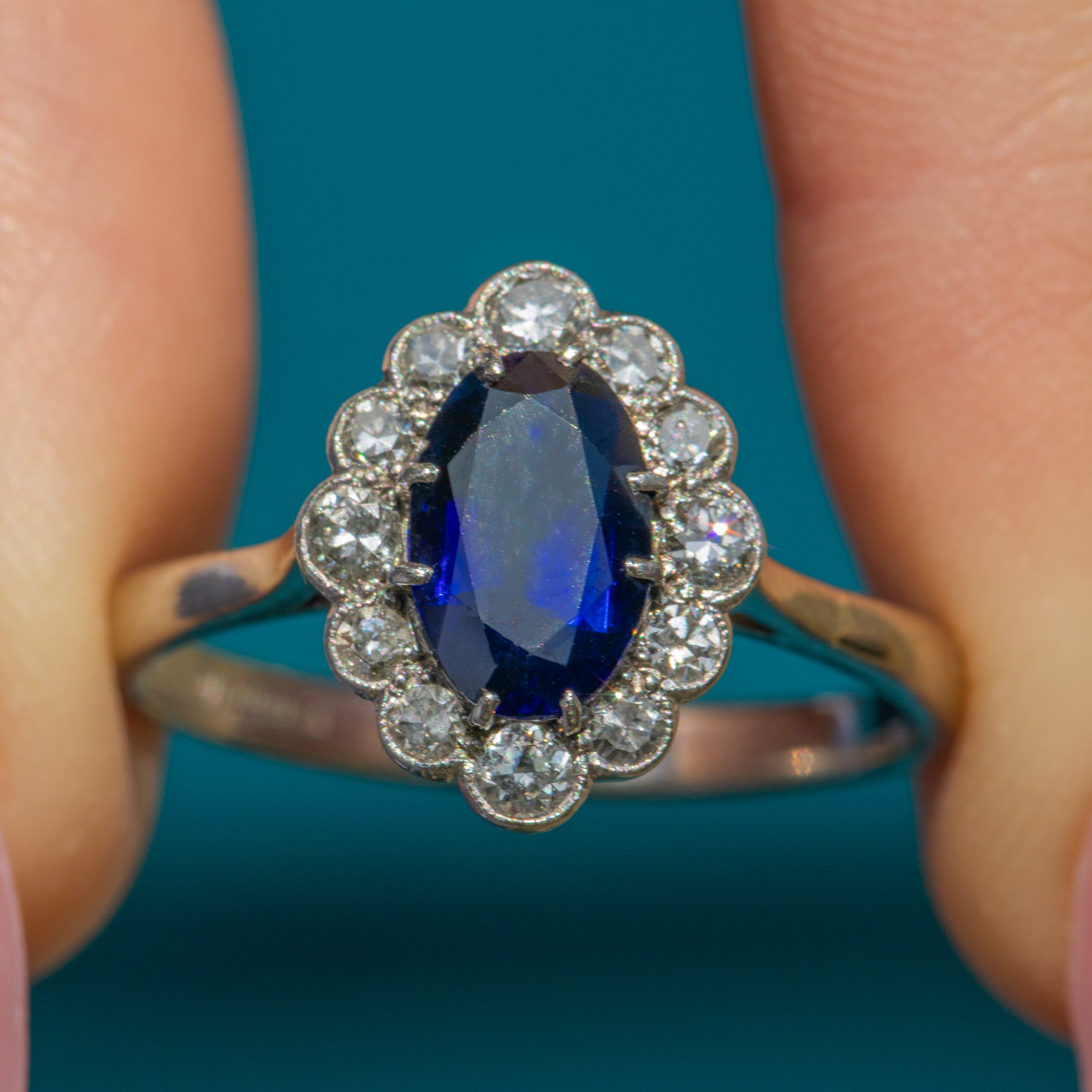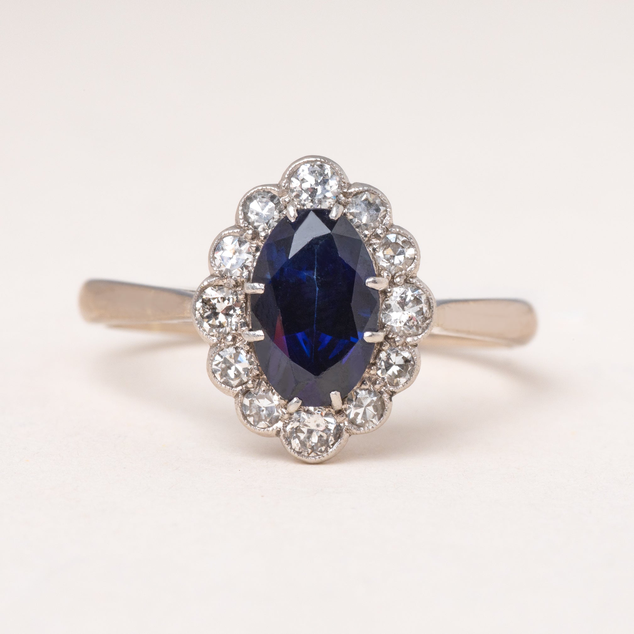VERY GOOD TO EXCELLENT. This Edwardian natural Sapphire & Diamond oval cluster ring is in fabulous condition. The ring has a securely set Sapphire with a wonderful deep blue hue. The Diamonds are a wonderful addition, and although some of them have natural inclusions present, they are each characterful in their own right. The ring band has one resize mark visible towards the back of the band, but it is smooth and cannot be seen when worn.