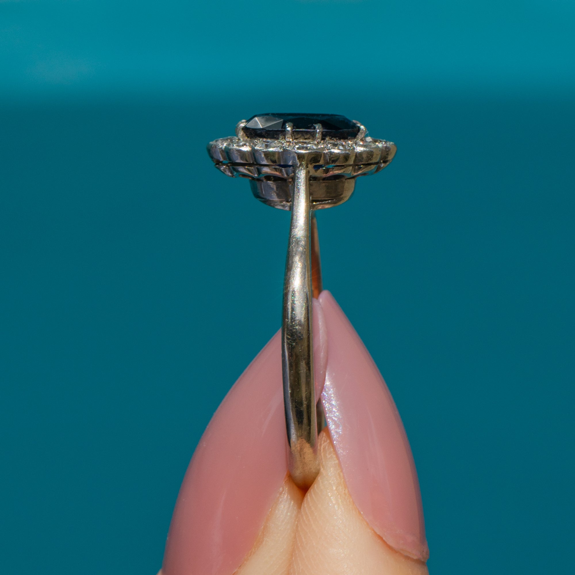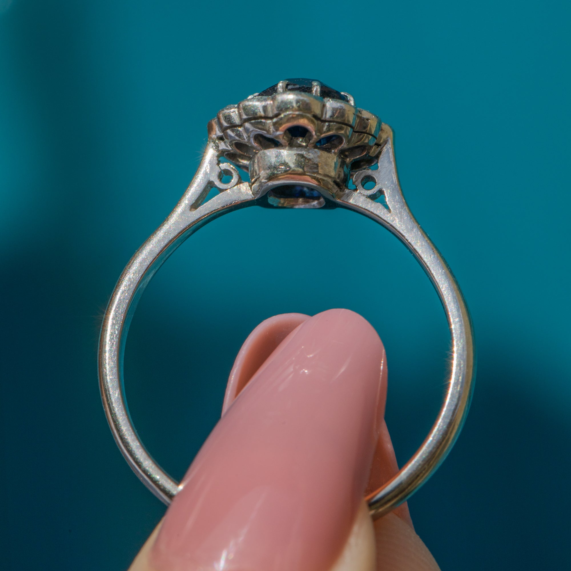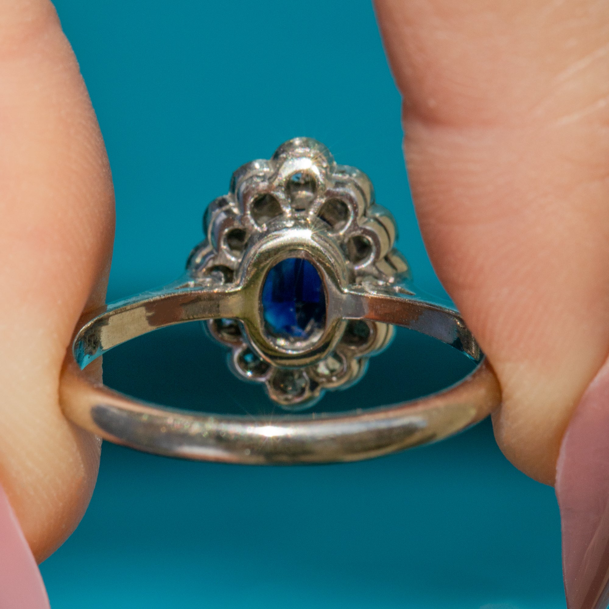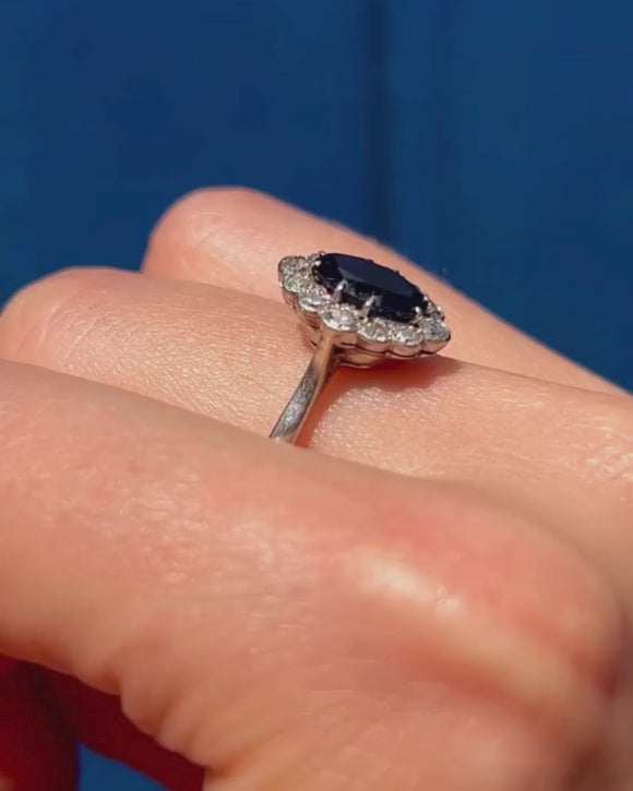 VERY GOOD TO EXCELLENT. This Edwardian natural Sapphire & Diamond oval cluster ring is in fabulous condition. The ring has a securely set Sapphire with a wonderful deep blue hue. The Diamonds are a wonderful addition, and although some of them have natural inclusions present, they are each characterful in their own right. The ring band has one resize mark visible towards the back of the band, but it is smooth and cannot be seen when worn.