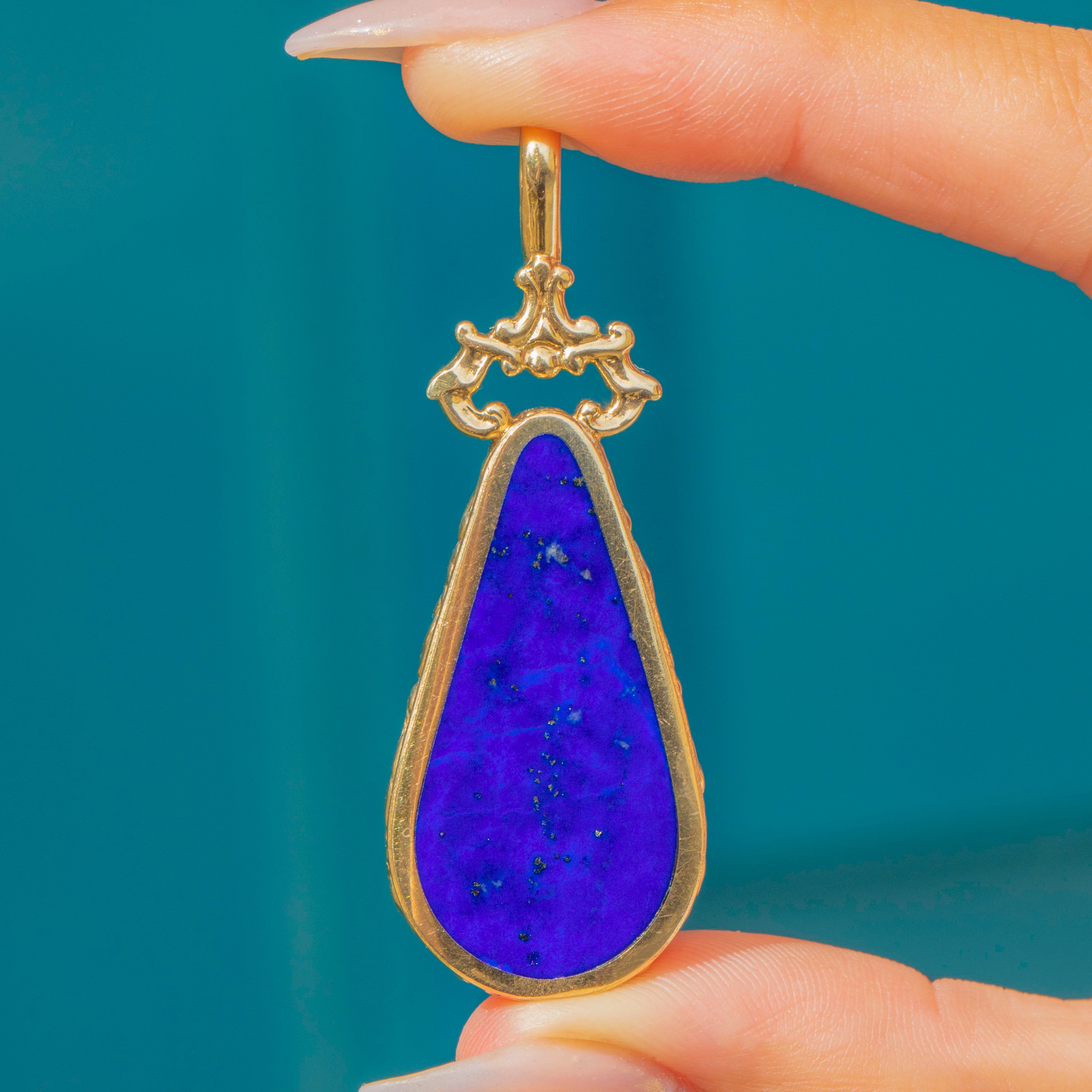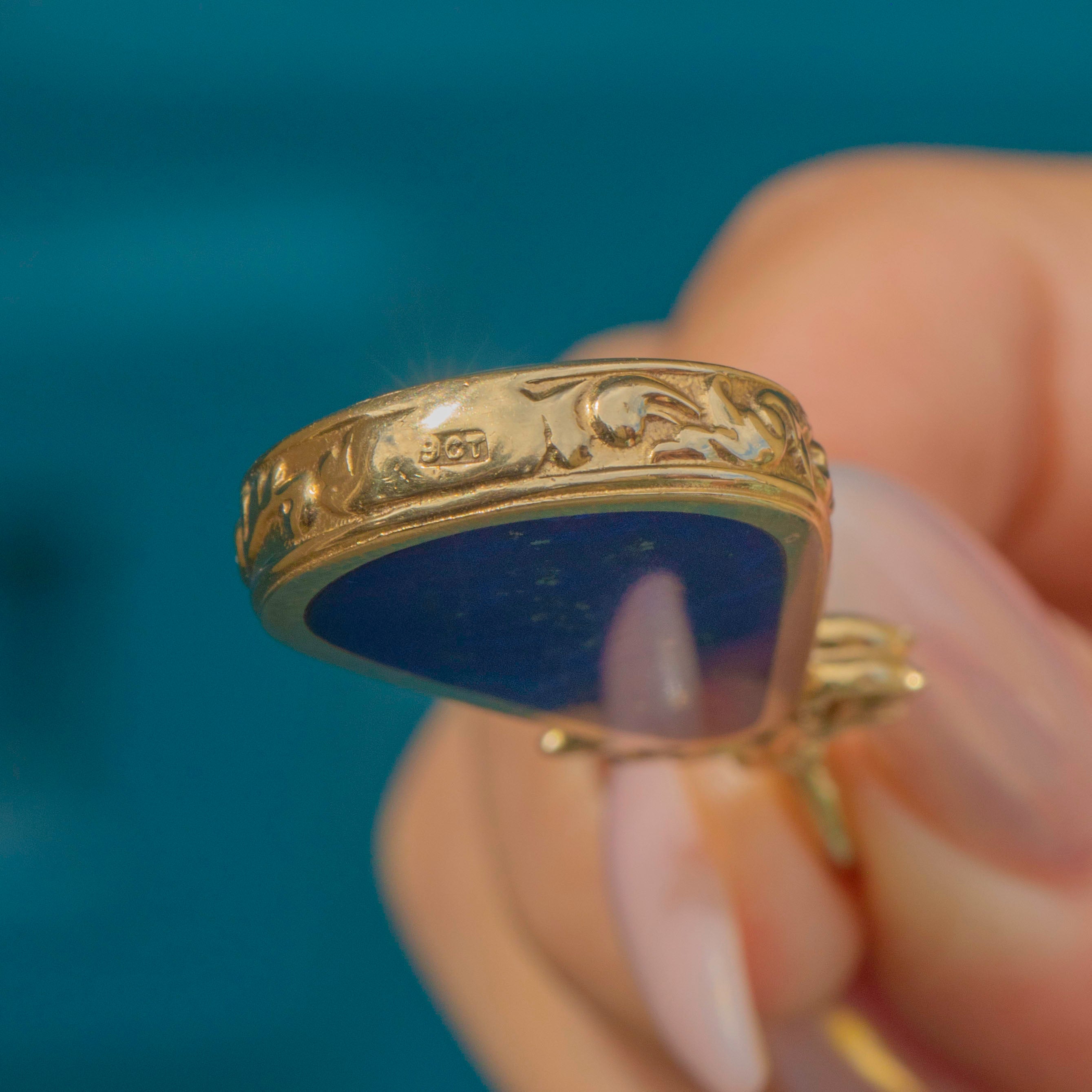 This striking Vintage pendant features a teardrop design set with Opal and Lapis Lazuli, framed in solid 9ct Gold with a fine repousse border. The Opal displays lively colour play that contrasts beautifully with the deep blue of the gold-flecked Lapis, creating a bold and elegant statement.