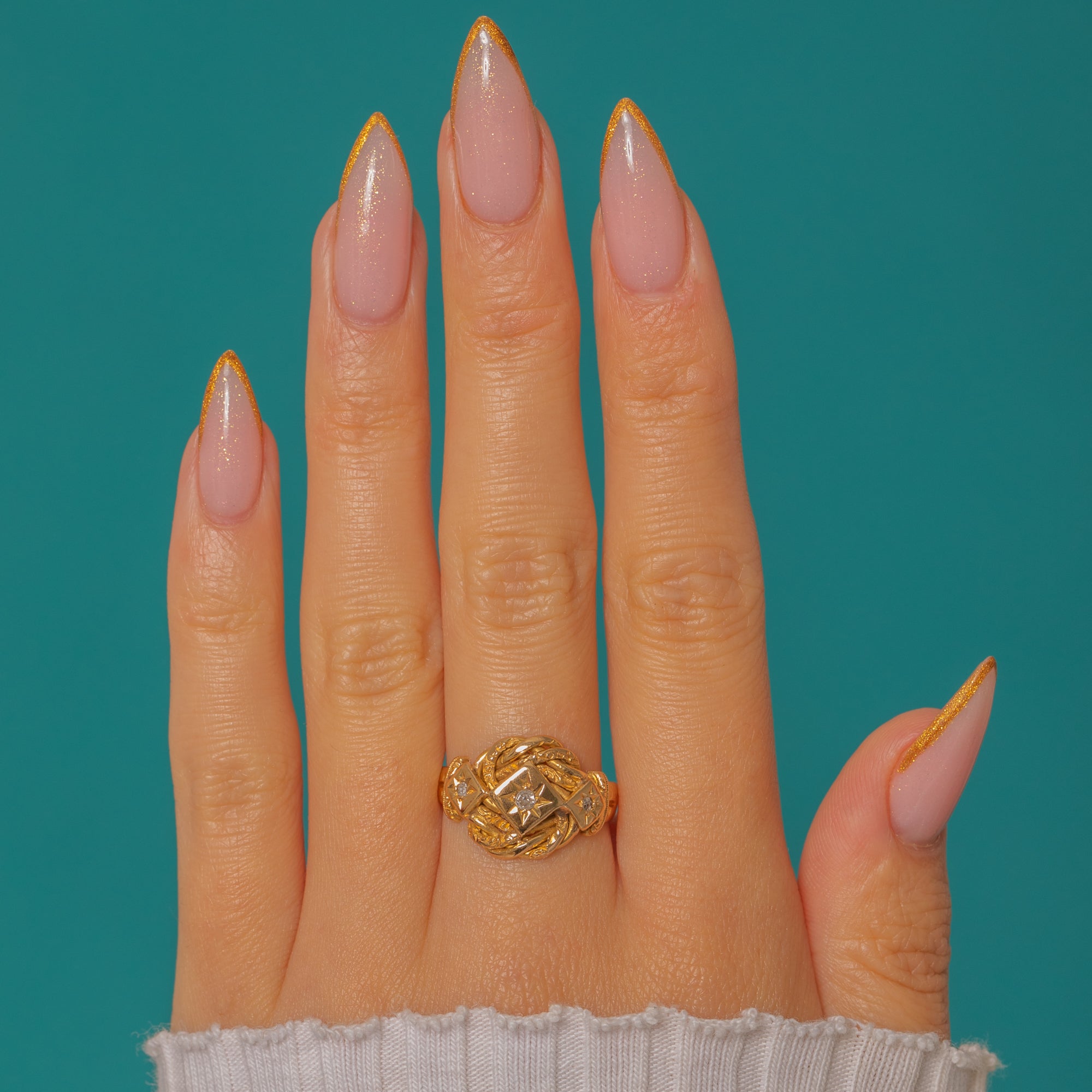 This romantic antique knot ring is a fine Post-Edwardian treasure, crafted in rich 18ct Gold and set with three twinkling antique Diamonds.
