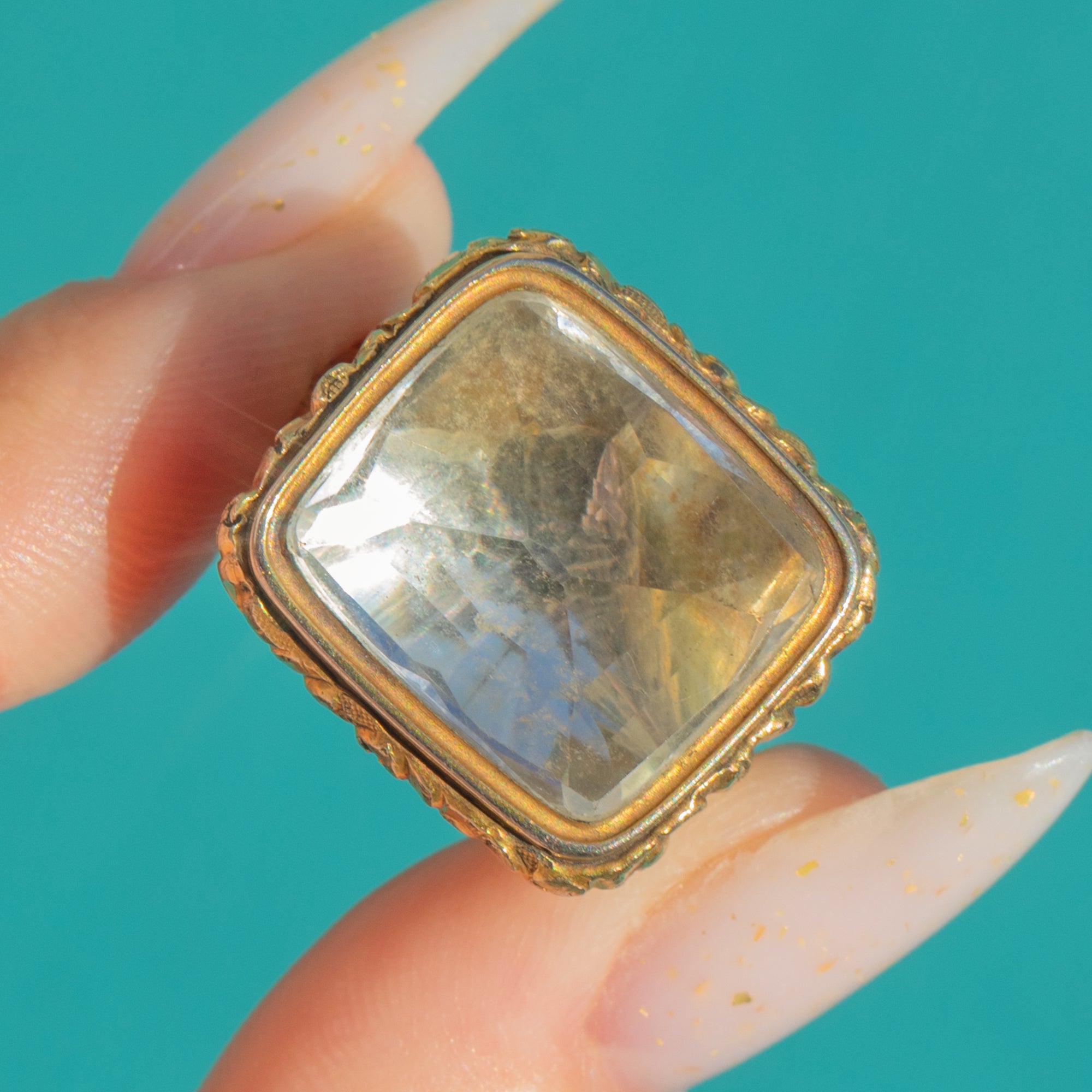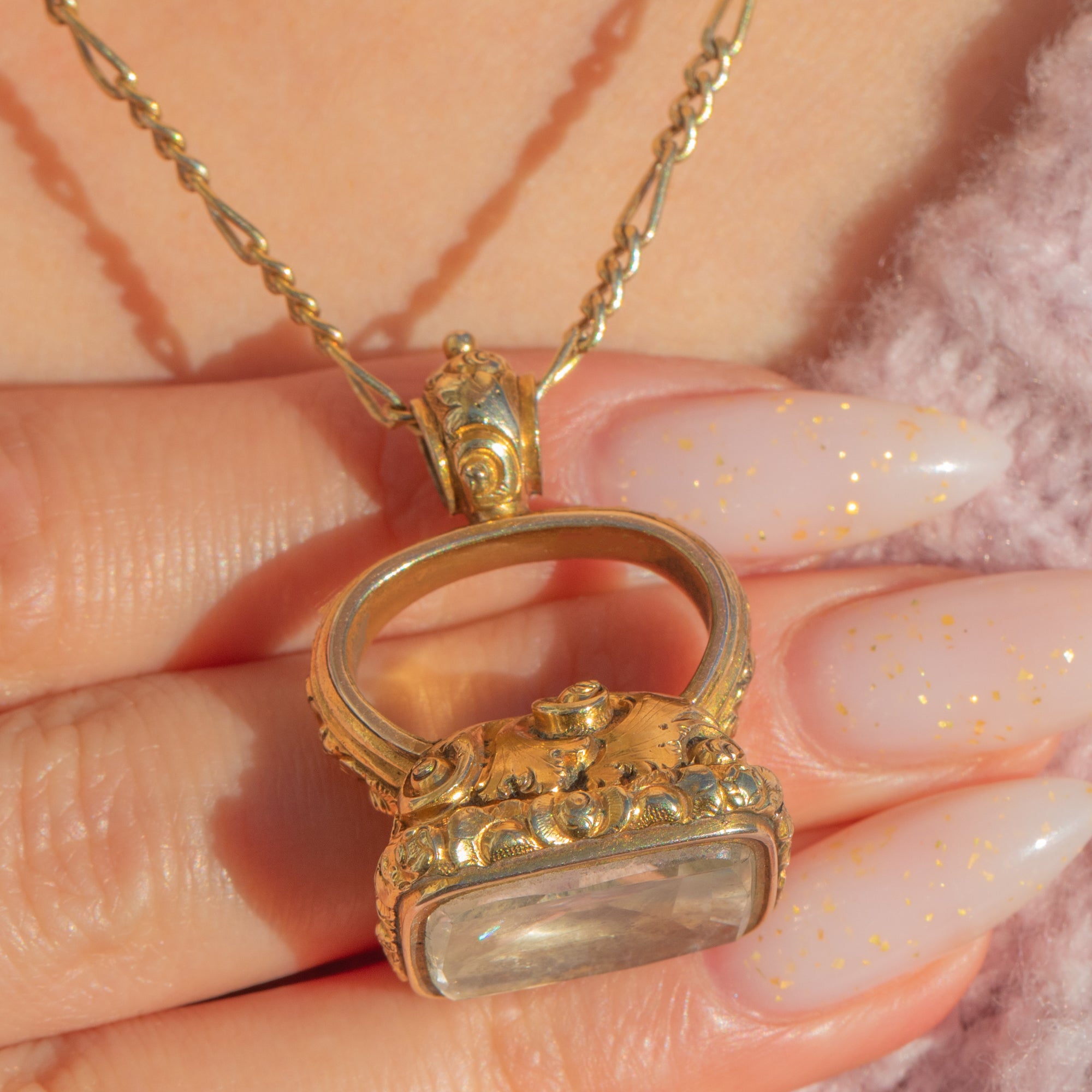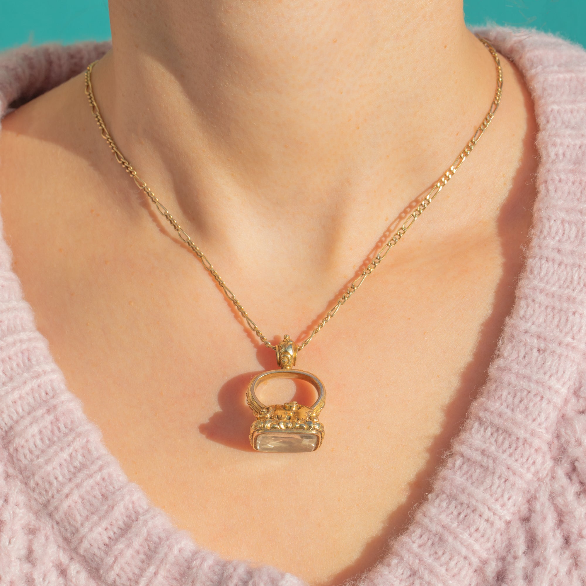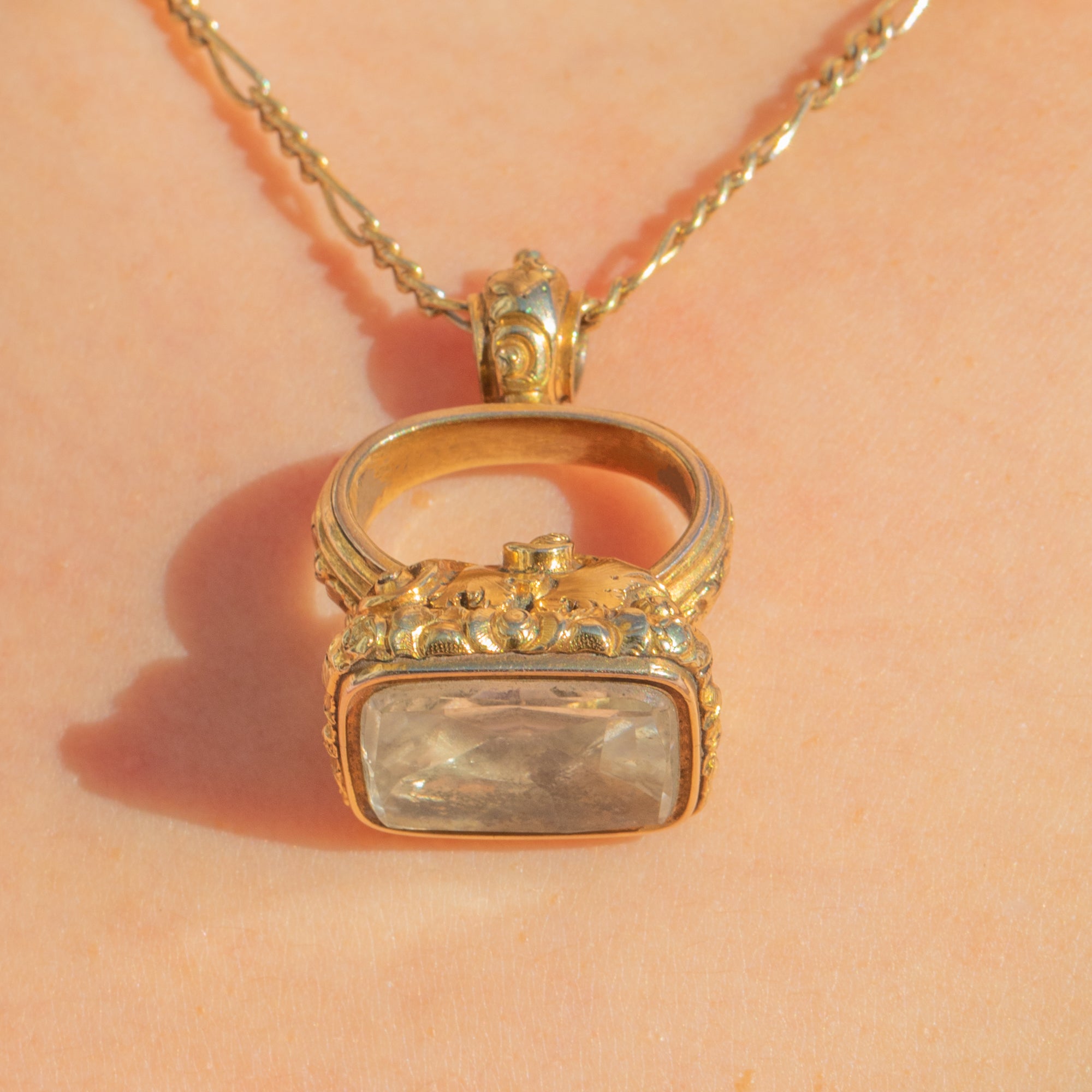 A pretty, champagne-hued Rock Crystal tablet sits proudly in a high, closed-back bezel, its soft, water-clear hue lending a luminous counterpoint to the ornate metalwork. Finished with a fixed bail for effortless wear, this is a characterful, decorative pendant that layers beautifully and feels wonderfully evocative of 19th-century style.