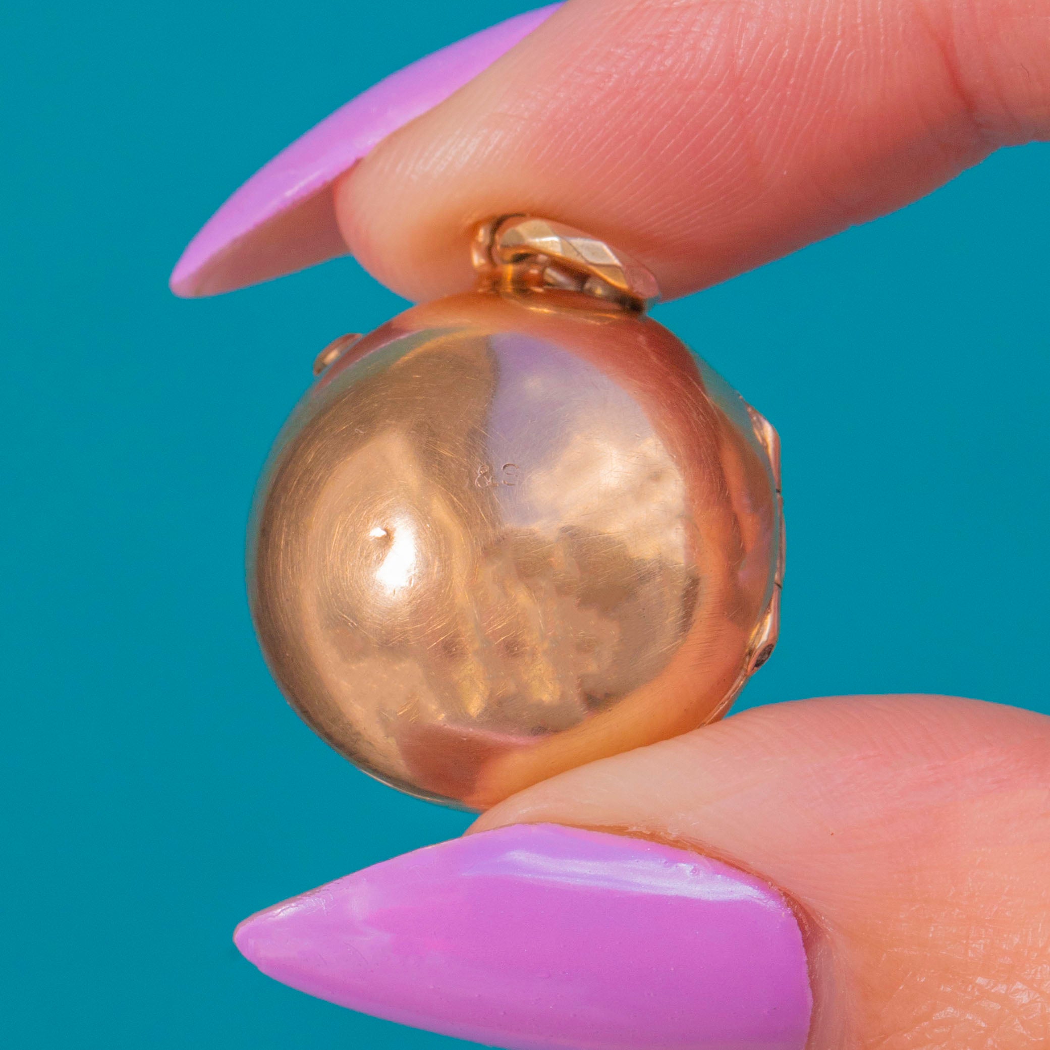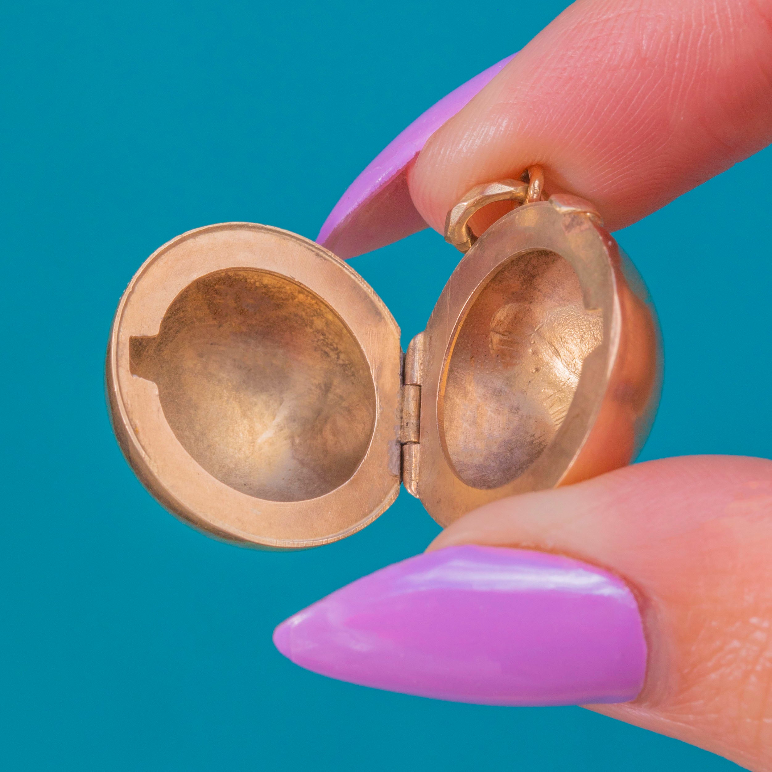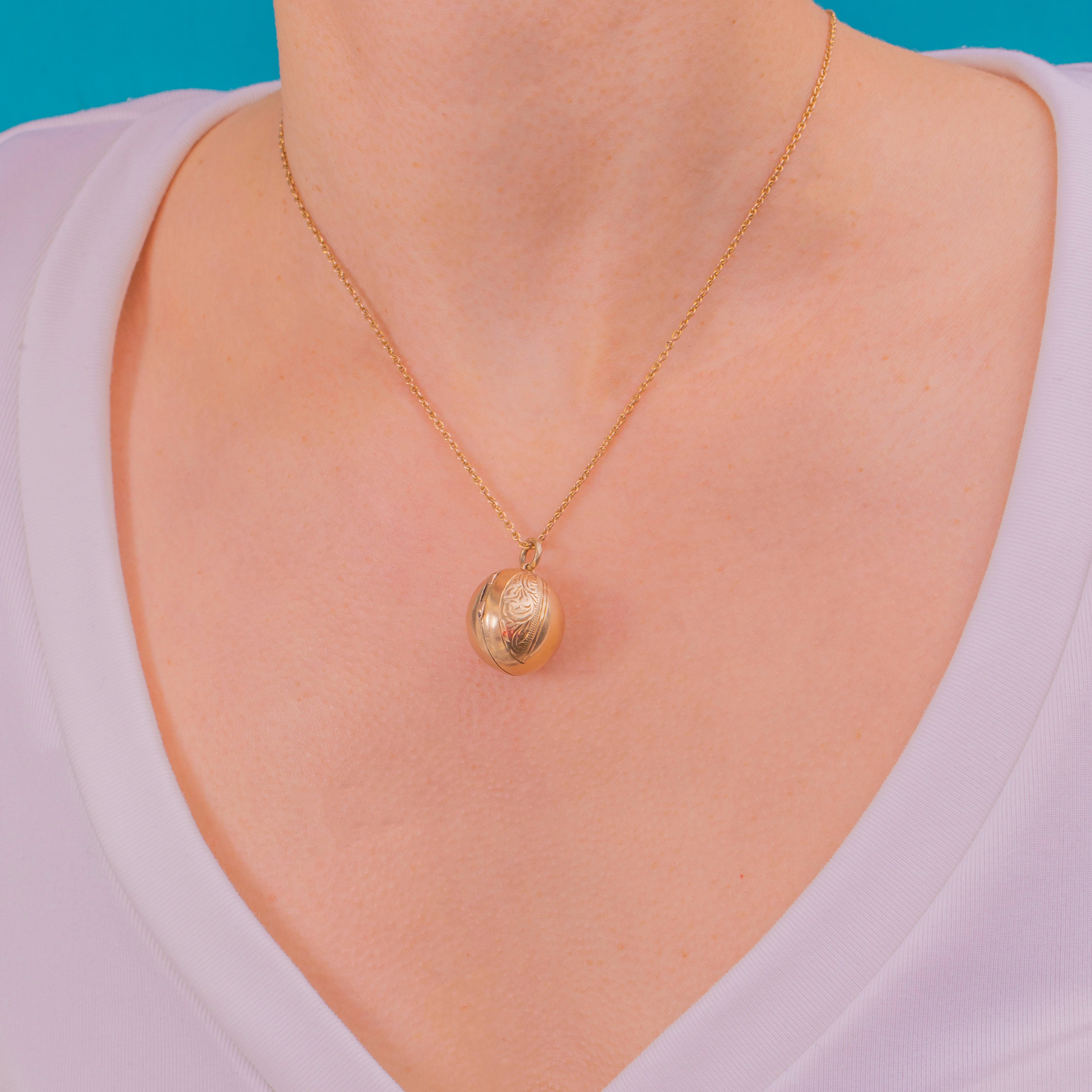 A dreamy little Victorian orb locket crafted in warm 9ct Gold, this petite pendant pairs glossy, domed contours with a narrow chased foliate panel framed by a fine rope border. The contrast between the polished plane and the delicate engravings gives it a quietly romantic, timeless feel.