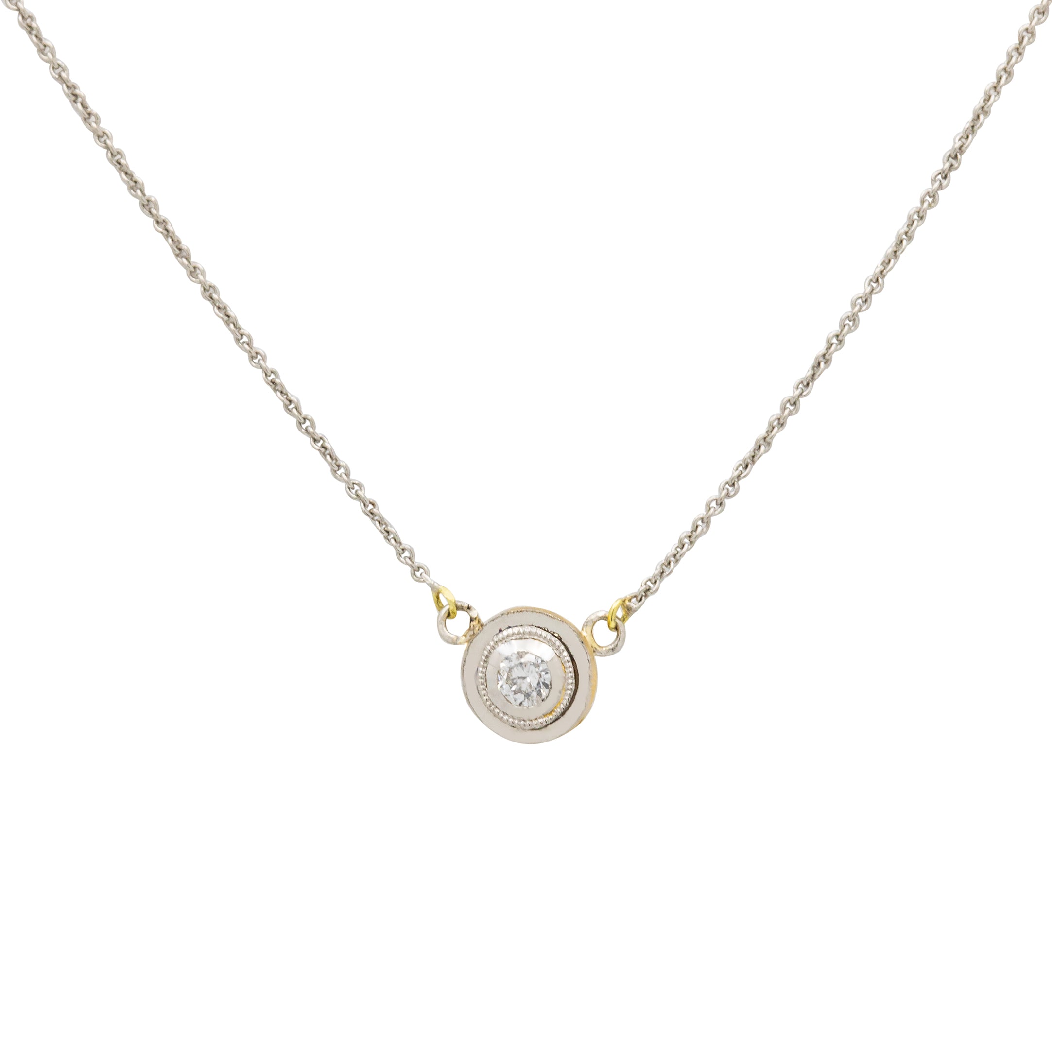 EXCELLENT: This Platinum Diamond integral necklace is offered in excellent condition. The Diamond is sparkly and securely set within its setting, free from fleabites or abrasions. The 18ct Gold and the Platinum are lustrously shiny and free from dents or signs of wear. The necklace is lightweight and complete with a secure clasp, allowing you to comfortably wear it all day long!