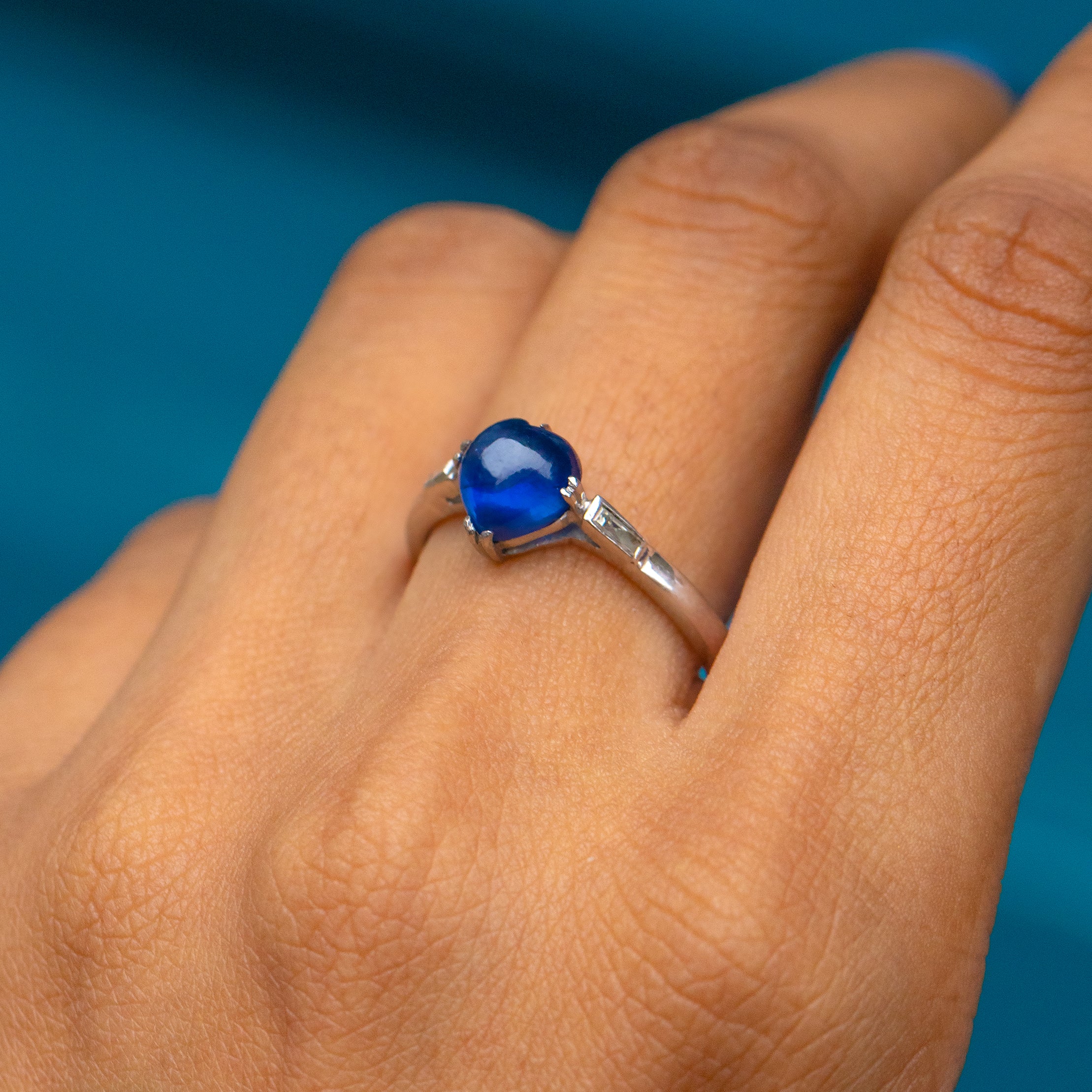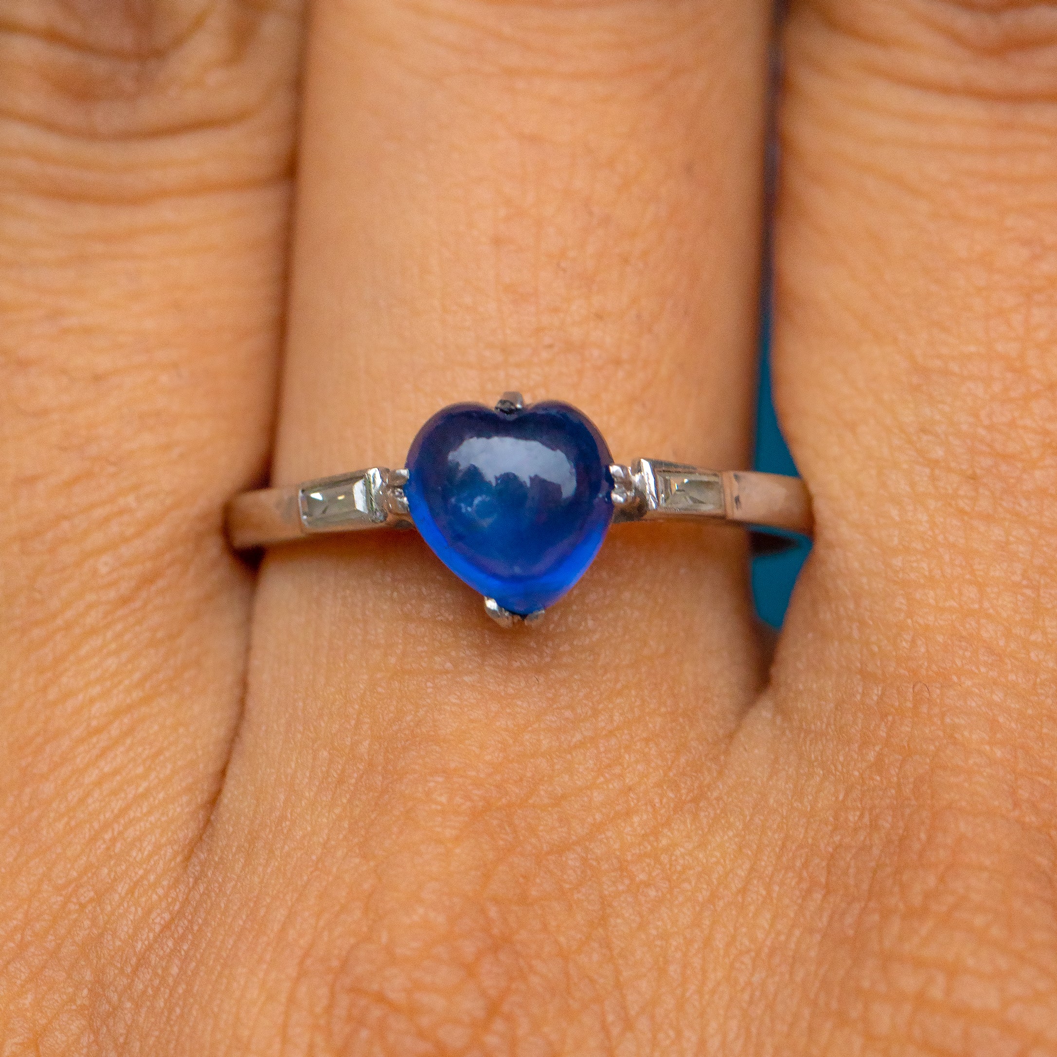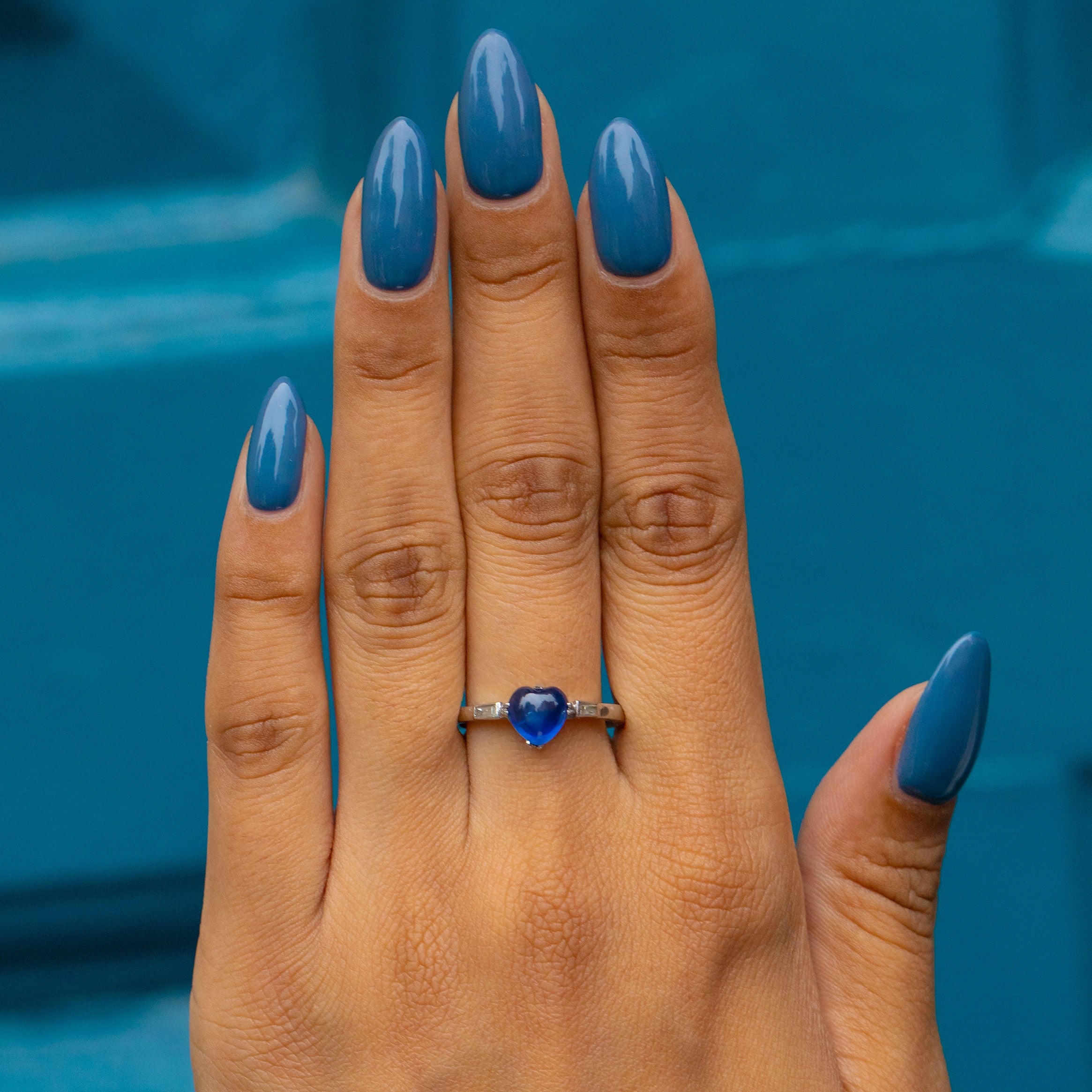 Where to start with this GARRARDS Platinum Sapphire heart cabochon and Diamond ring! First and foremost, it's hard to resist talking about her consuming 1.50ct Sapphire formed into a dainty heart with a smooth cabochon finish.