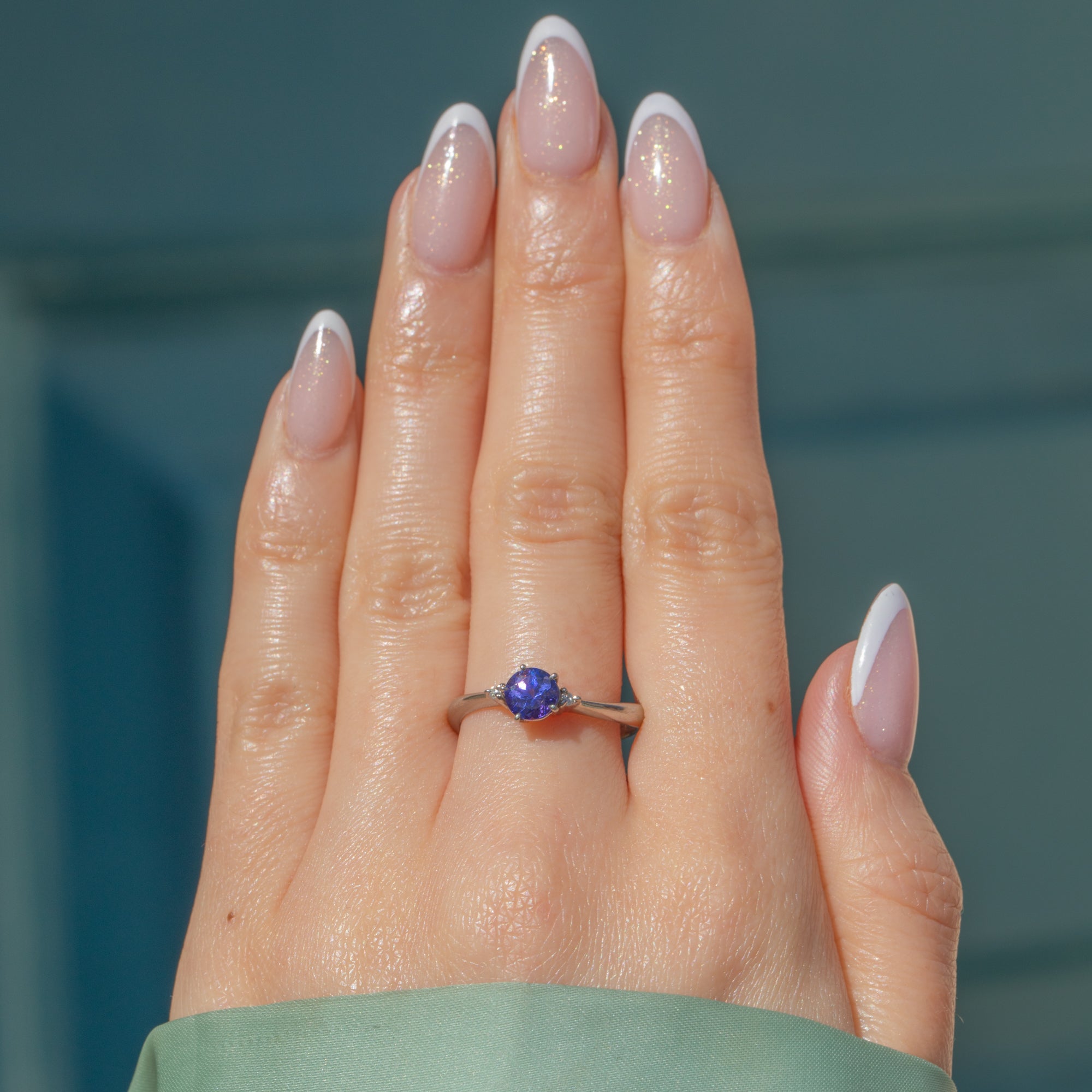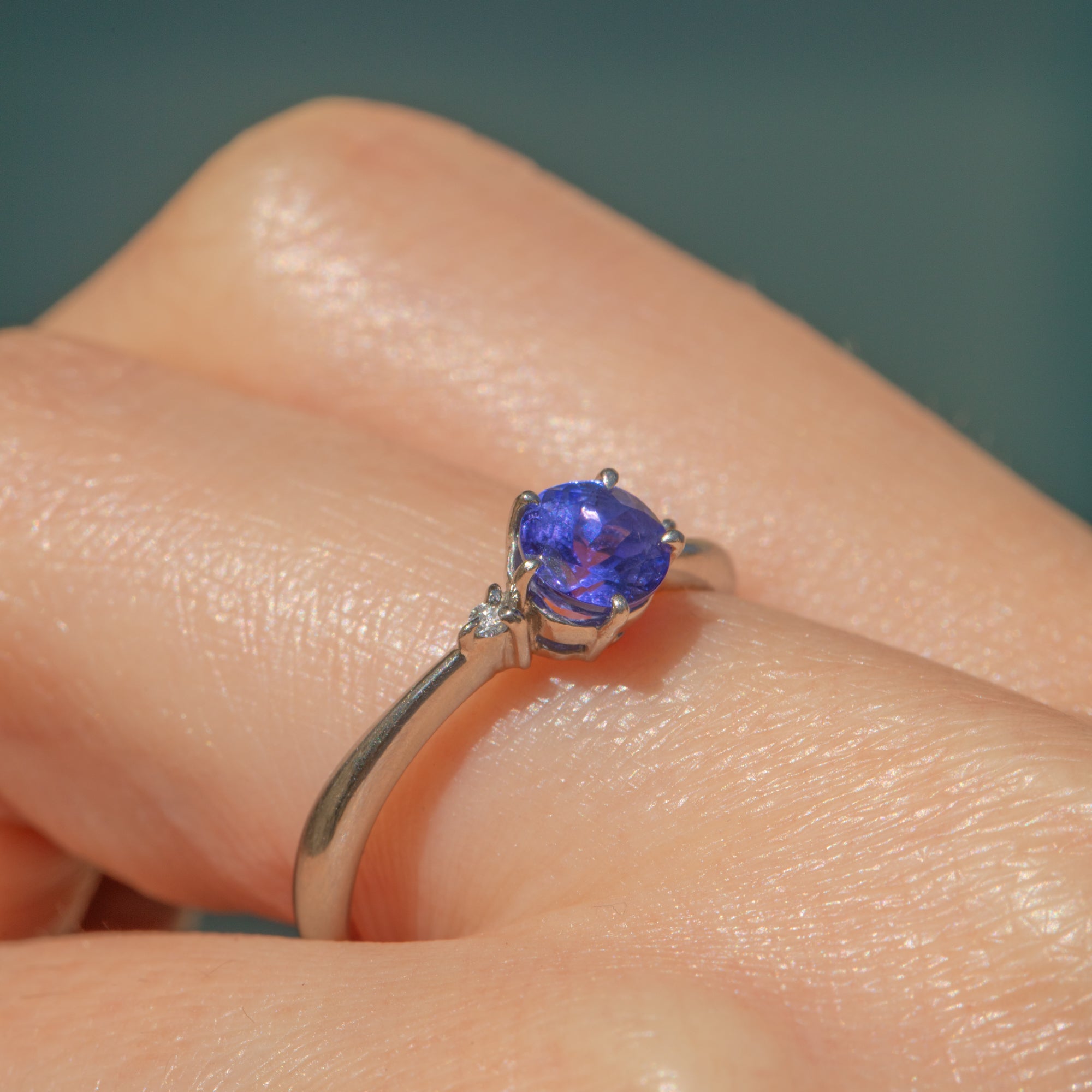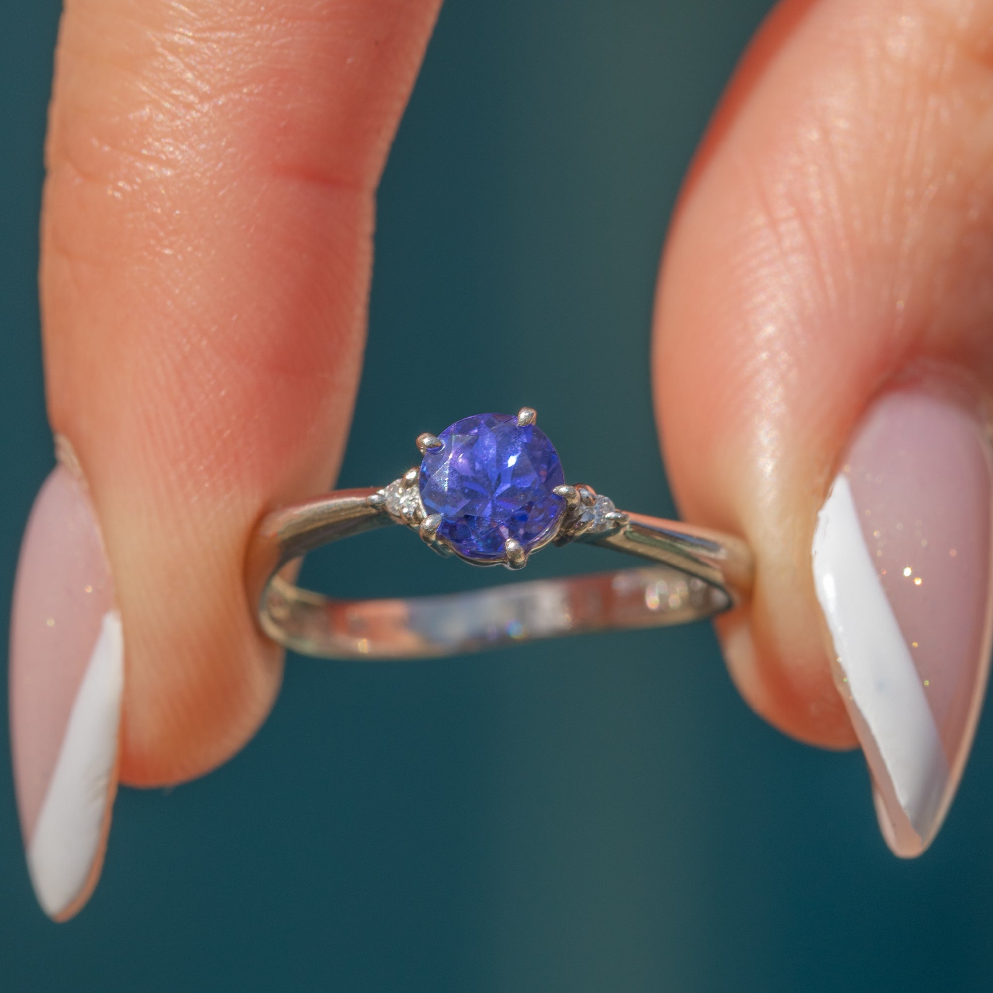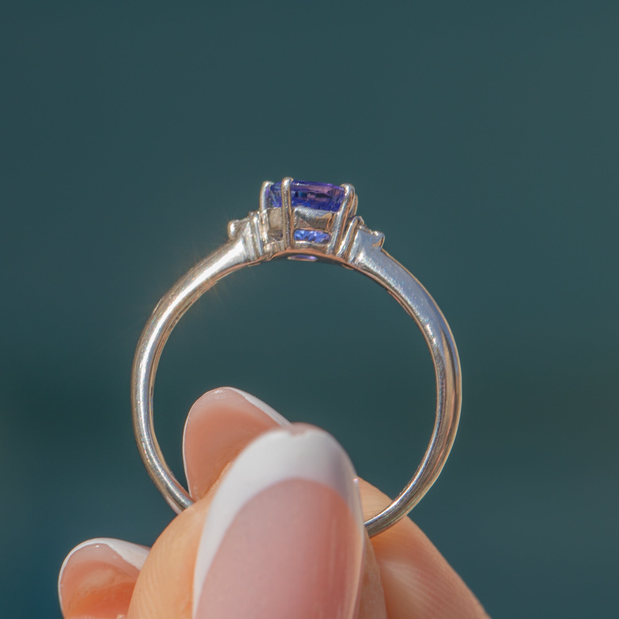 In her centre sits a vibrant 0.68ct Tanzanite, faceted wonderfully and radiating deep cerulean hues. She is flanked by scintillating Diamonds and finished with beautifully glossy Platinum settings. Her band is complete with a subtle wave, giving this sophisticated piece added character.