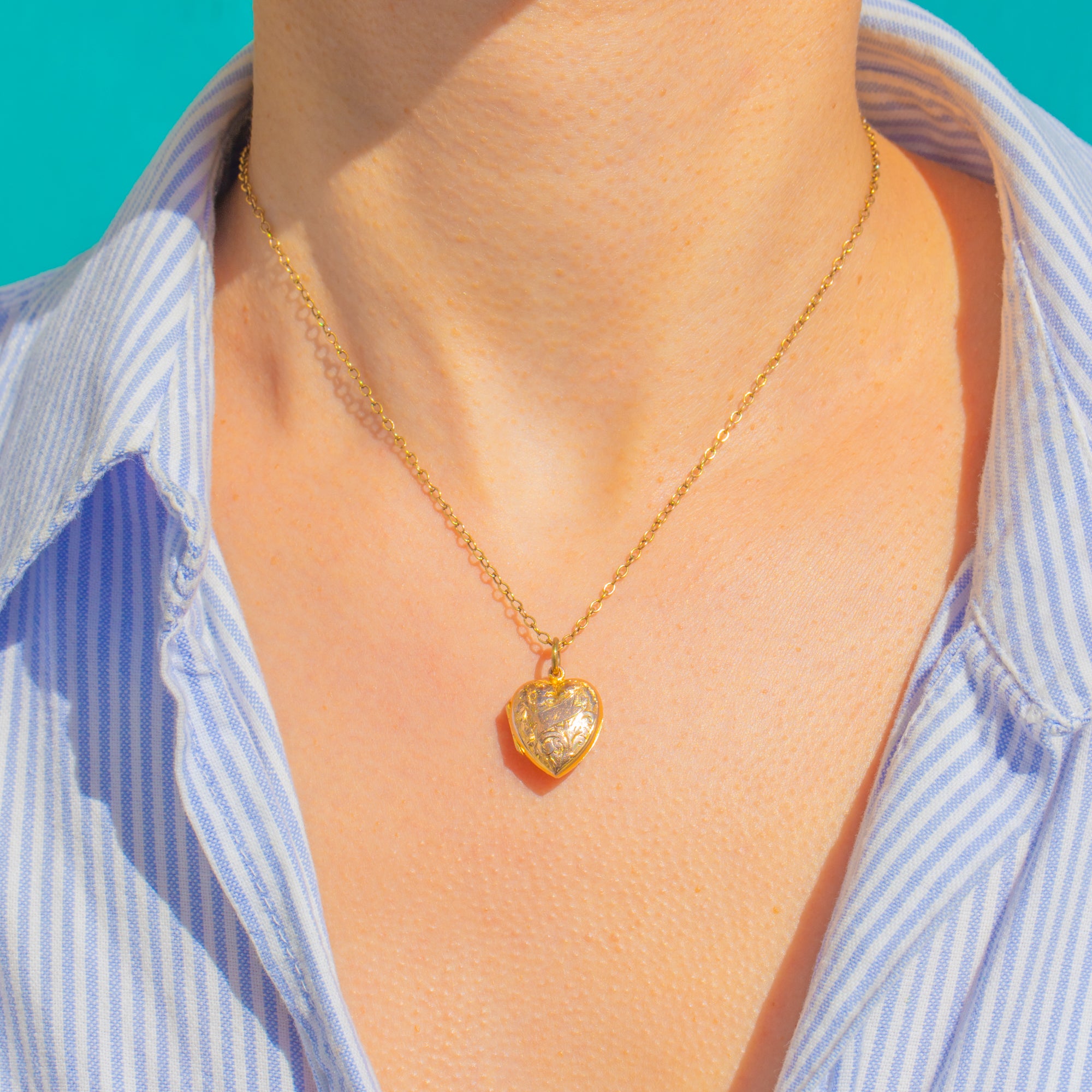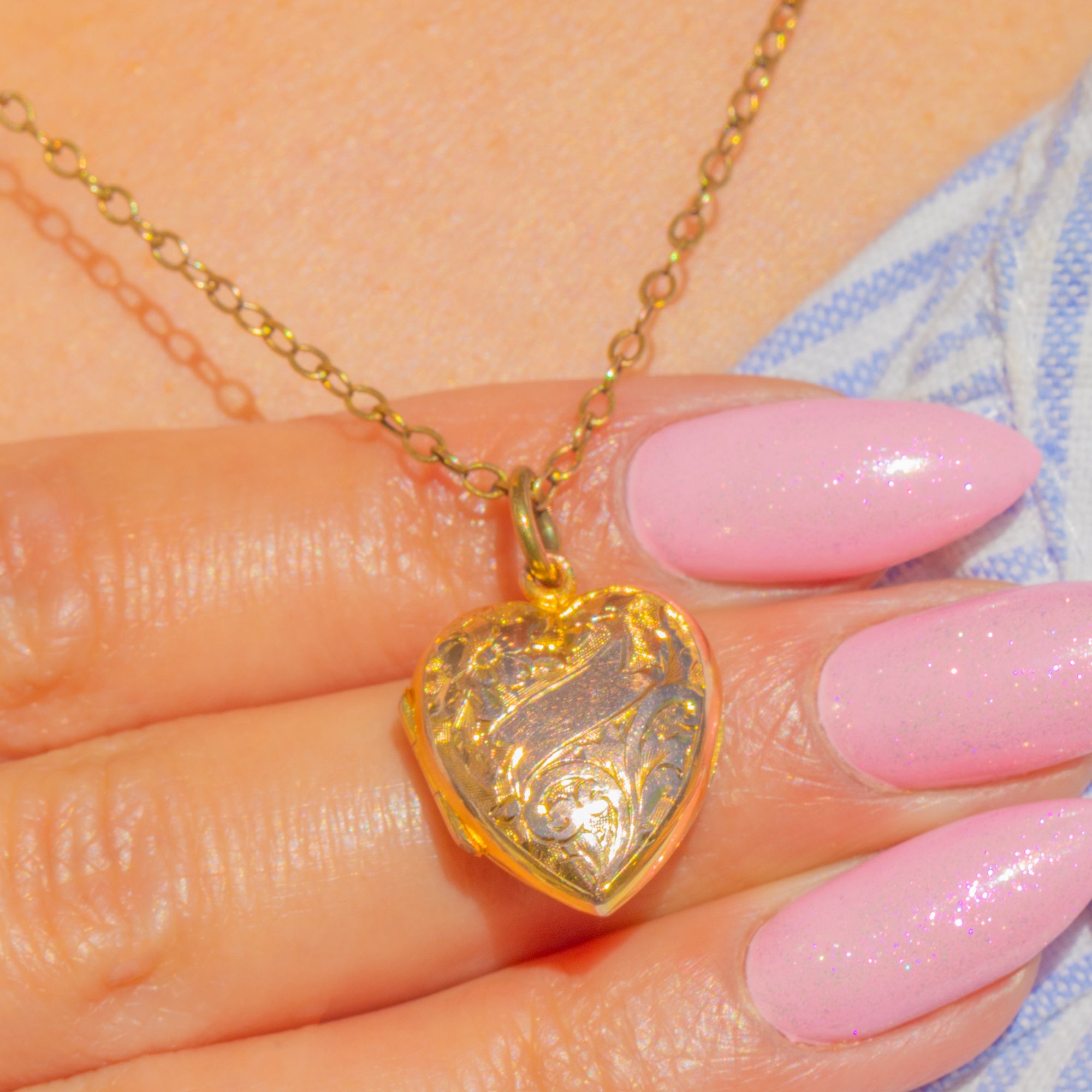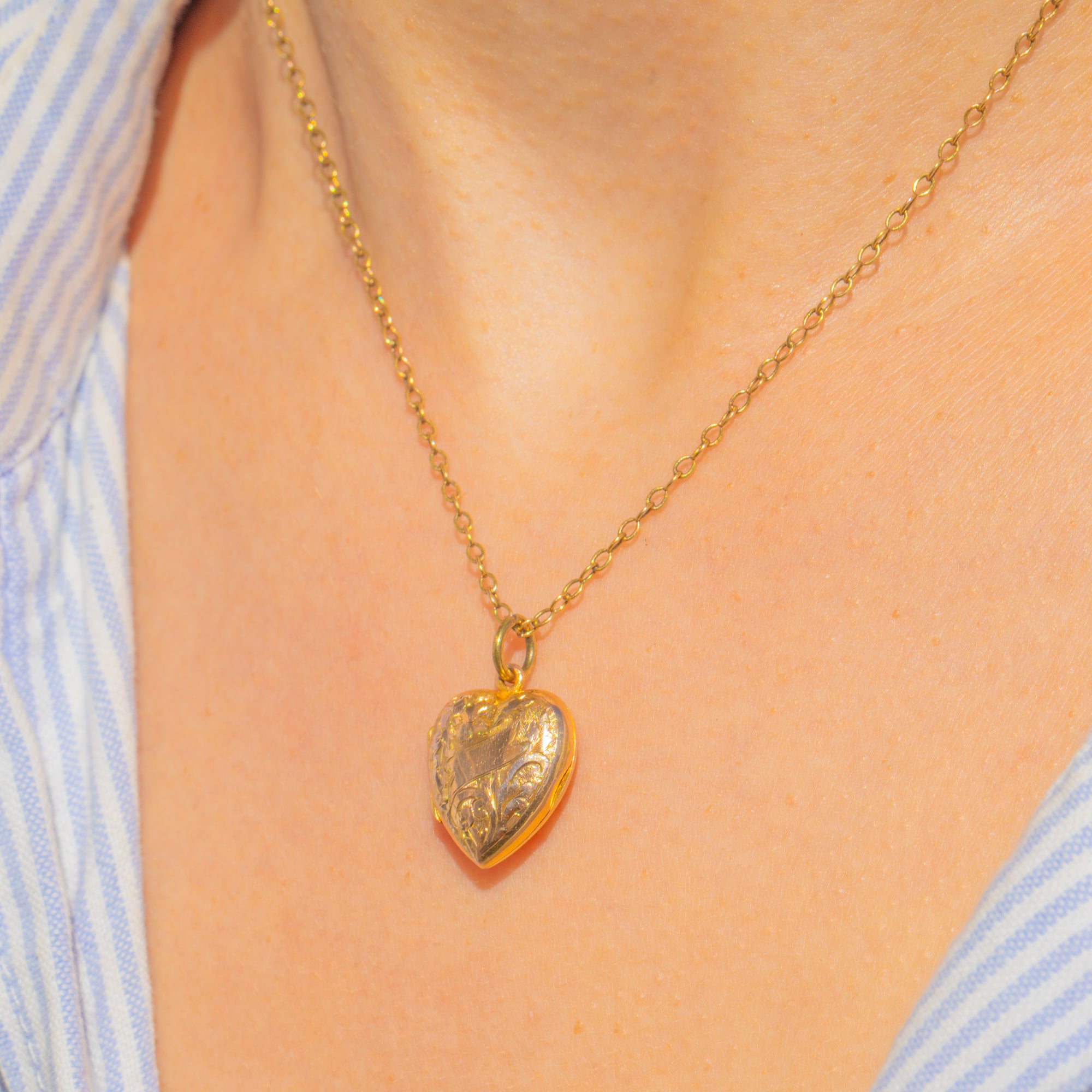 A sweet heart-shaped locket in Solid 9ct Gold, richly decorated with scrolling foliate and tiny floral engraving framed by a central blank cartouche ready for initials. Its warm golden glow and crisp detailing create a beautifully romantic, timeless keepsake.
