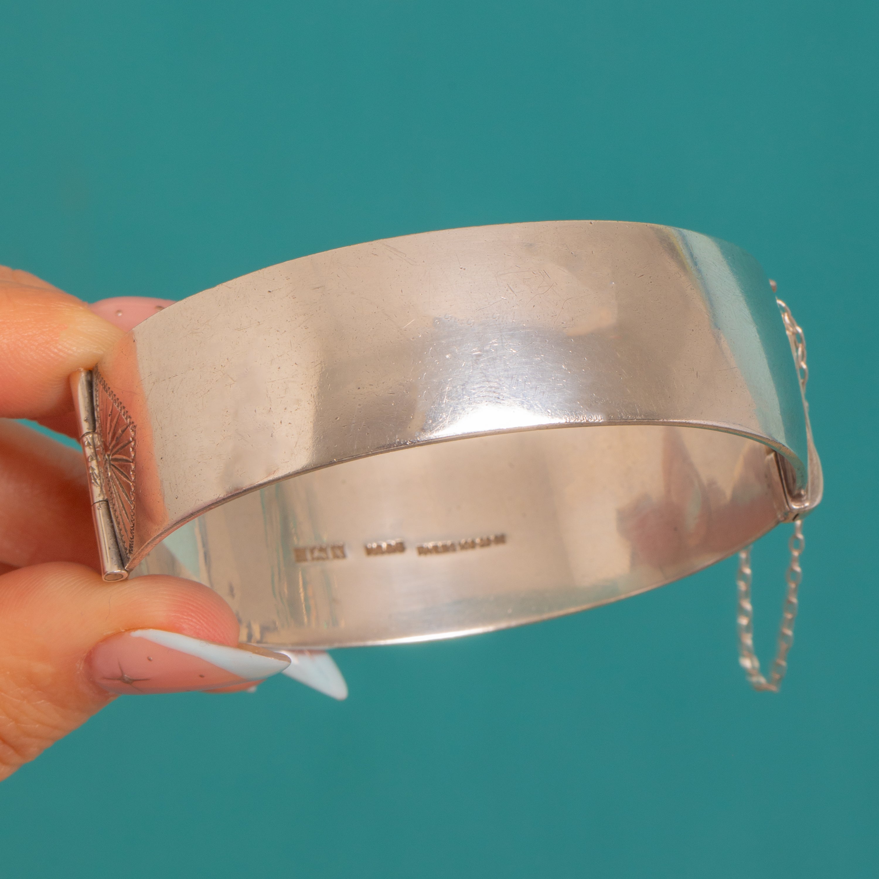 Beautifully made with an external hinge, tongue‑and‑box clasp and a safety chain, the reverse is smoothly domed for effortless wear, with a charming engraved sunburst panel by the hinge. Clear British hallmarks inside confirm Birmingham 1972, and at 59.5g, it has that substantial, quality feel we adore.