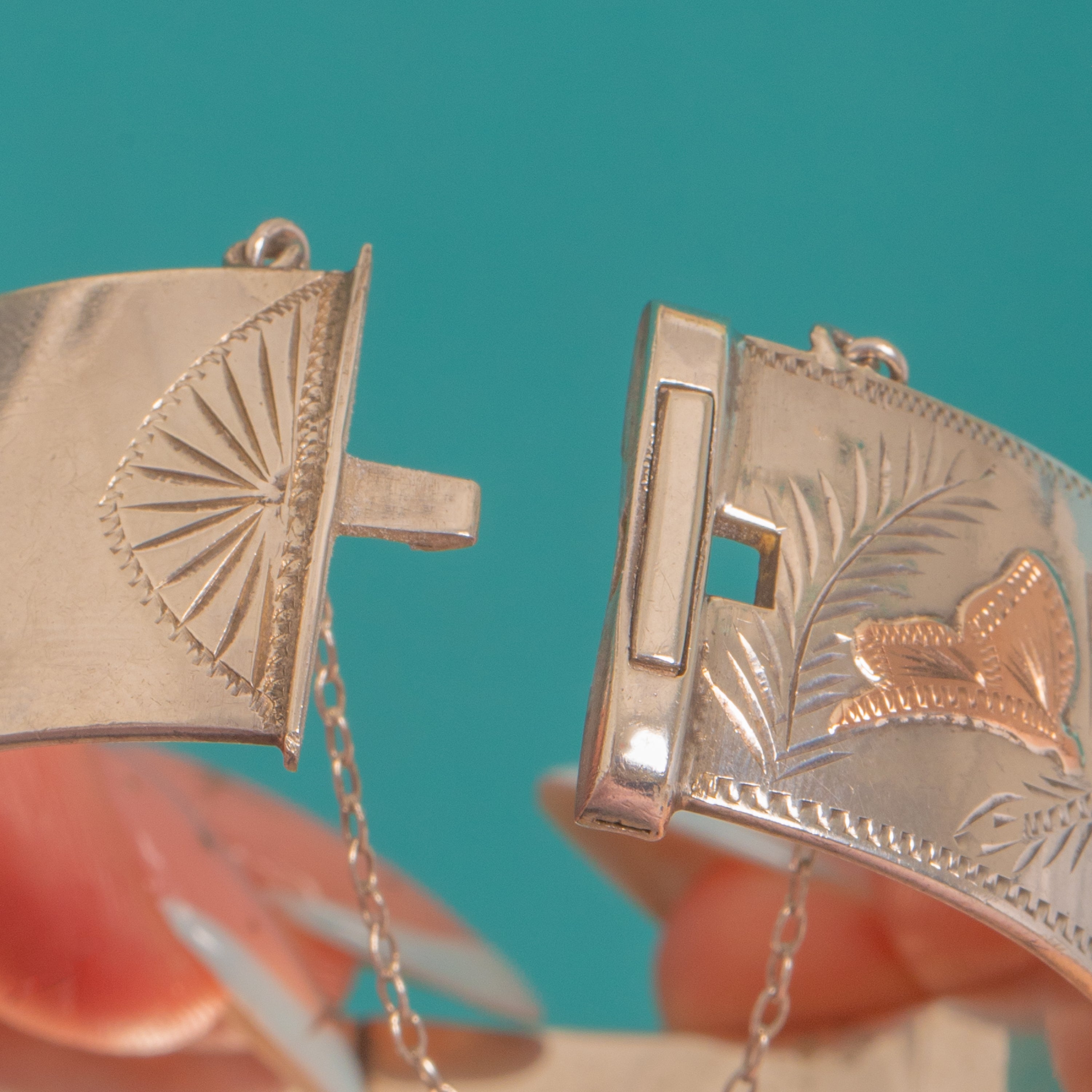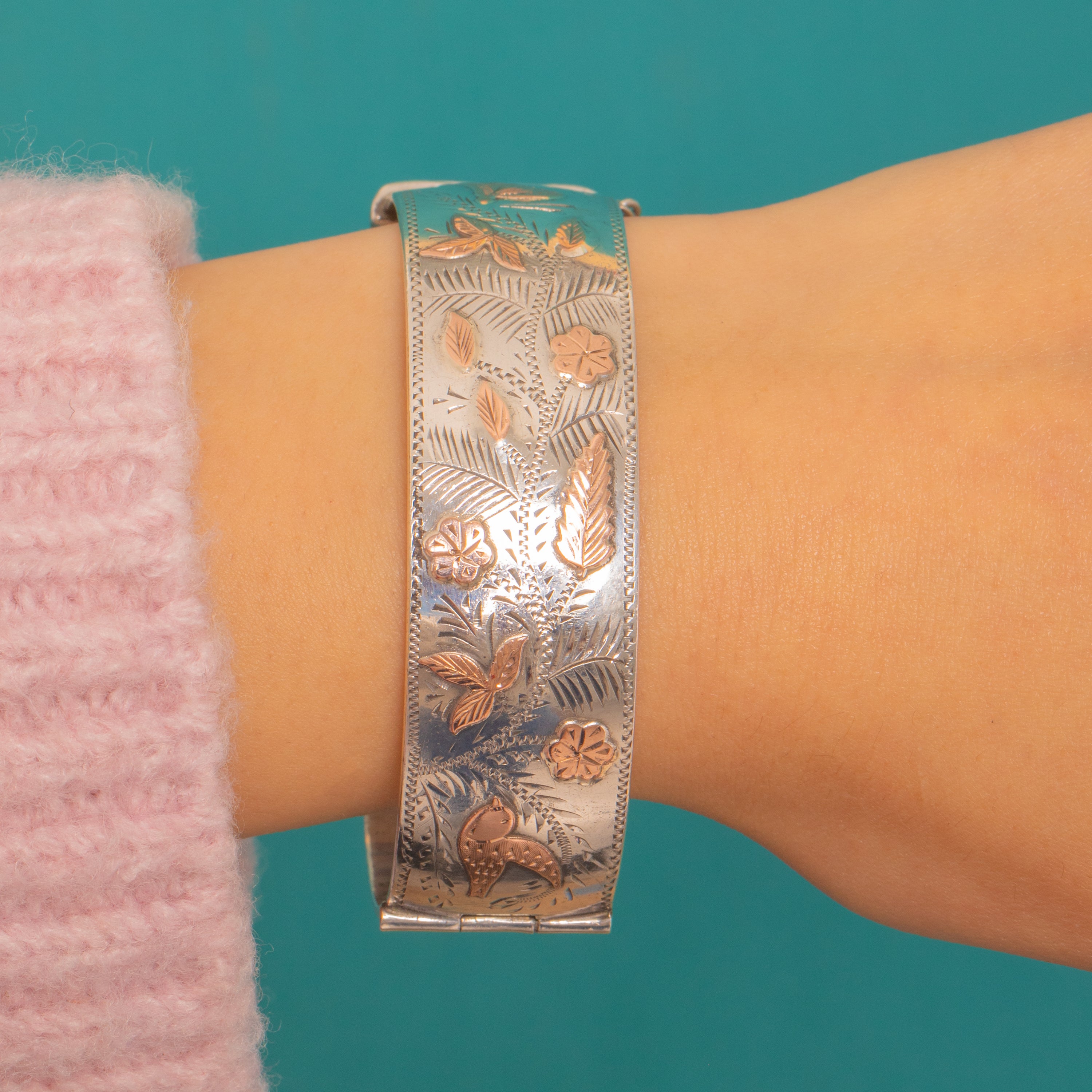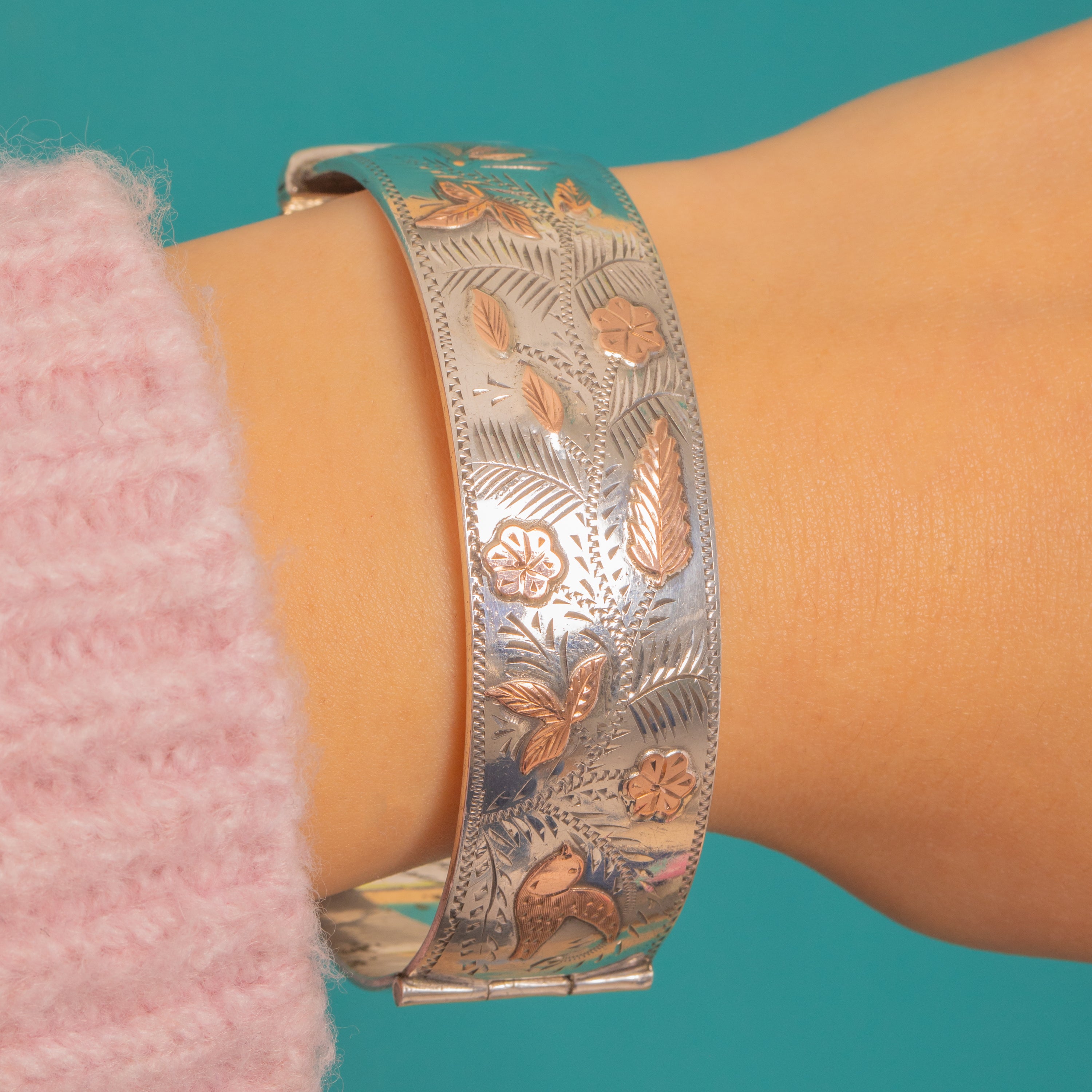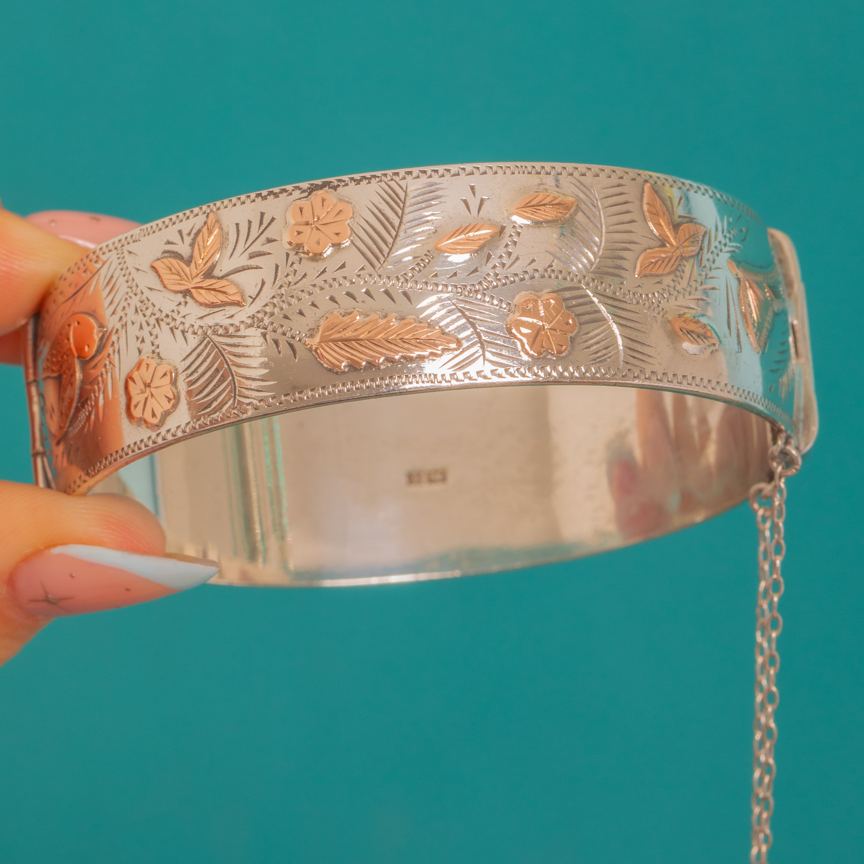 Brimming with nature’s poetry, this wide Vintage Sterling Silver hinged bangle pairs crisp bright‑cut engraving of ferns, leaves and petite flowers with applied 9ct Gold butterflies and birds. The two‑tone contrast dances across a bold 19mm width, framed by a fine beaded, zig‑zag edge for that chic, textural finish.