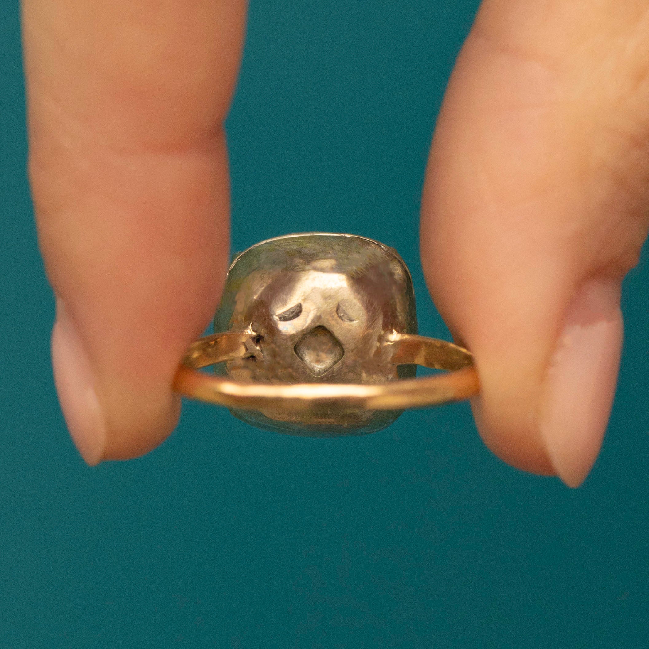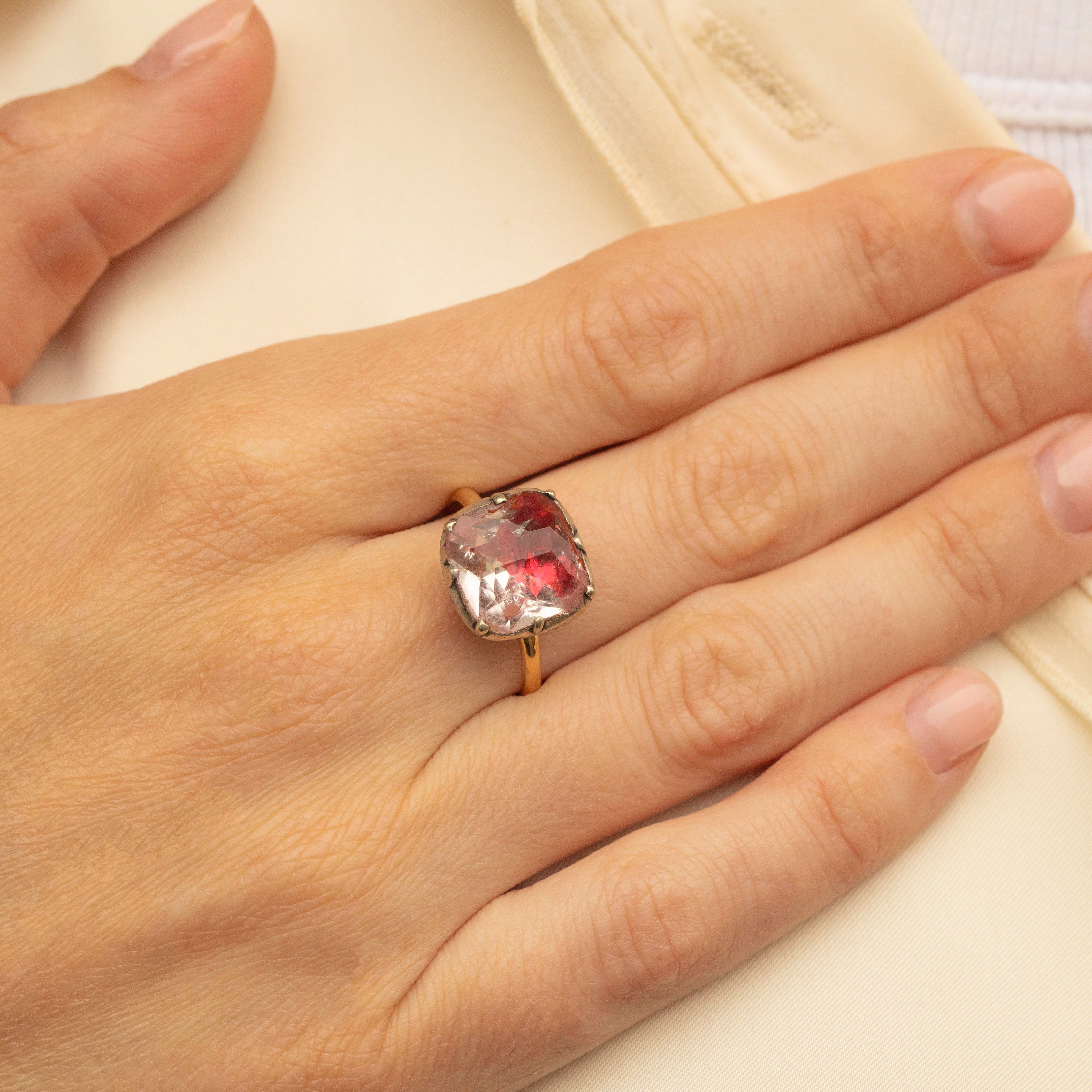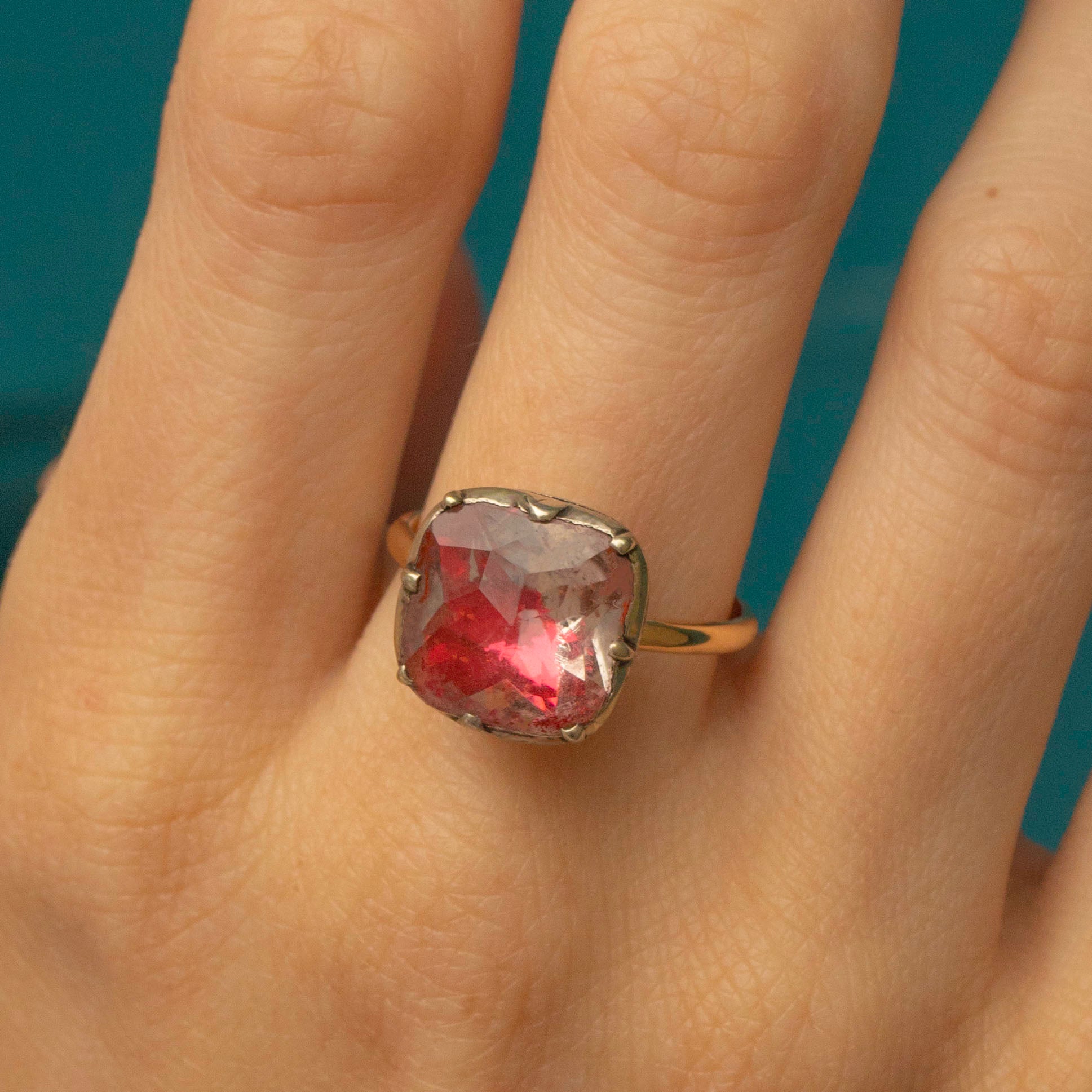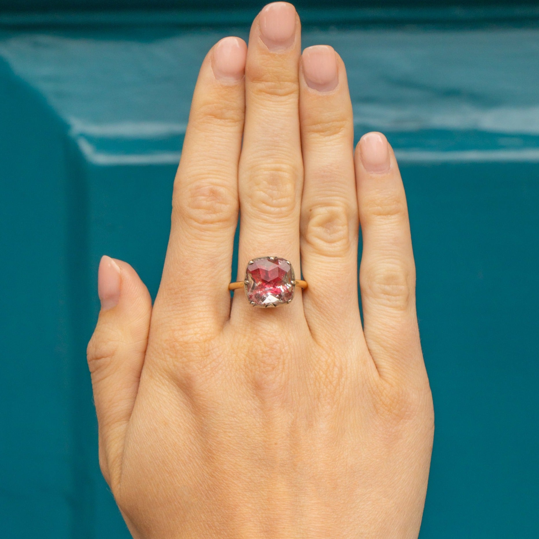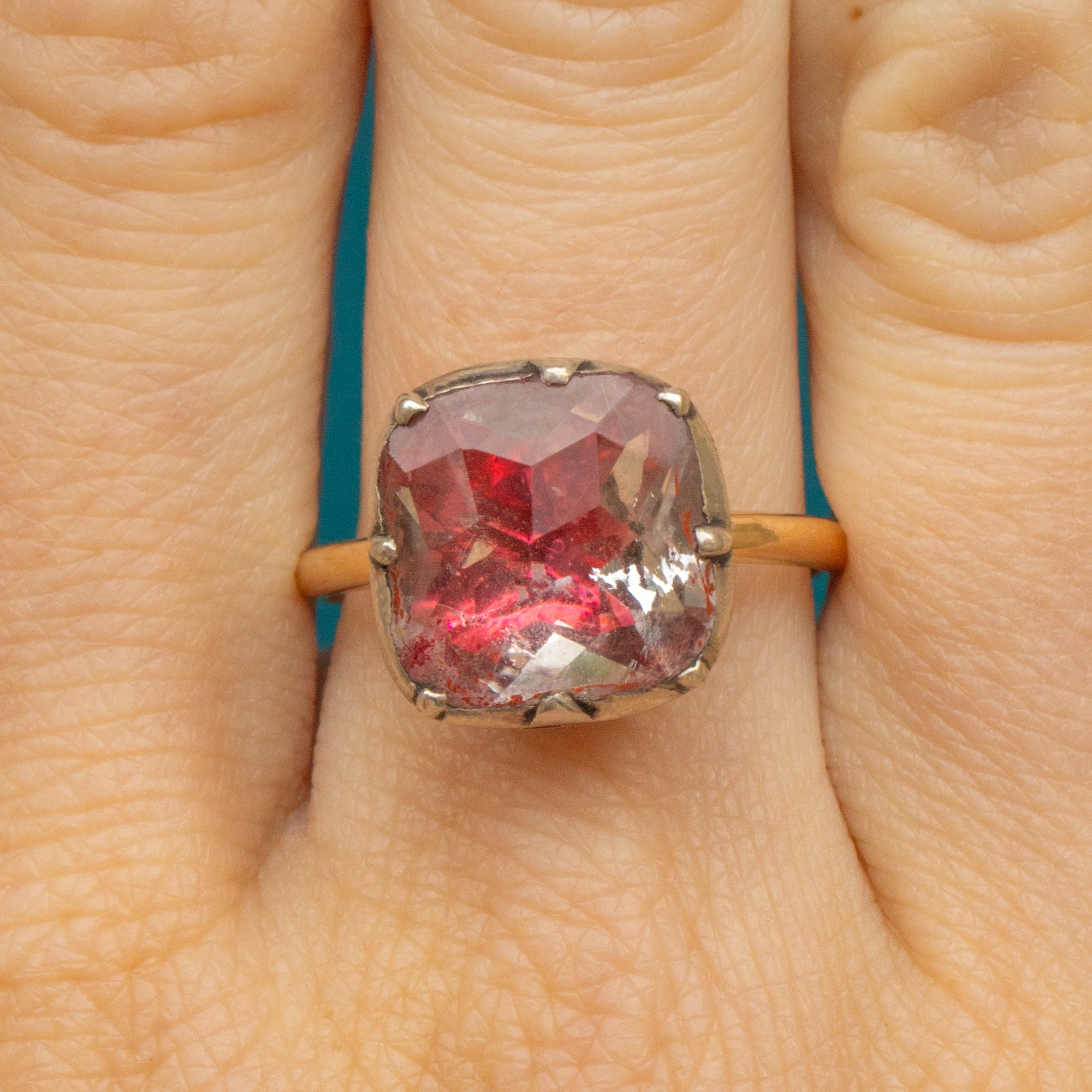 VERY GOOD TO EXCELLENT. This Queen Anne 15ct Gold Georgian pink foiled Rock Crystal ring is in wonderful condition. The Rock Crystal has retained its distinctive facets with no signs of wear, and is secure in its setting. The pink foiling has been beautifully preserved having only lifted slightly in some places, so we recommend avoiding humid conditions while wearing this ring to stop it from getting damaged. The back of the Rock Crystal settings do have some wear to note commensurate with age, but the piece sits uber comfortably against the skin.