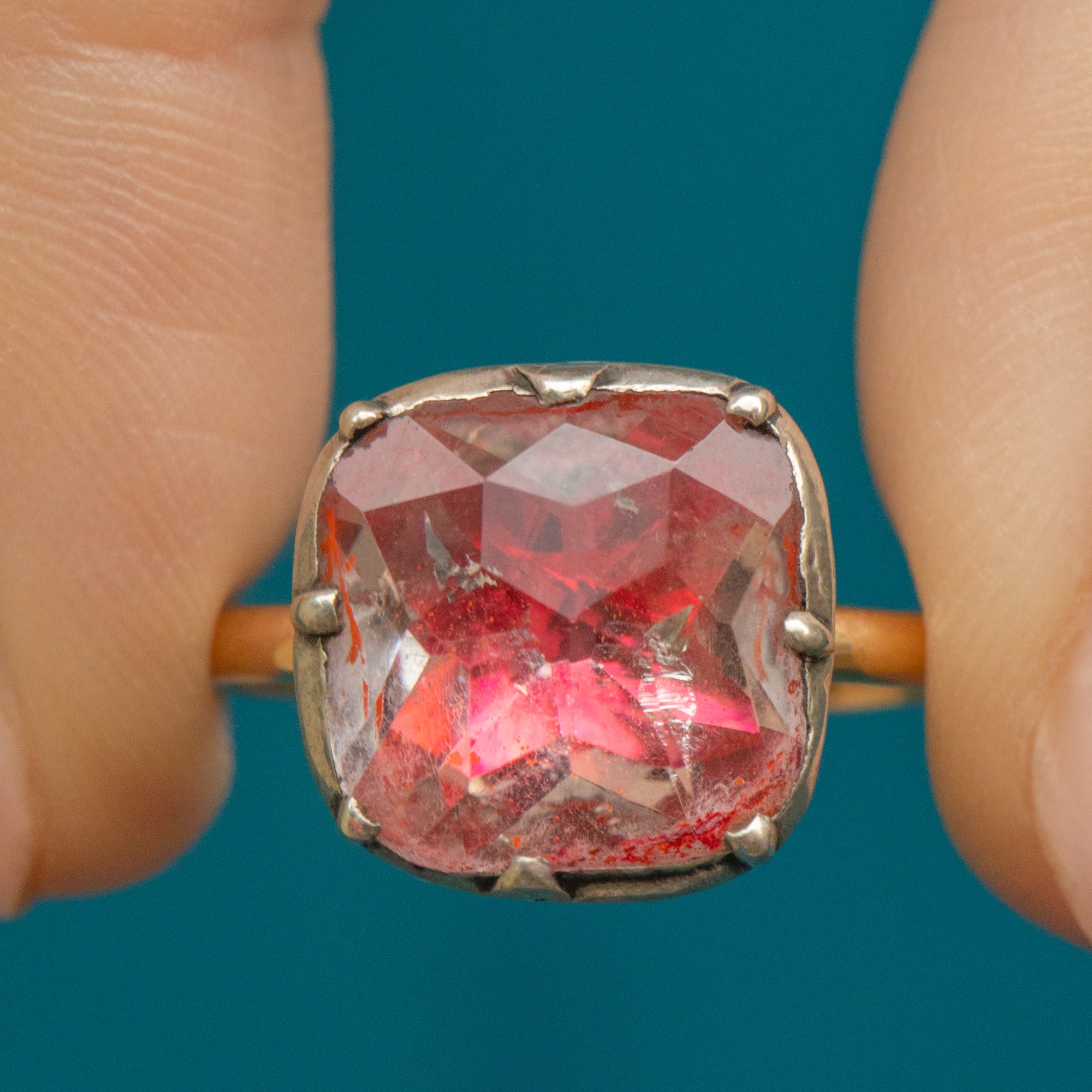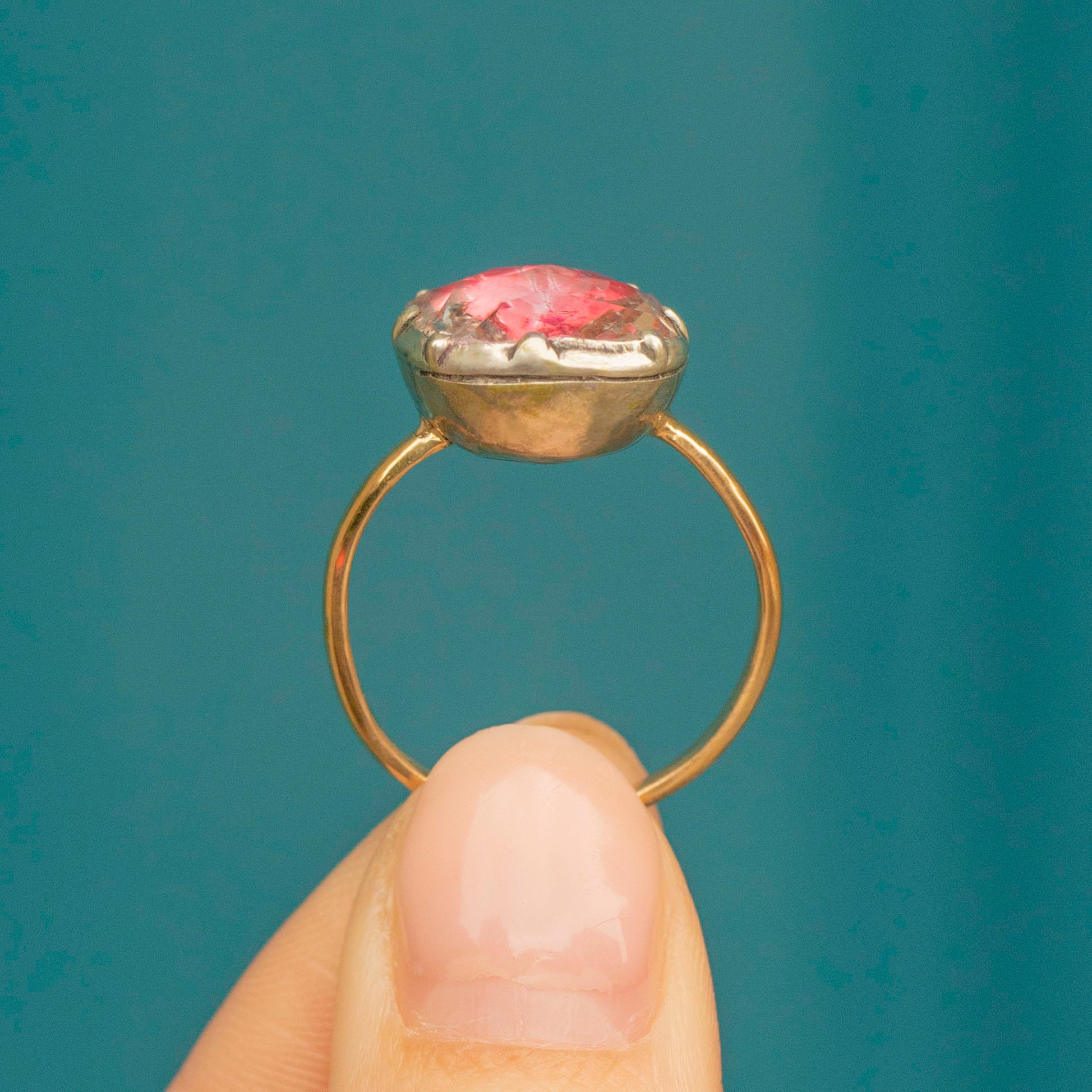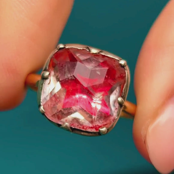This exquisite Queen Anne 15ct Gold Georgian pink foiled Rock Crystal ring will make a fabulous addition to your antique collection! Highly coveted, this rouge pink foiled beauty was likely crafted during the mid-18th century and has retained all of her splendour over the years.