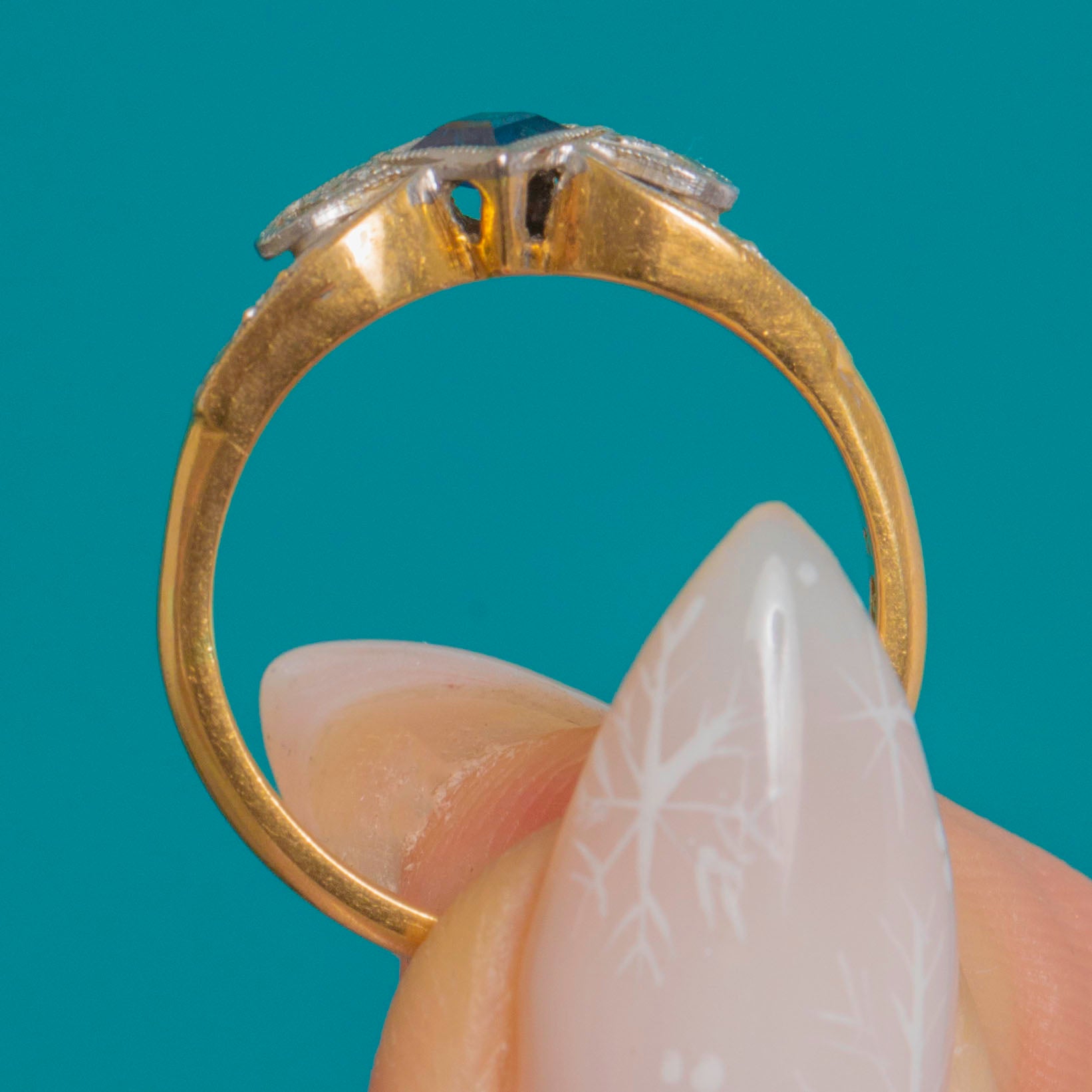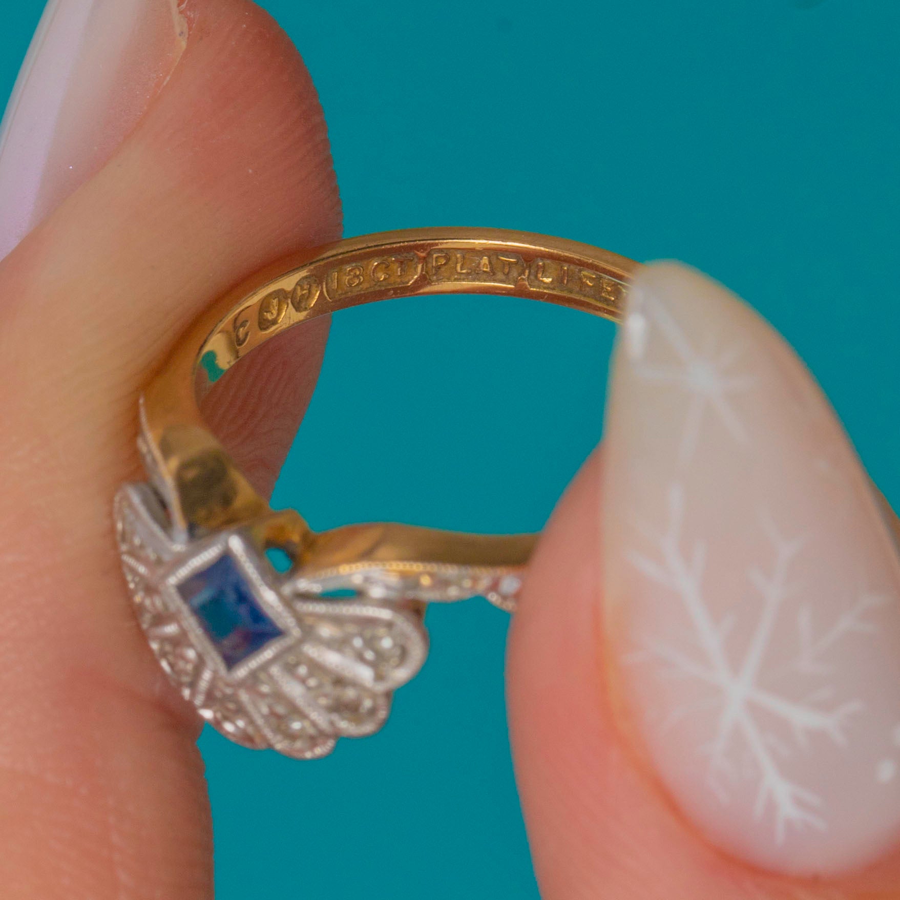 EXCELLENT: The Sapphire and Diamonds are bright with no visible chips or abrasions, and the milgrain remains crisp. The Platinum head and 18ct Gold shank show only light surface wear commensurate with age. No evidence of resizing or repair observed.