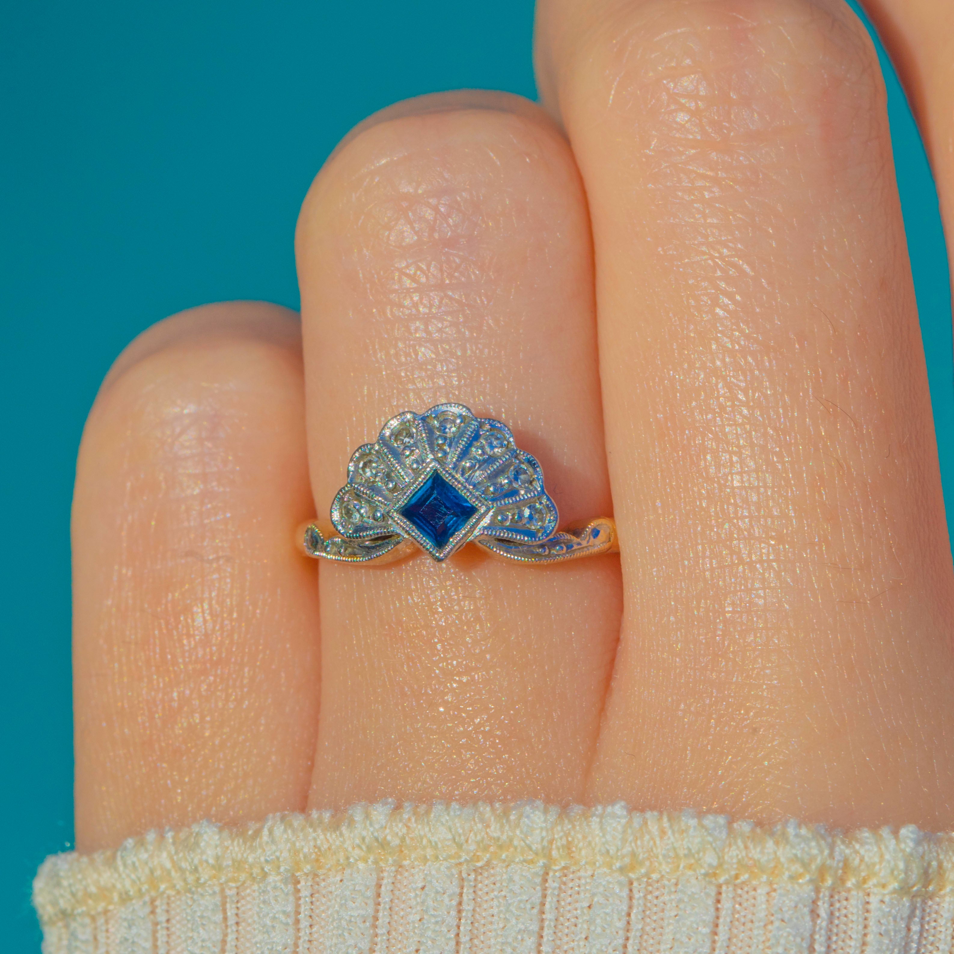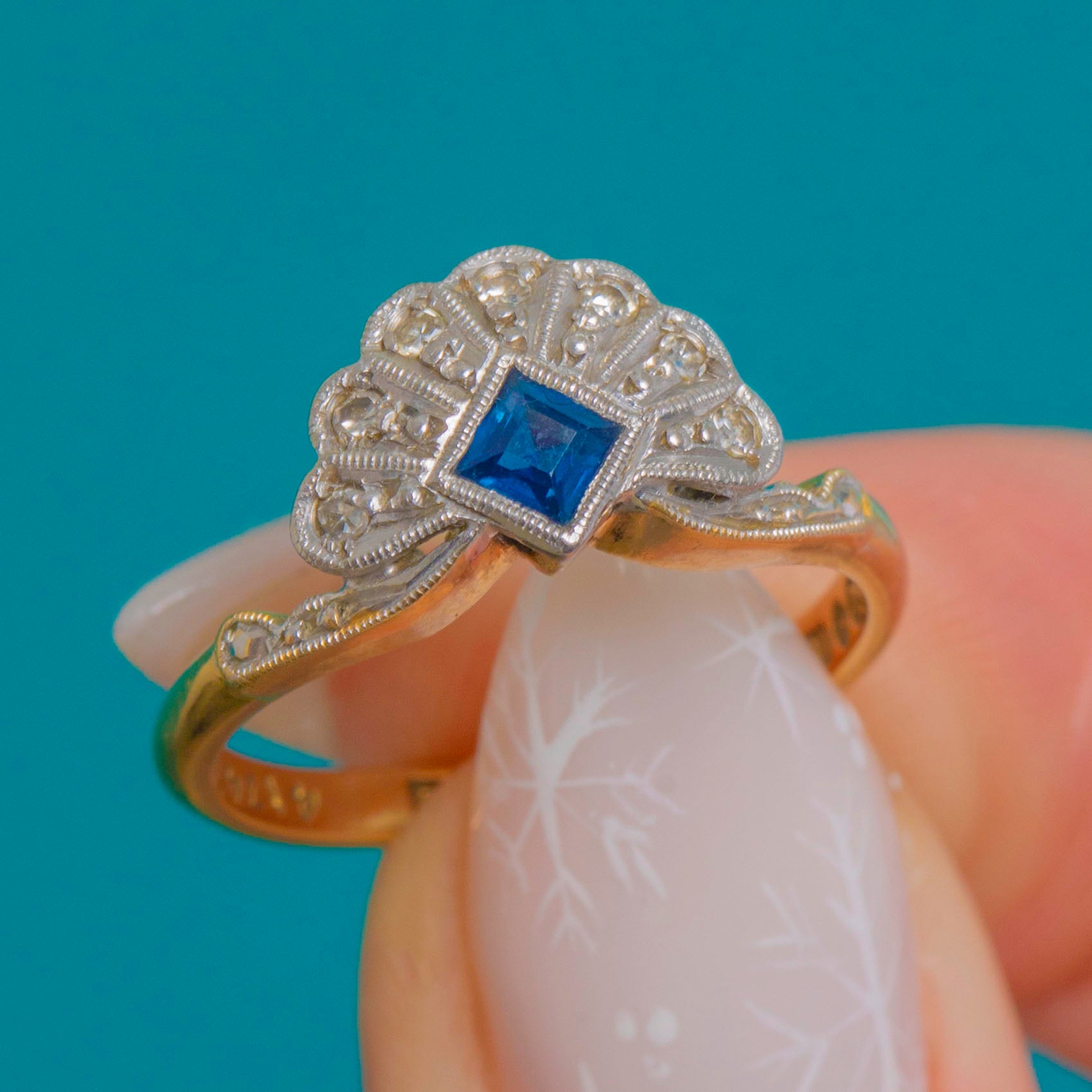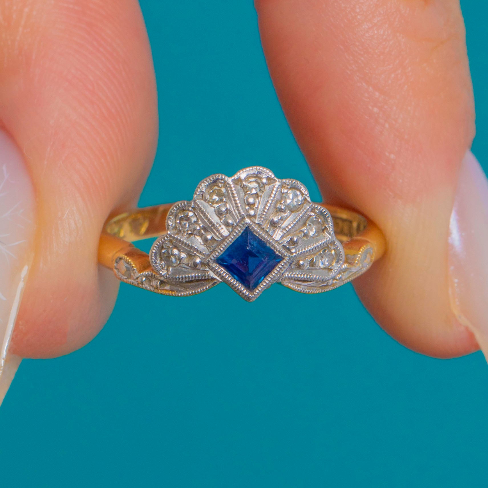 A graceful Art Deco fan ring crafted in two-tone 18ct Gold and Platinum. At its centre a deep blue, princess-cut Sapphire is kite-set within a scalloped Platinum fan, the radiating panels crisp with milgrain and twinkling with bead-set Diamond accents. Finely detailed shoulders complete the ring’s refined, symmetrical aesthetic.
