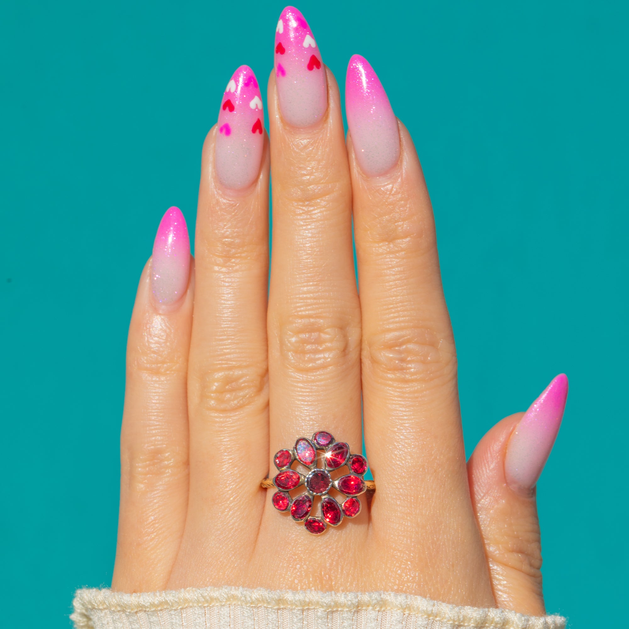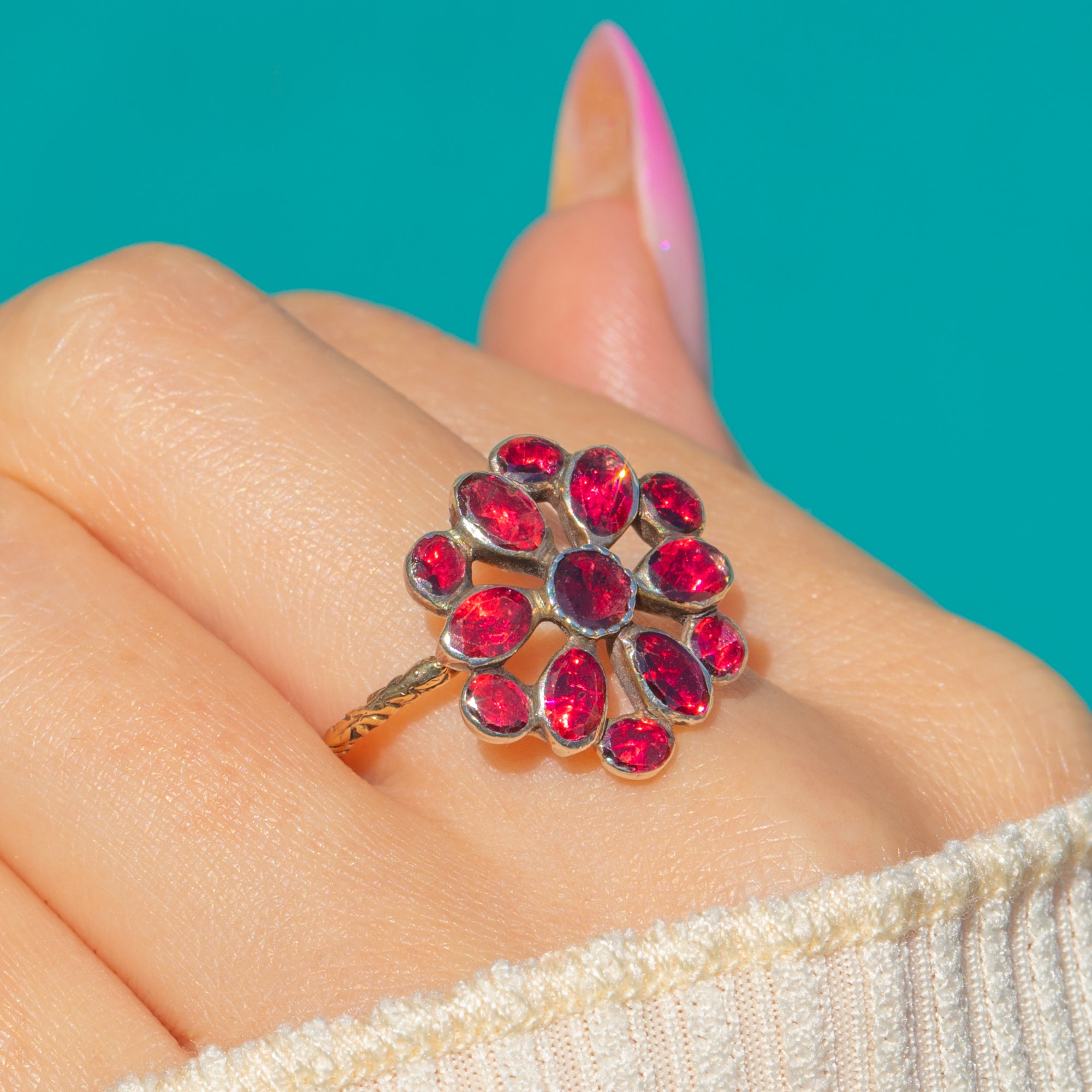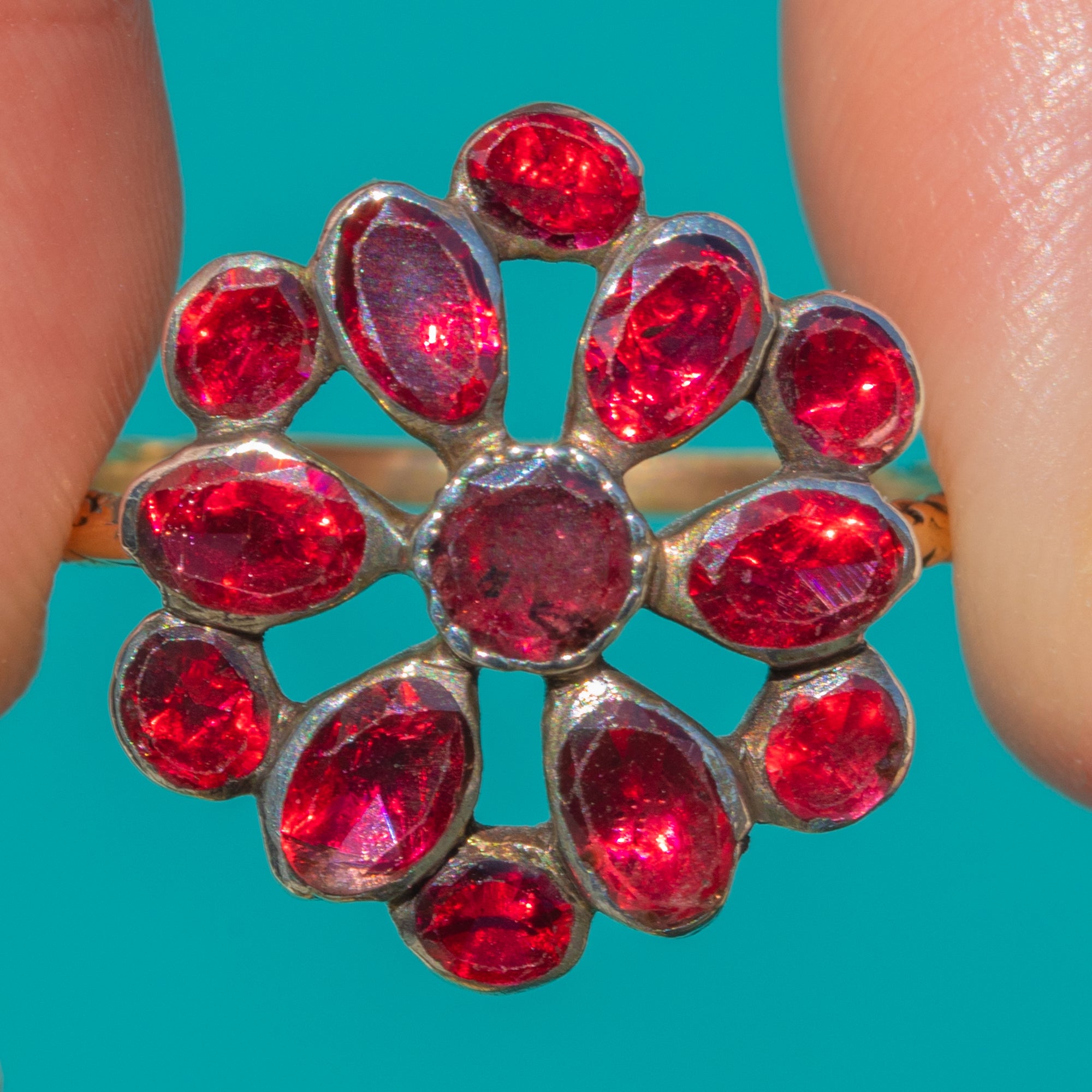 A glowing rosette of deep red Garnets, this Georgian cluster ring captures the romance of c.1780 in a petite yet striking bloom. Flat cut Garnets are arranged around a central stone in a tight floral motif, each gem set in individual raised collet settings to amplify their rich, wine‑hued allure.