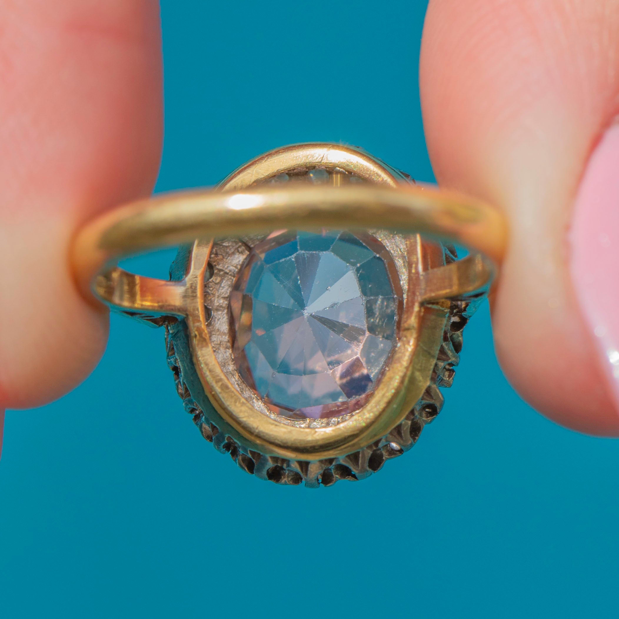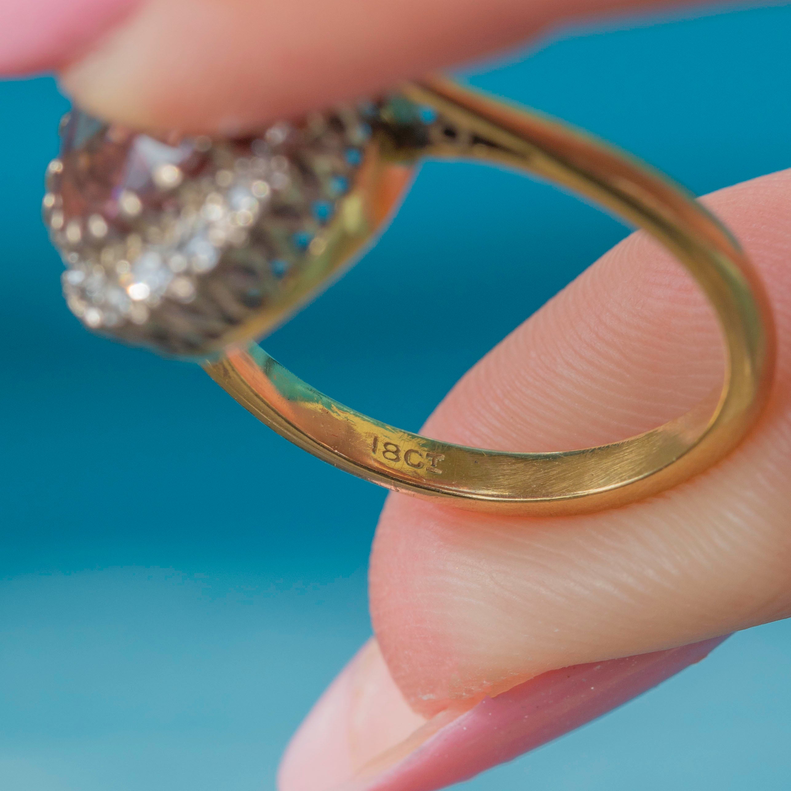 EXCELLENT: This rare 18ct Gold Pink Zircon Diamond cluster ring is in excellent condition. The Zircon has a crisp set of facets with no chips or abrasions, and is securely set. Her Diamonds and Zircon are held tightly in an 18ct Gold! The gemstones are free from any scratches or subtle wear! You can pop her on straight from her Lillicoco box!
