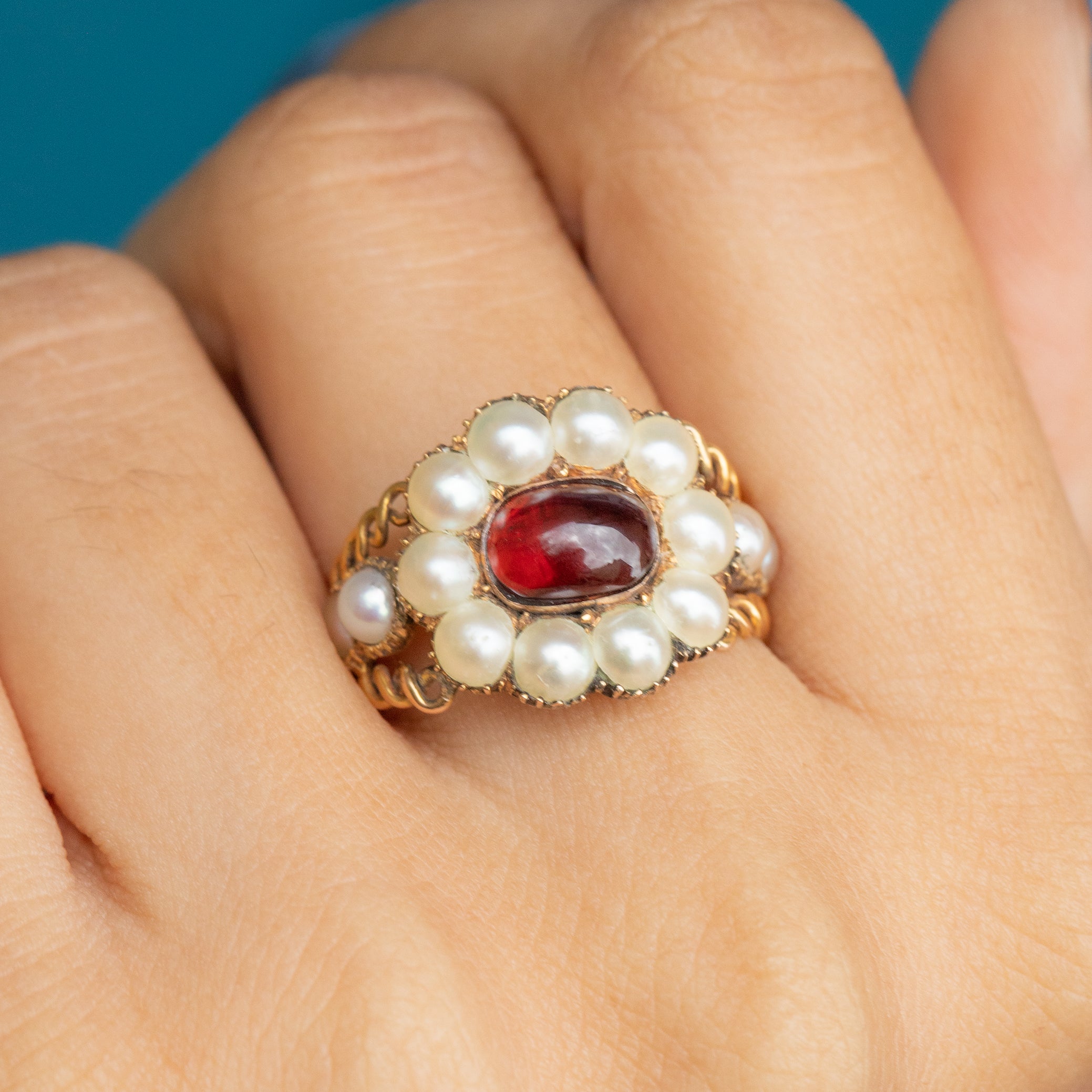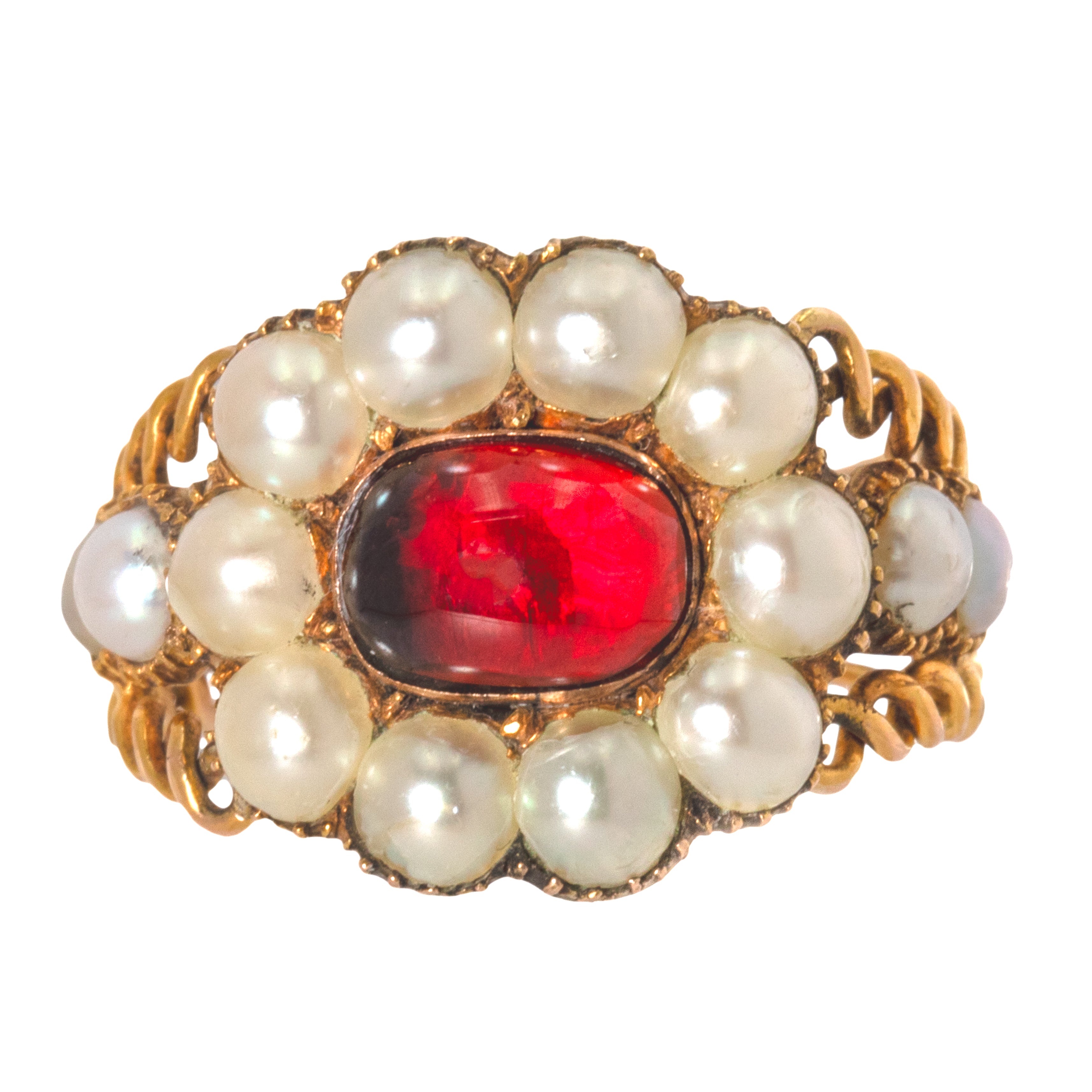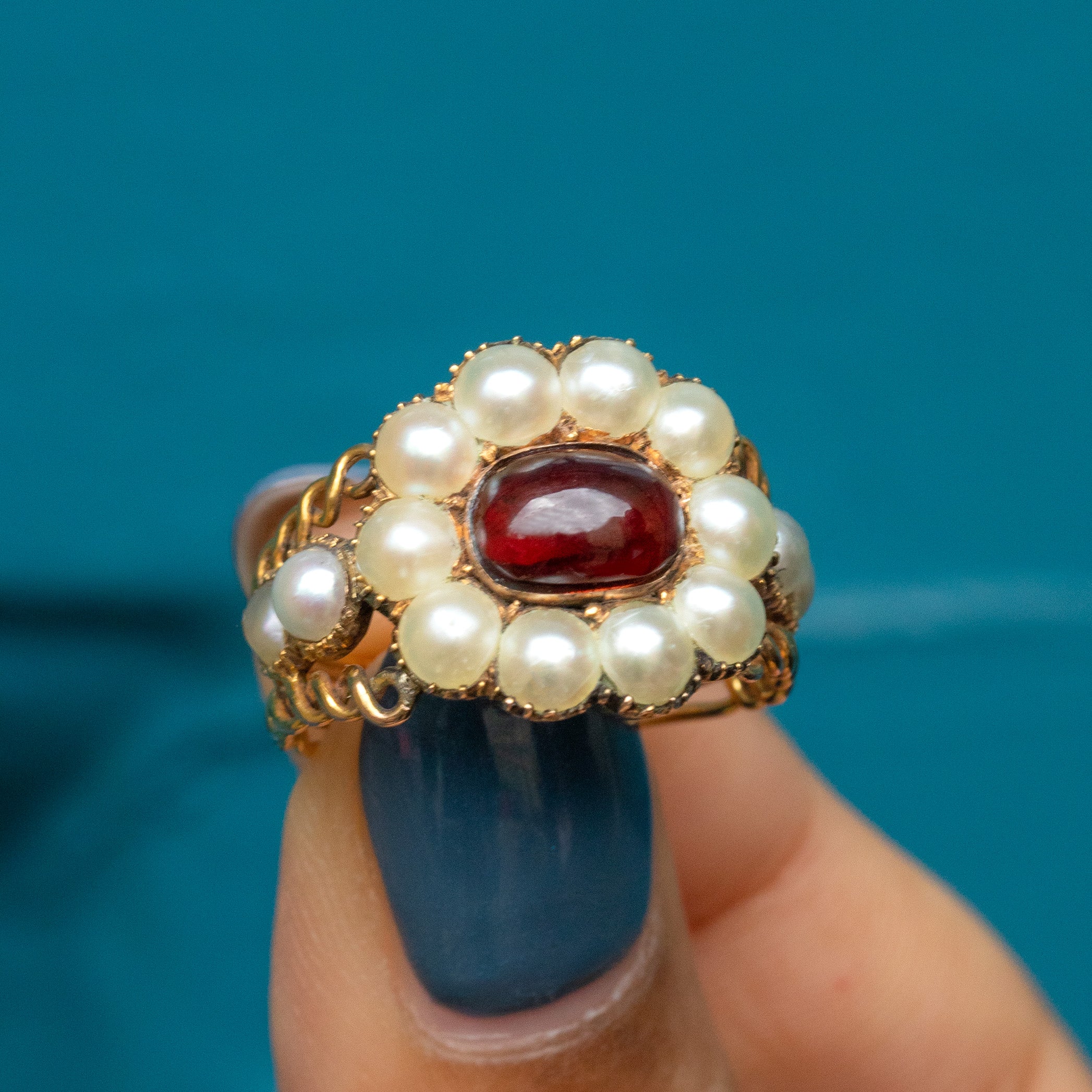 EXCELLENT. This Georgian 9ct Gold Garnet Pearl cluster ring is in excellent condition. This treasure has been preserved beautifully, with the Garnet remaining smooth and free from any wear, and the Pearls crisp and secure in closed-back collet settings. The ring band has been skillfully crafted, and we cannot express our joy at how well this Georgian ring has been preserved over its 200 years of life!