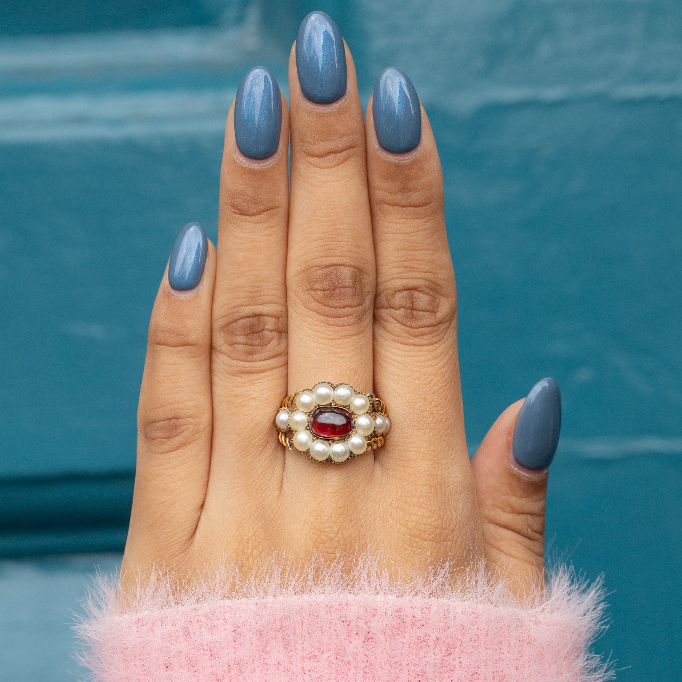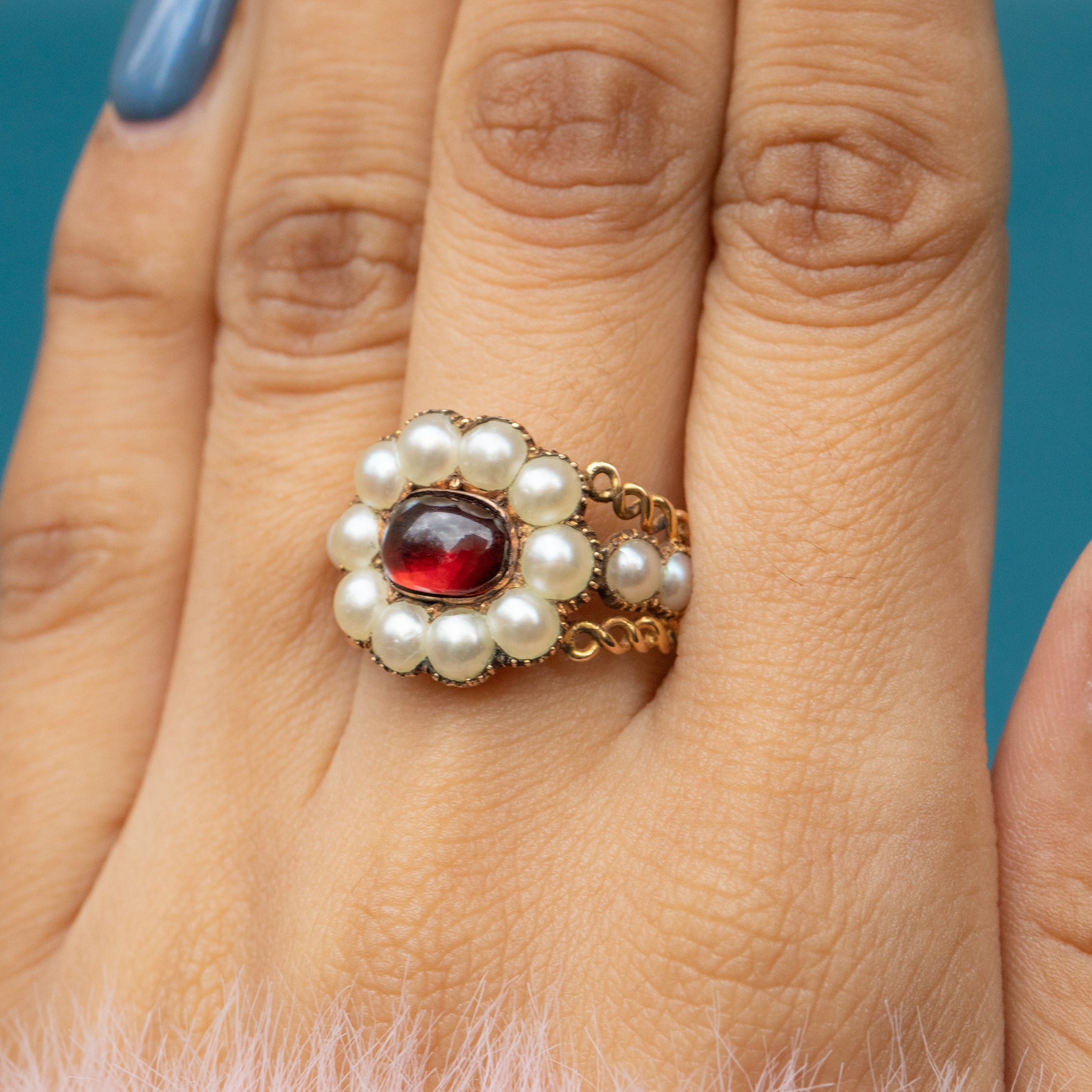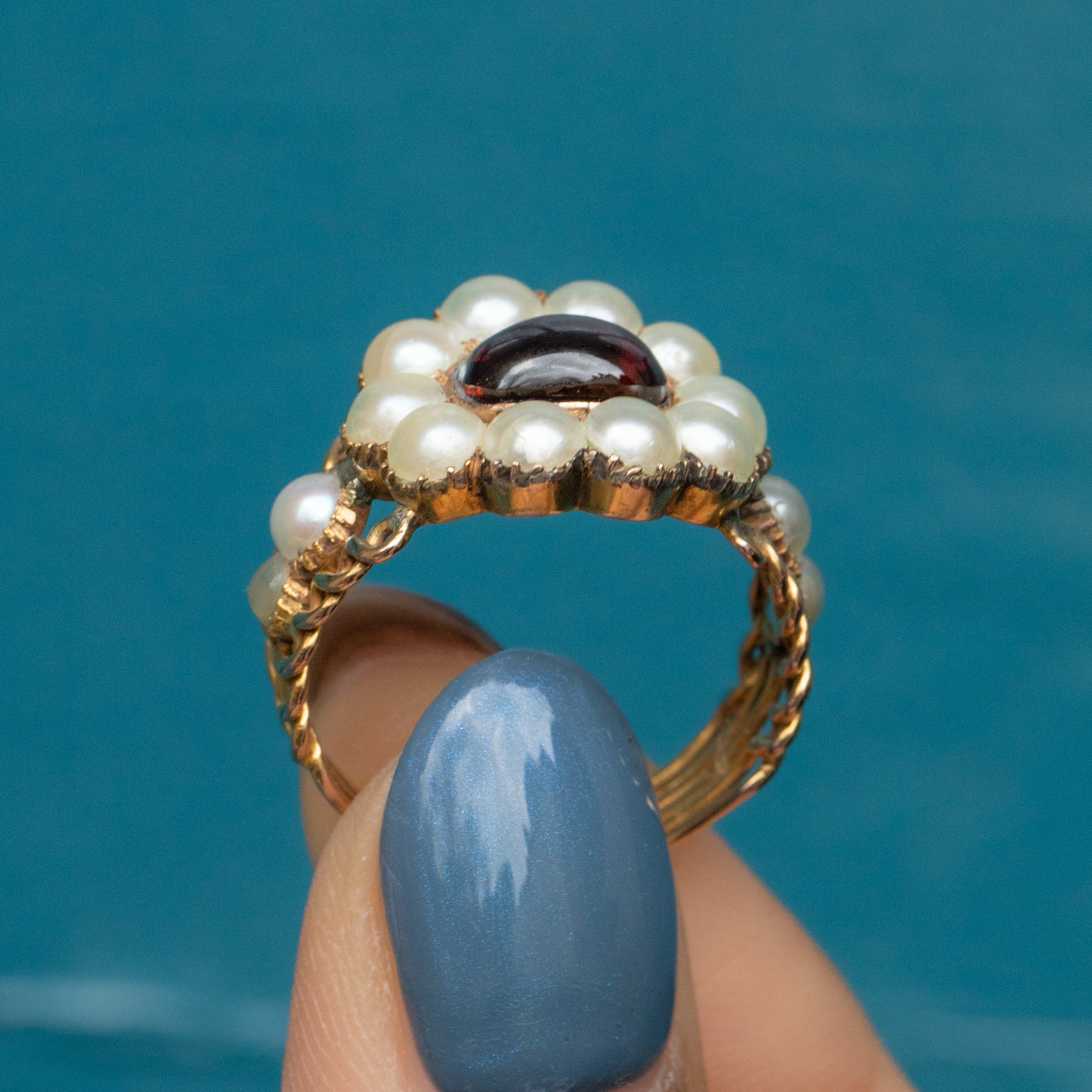 EXCELLENT. This Georgian 9ct Gold Garnet Pearl cluster ring is in excellent condition. This treasure has been preserved beautifully, with the Garnet remaining smooth and free from any wear, and the Pearls crisp and secure in closed-back collet settings. The ring band has been skillfully crafted, and we cannot express our joy at how well this Georgian ring has been preserved over its 200 years of life!