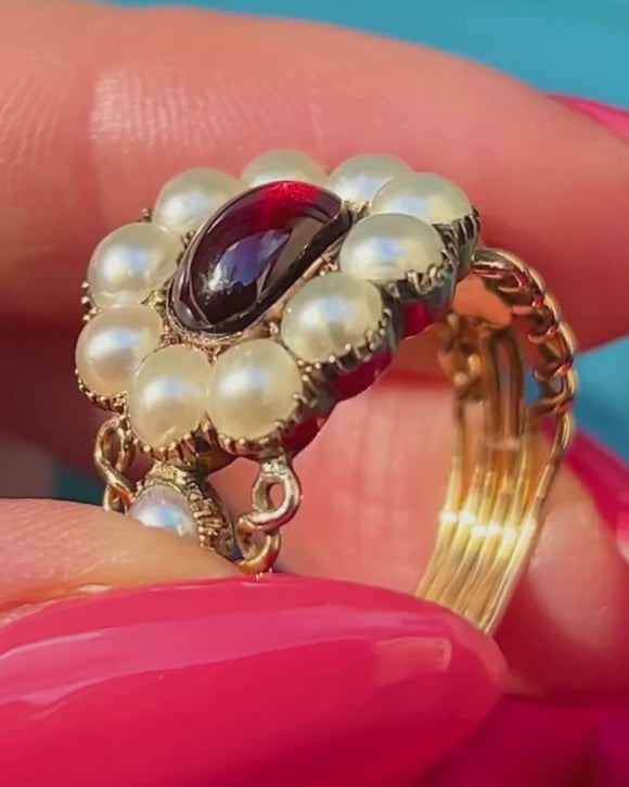 RARE 19th-Century Georgian 9ct Gold Garnet Natural Pearl Cluster Ring