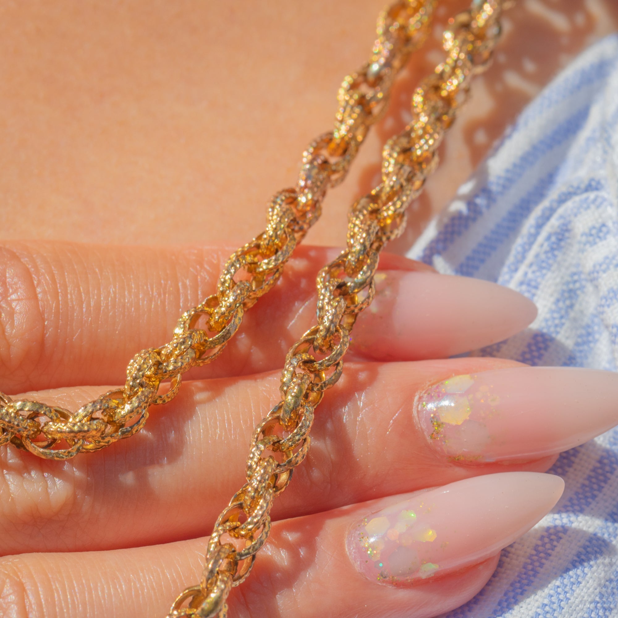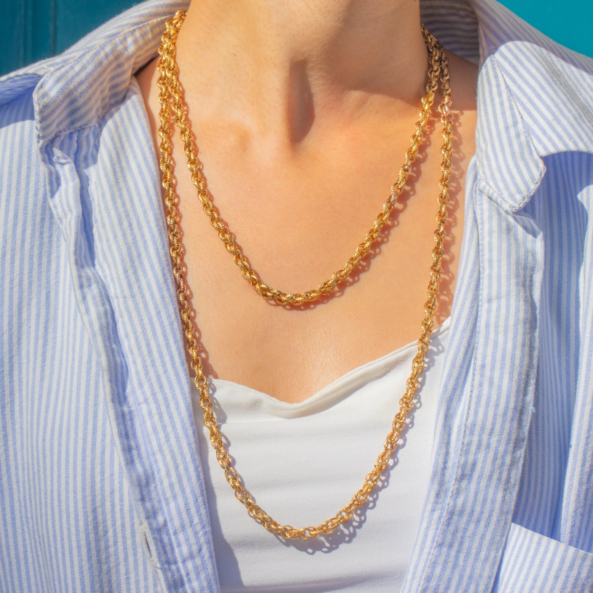 The rope-like textured links are wonderfully tactile, catching the light with every movement. At 43.1g, it has a luxurious weight, and the subtle signs of age add to its authenticity and antique charm. A versatile and collectable piece of Georgian jewellery history.