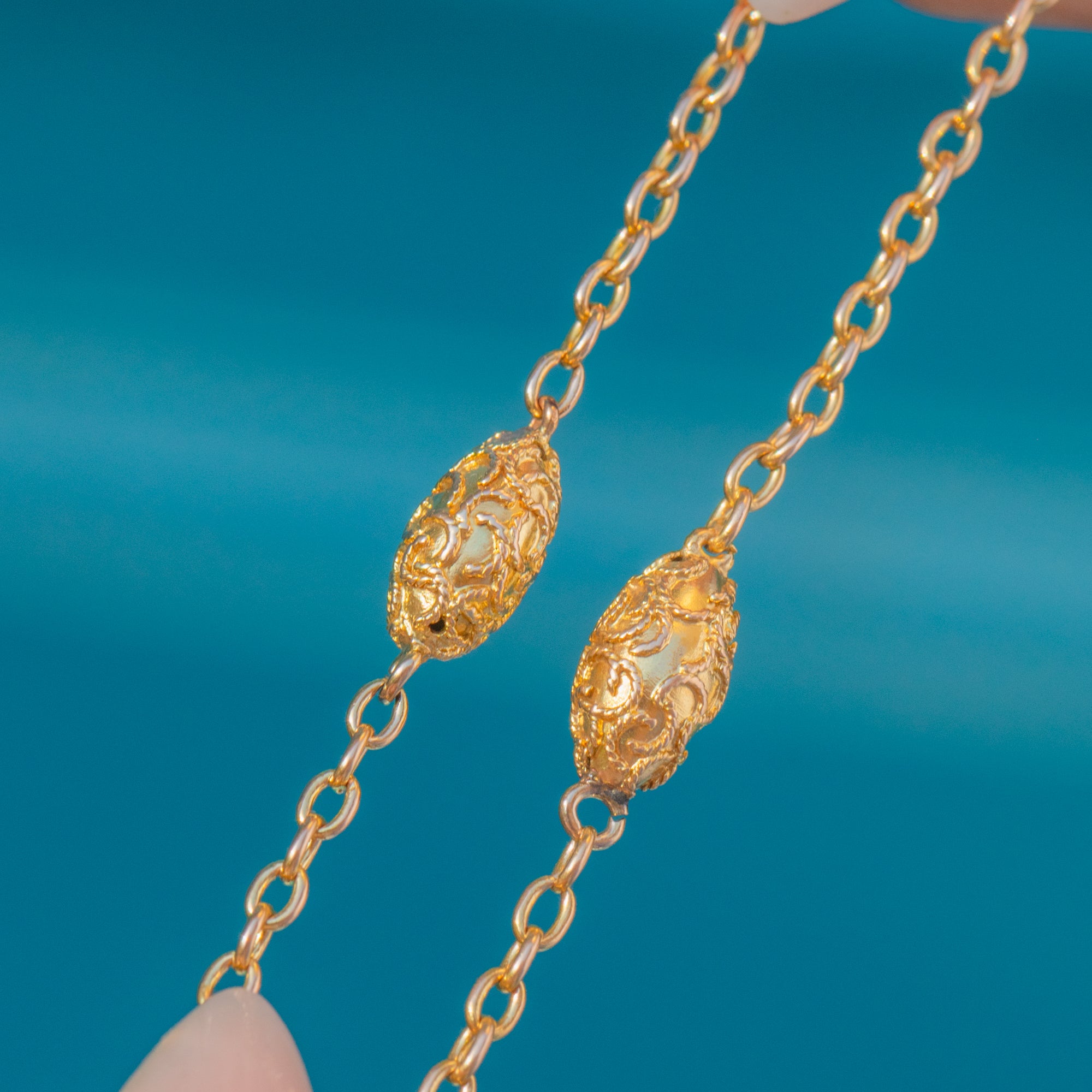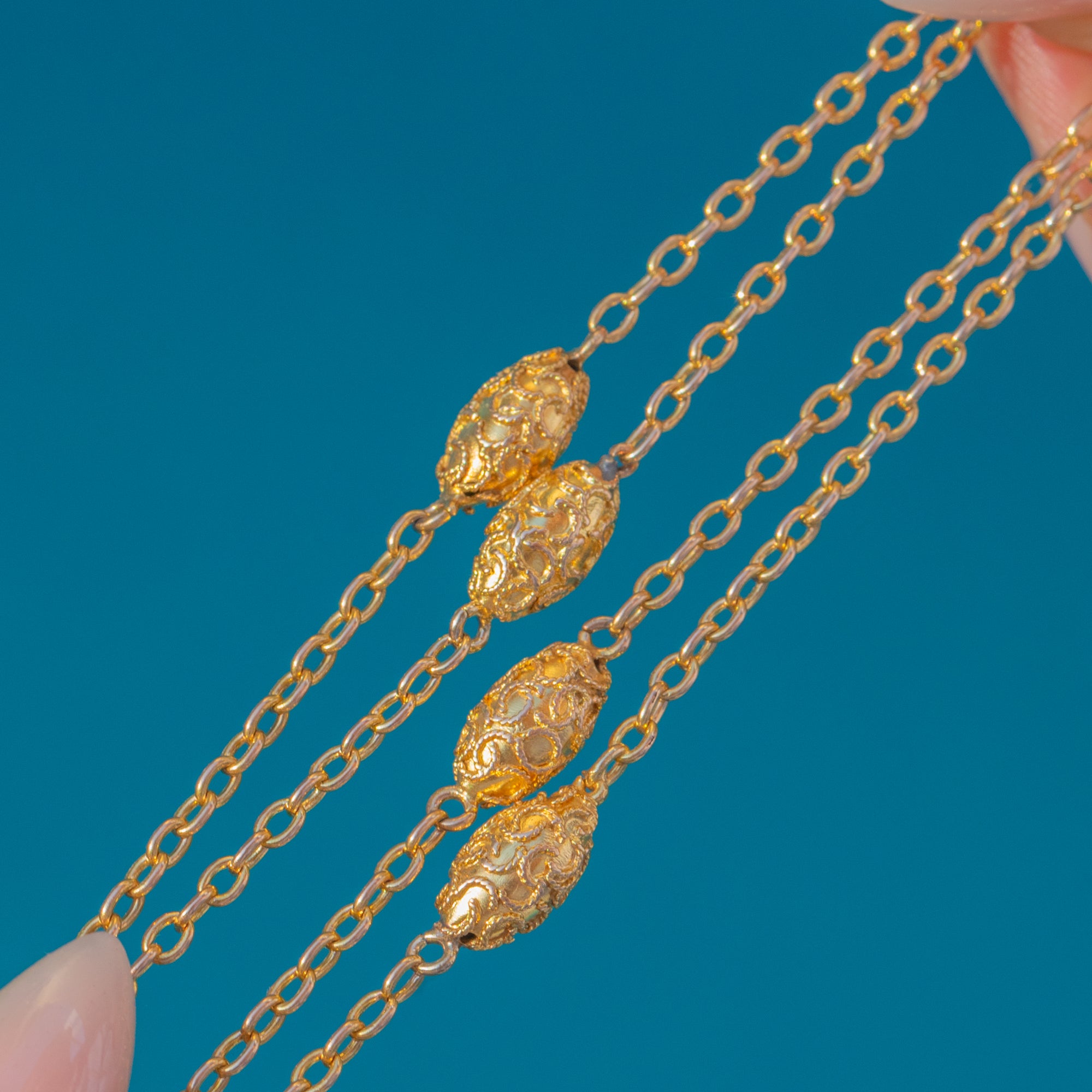The chain is beautifully detailed with five three-dimensional orb Cannetille beads that display a rich Golden glow. A superb example of early 19th century craftsmanship, this chain is both striking and wearable, making it an exceptional addition to any antique jewellery collection.