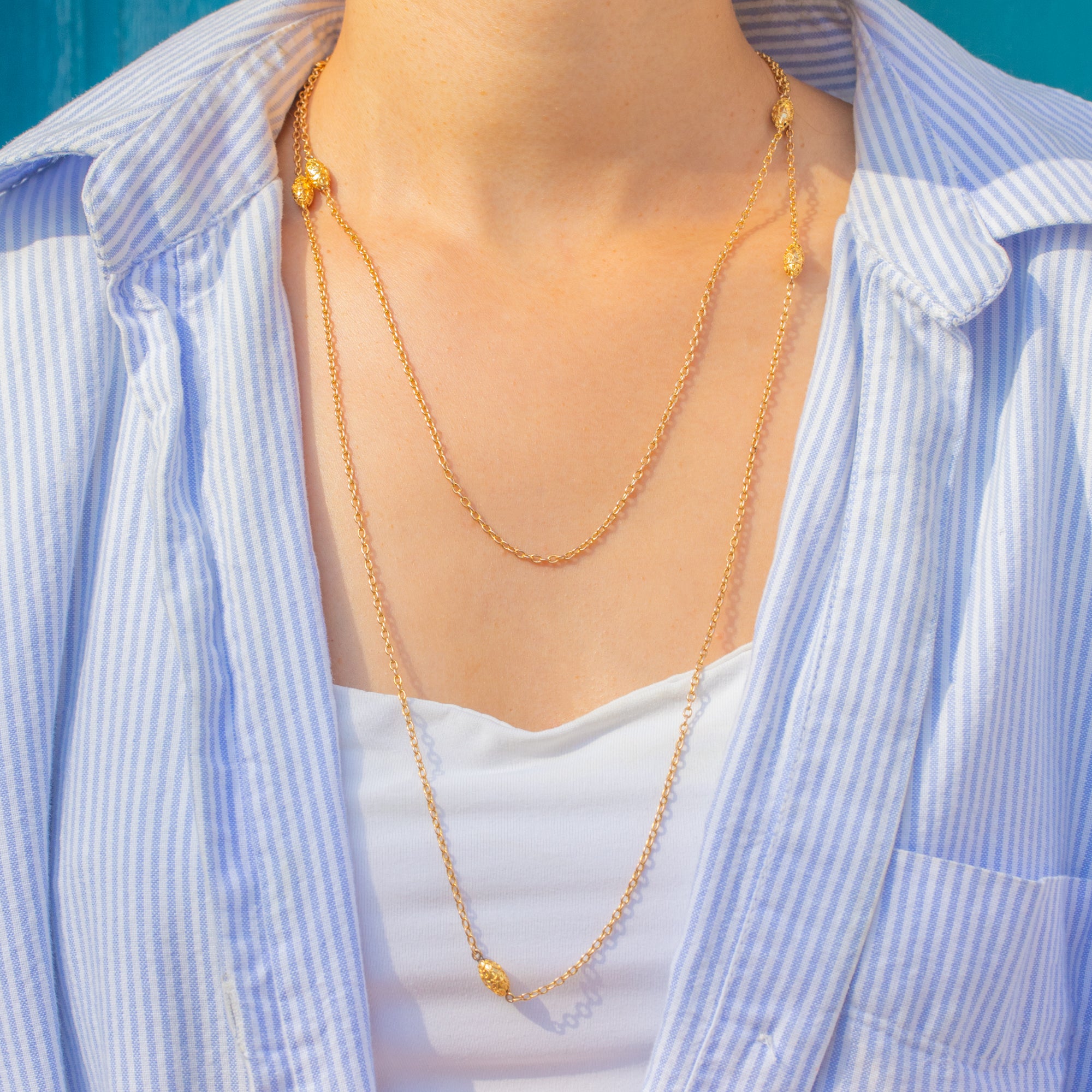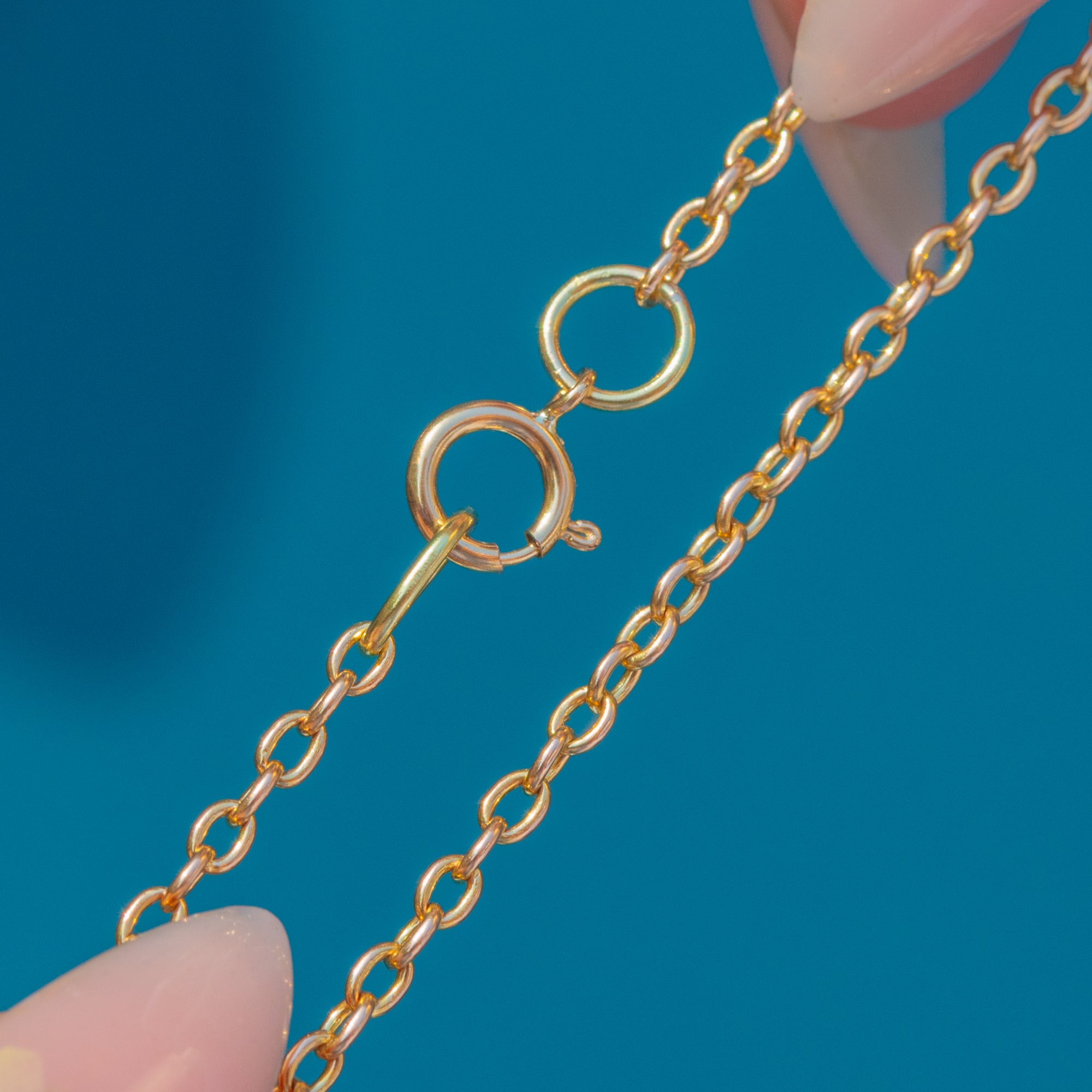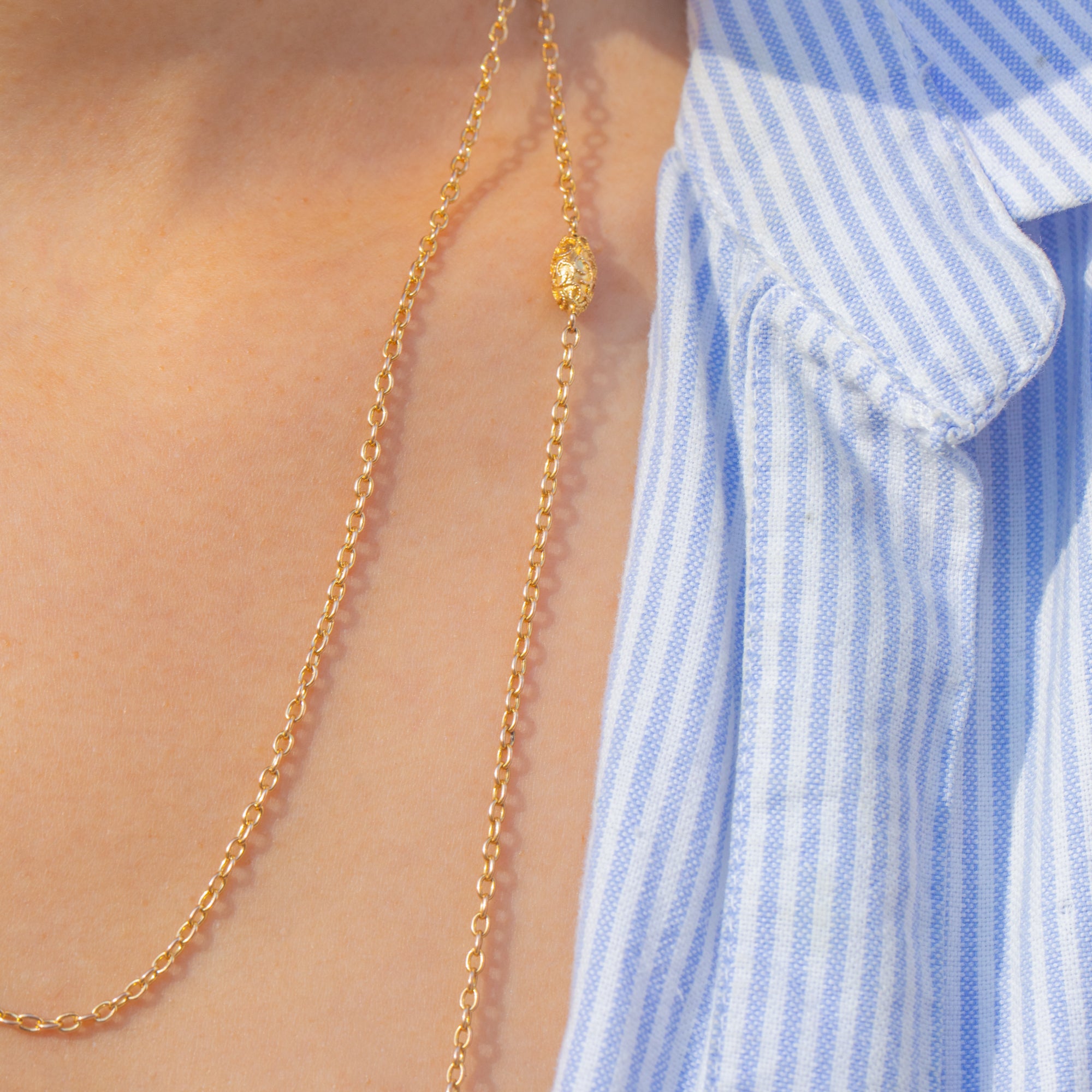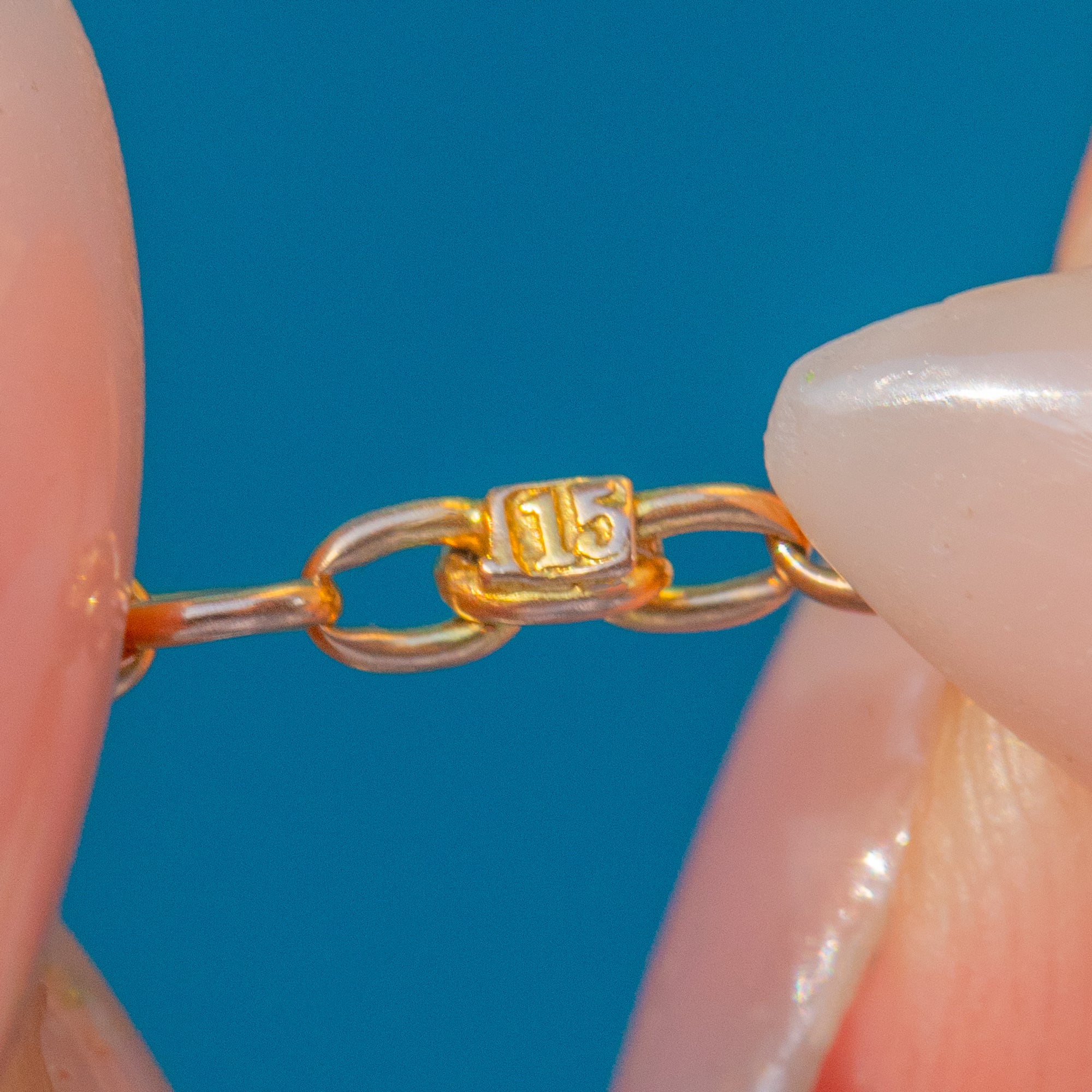 This long and elegant Georgian chain is crafted in rich 15ct Gold, featuring glossy oval belcher links and intricate Cannetille lozenge terminals. Measuring an impressive 47" in length, it can be worn doubled, layered, or styled with a pendant, offering maximum versatility.