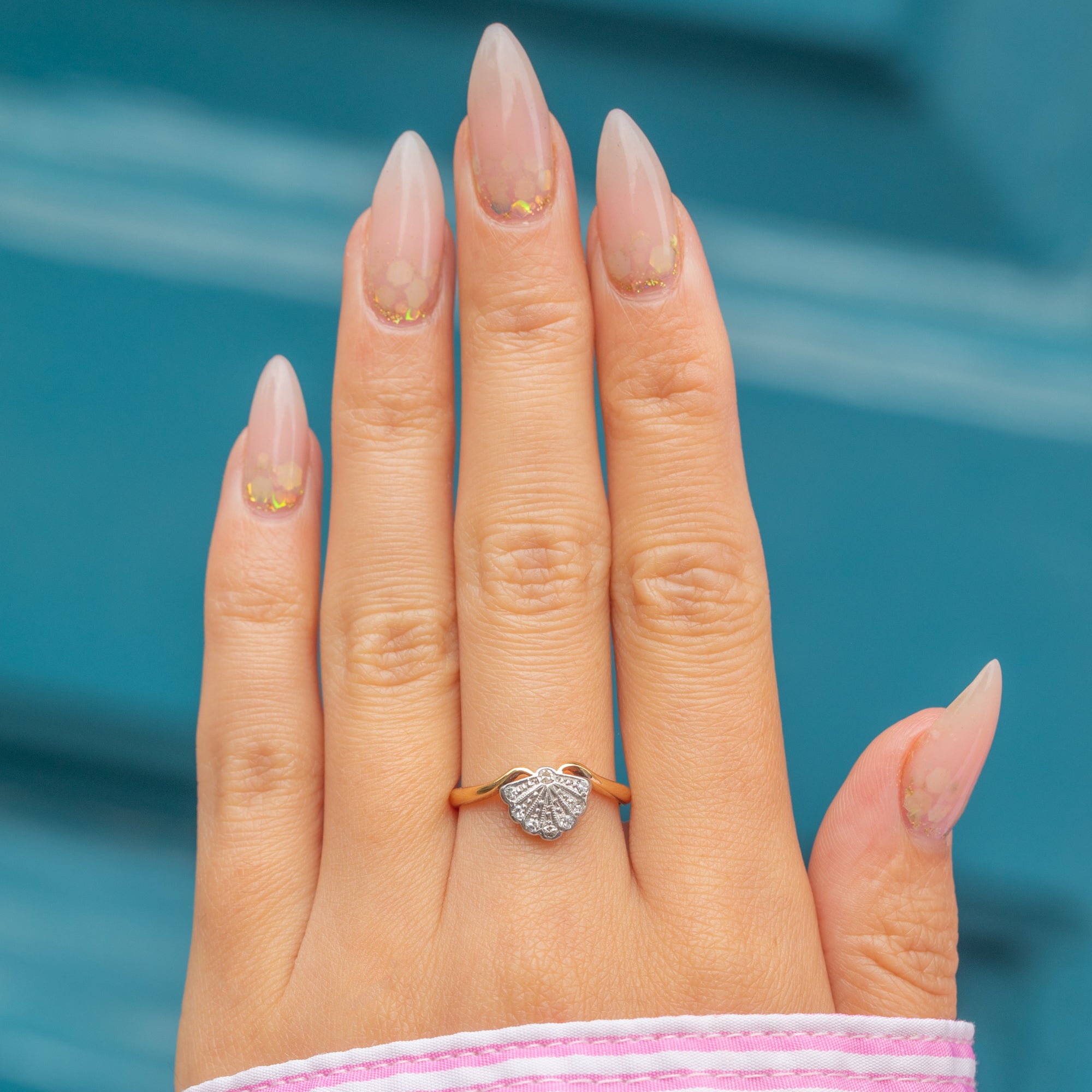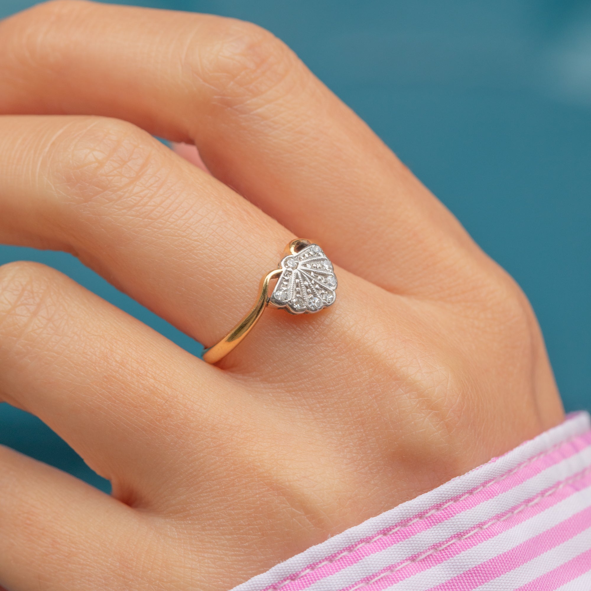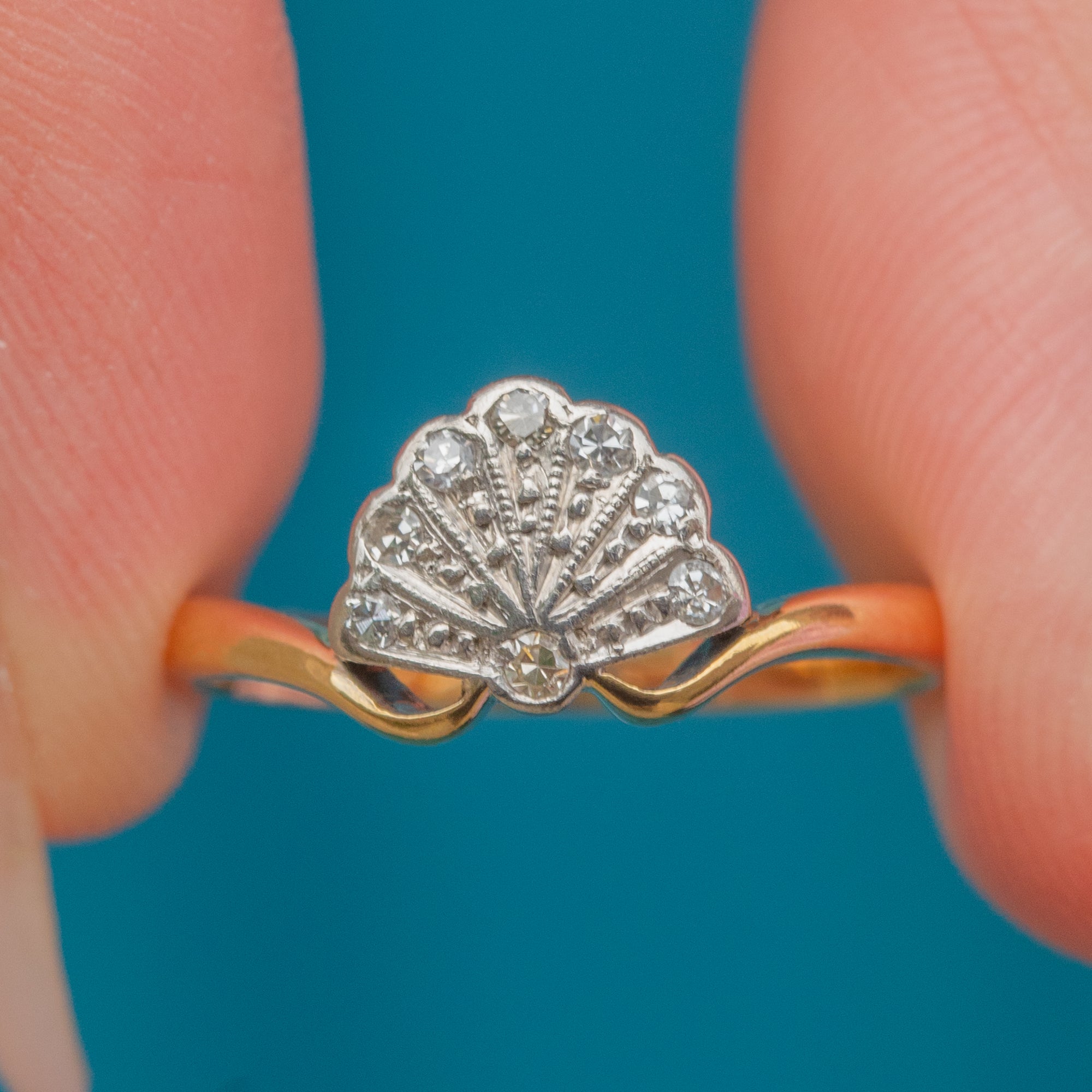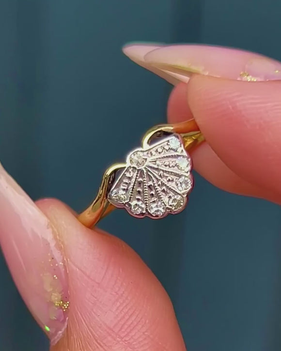 A rare and beautifully preserved Art Deco fan ring, crafted in 18ct Yellow Gold with Platinum settings. The geometric fan motif is set with eight bright, glittering Diamonds, arranged to enhance its elegant symmetry. The tapered shoulders flow seamlessly into the band, a hallmark of refined Art Deco design.