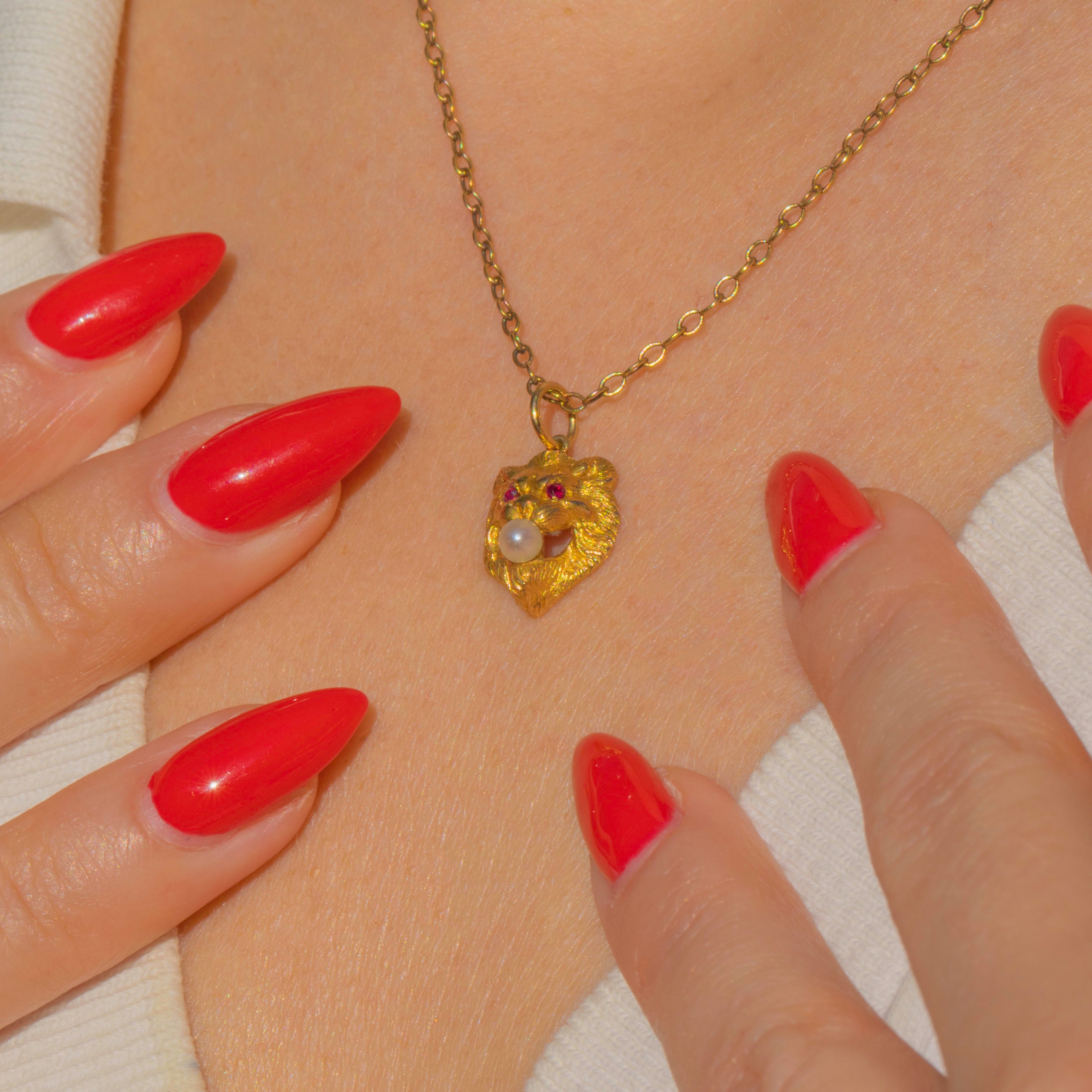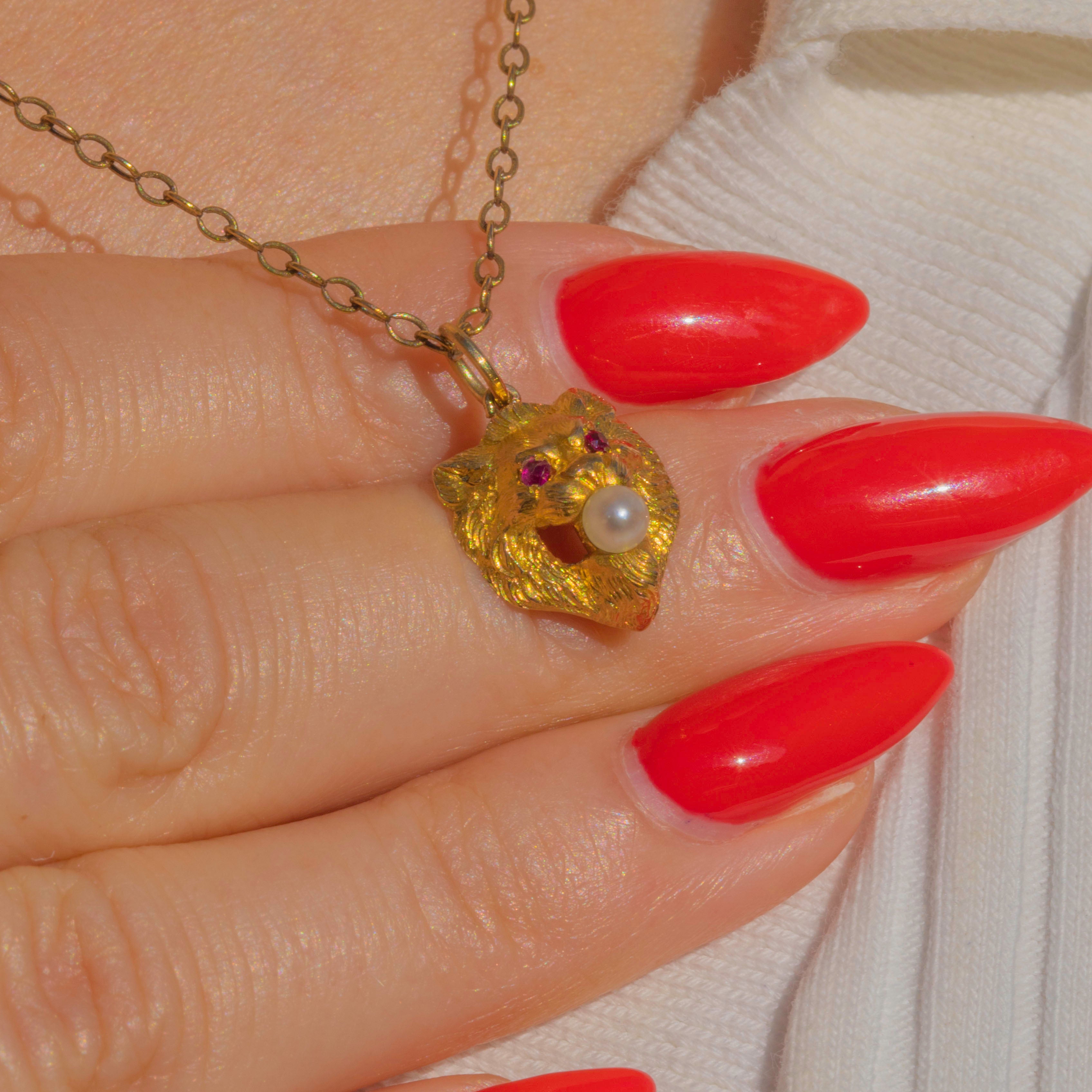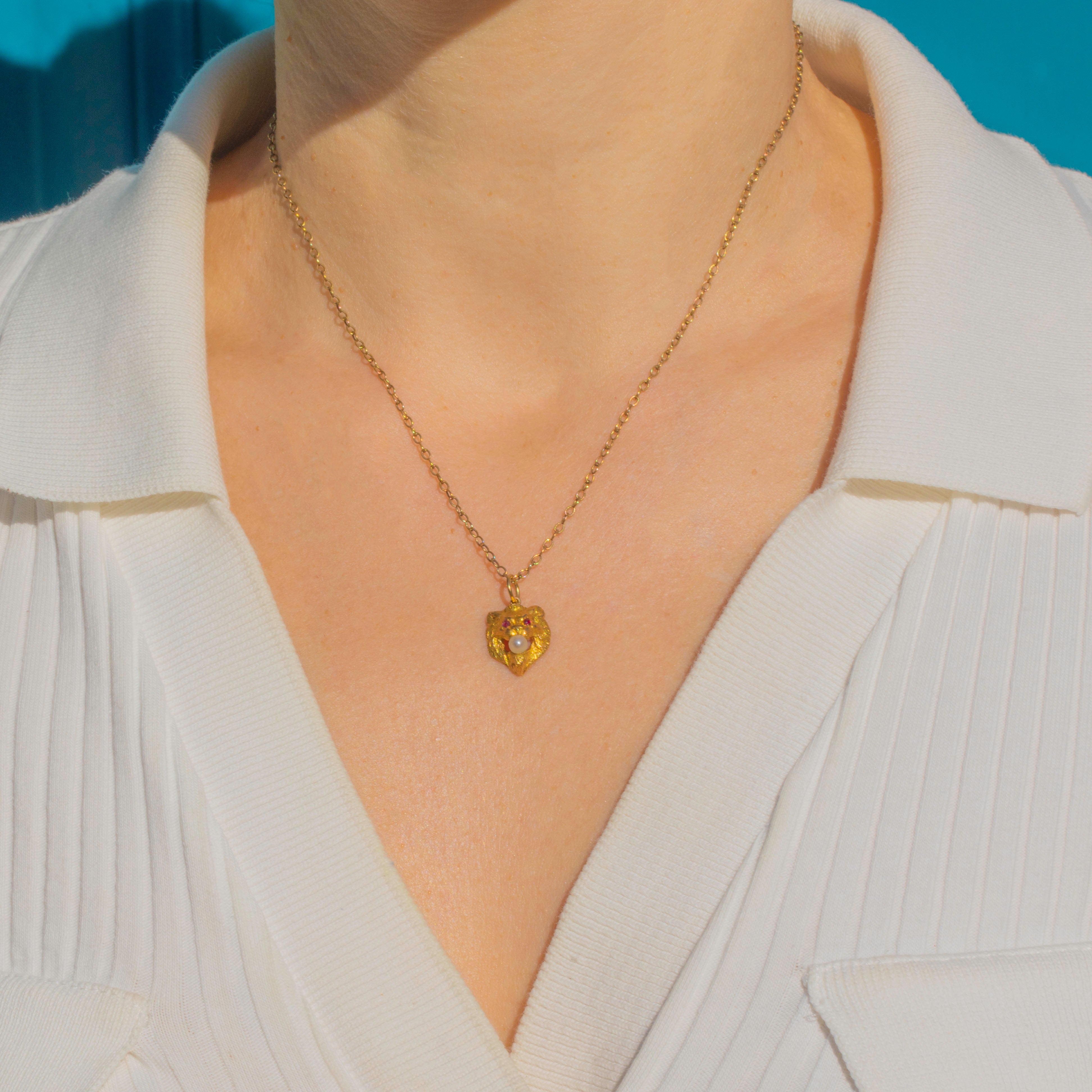 This rare Art Nouveau lion charm is an incredible piece of early 20th-century craftsmanship. Made in solid 18ct Gold, the lion’s face is exquisitely modelled in high relief with a bold mane and striking features. Tiny Rubies form the glowing eyes, while a lustrous Pearl rests between its jaws, creating a powerful and dramatic effect.