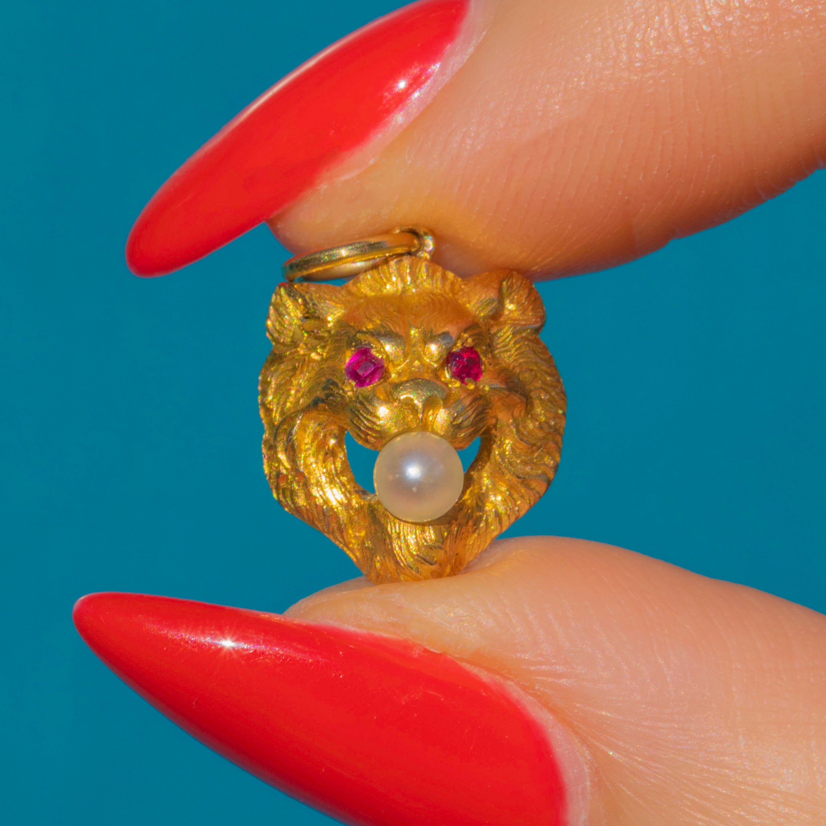 RARE Art Nouveau 18ct Gold & Pearl Lion Charm - Ruby Eyes