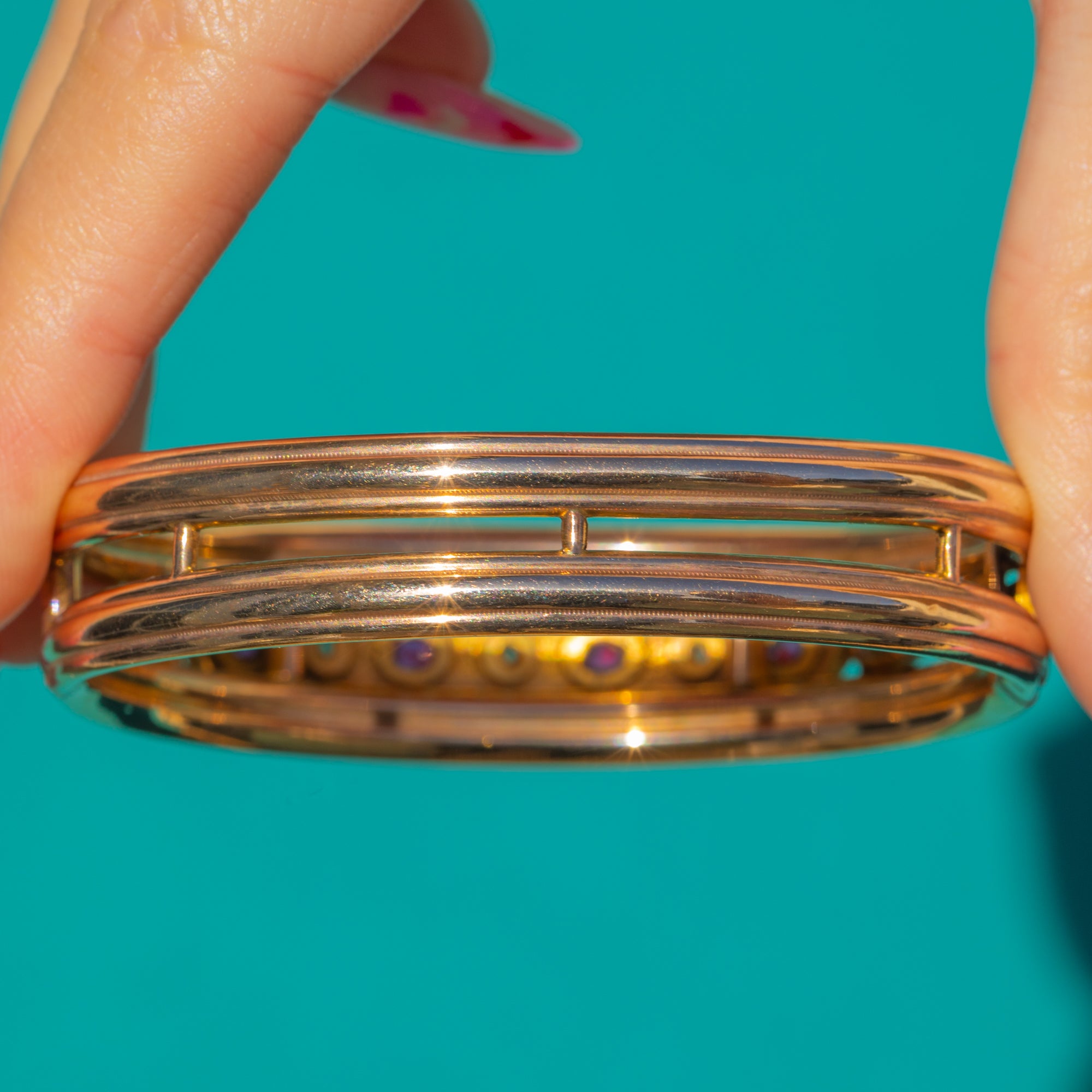 Elegant yet everyday‑wearable, the alternating deep red Rubies and tiny white Diamonds add colour and light in perfect balance. Beautifully finished with a secure hinged closure and safety loop, this is an effortlessly chic Victorian classic.