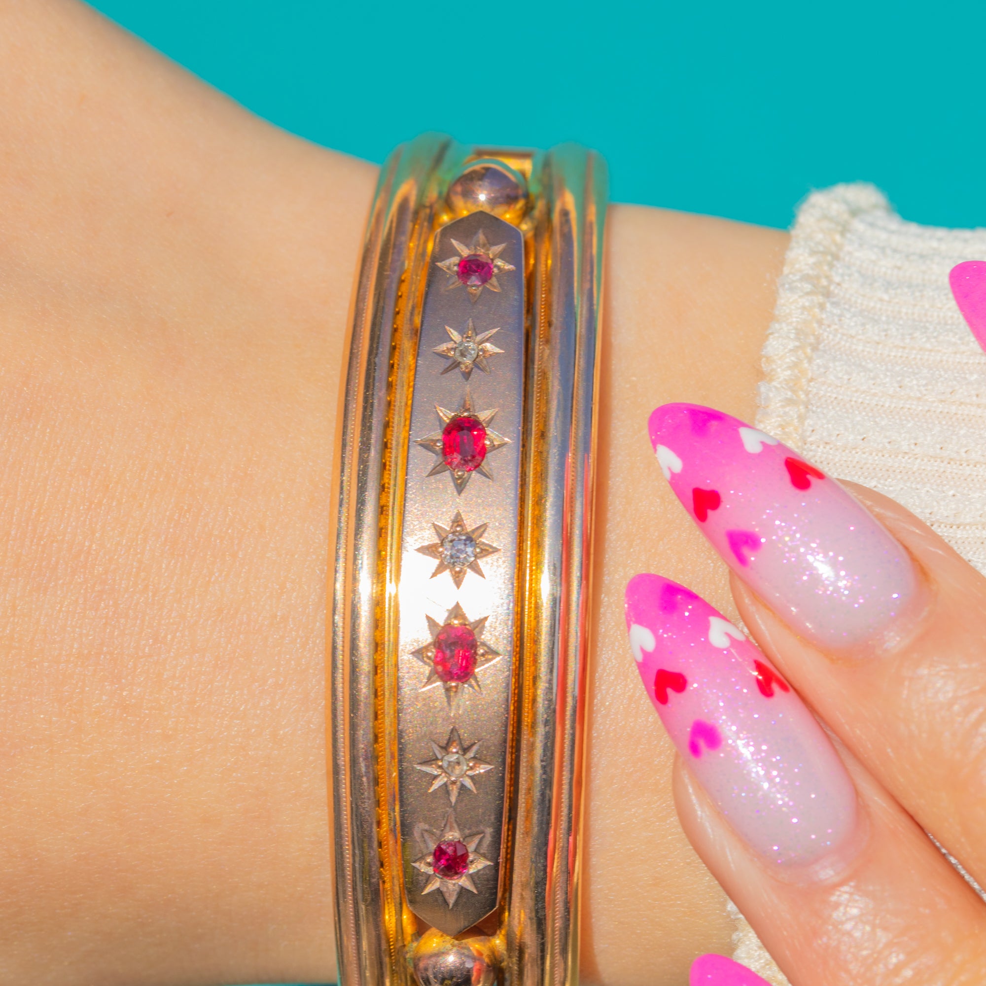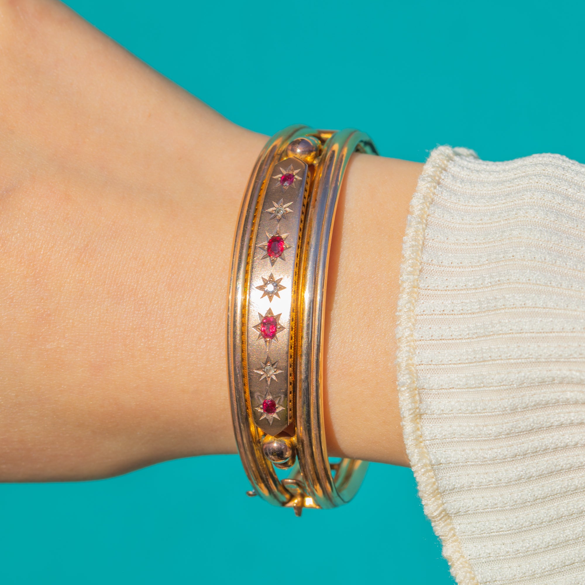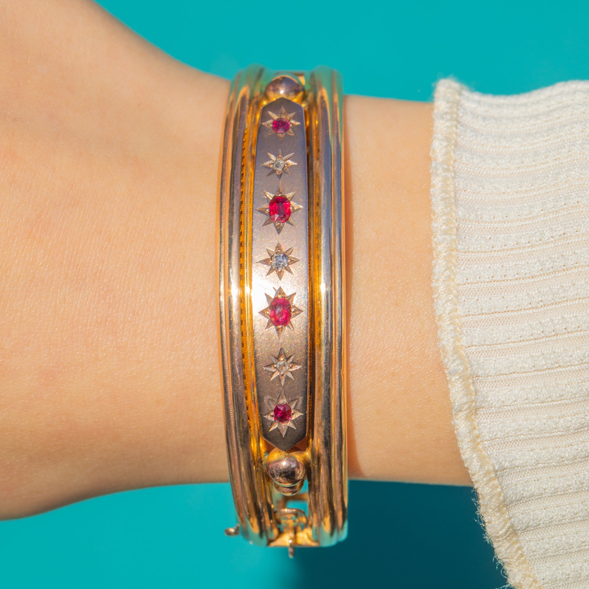 A refined Victorian 9ct Gold hinged bangle, star-set with a rhythmic line of Rubies and twinkling Diamonds. The raised central panel presents a subtle two‑tone look against the warmer Gold rails, each gemstone framed by crisp, engraved eight‑point stars for that quintessential late‑19th century sparkle.