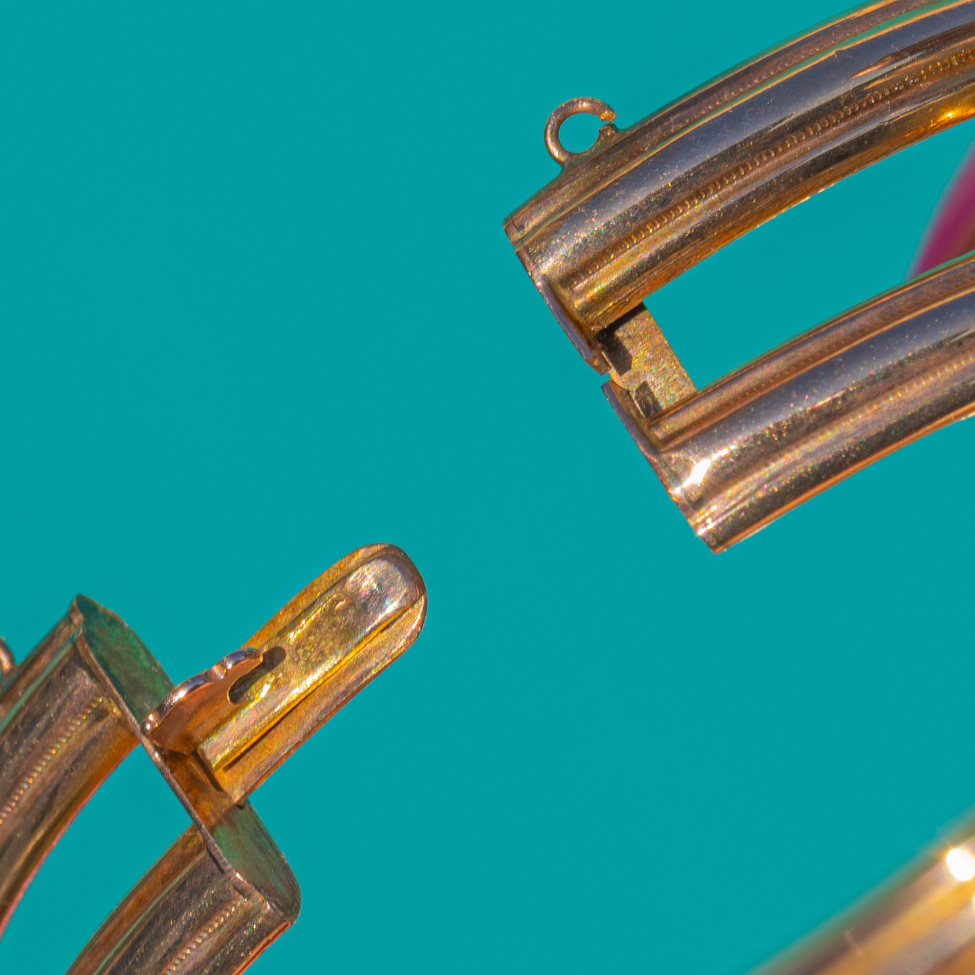 EXCELLENT: Rubies and Diamonds are bright, well-matched and securely set with minimal facet wear visible under magnification. Gold surfaces show light surface scratches and a gentle patina consistent with age. Hinge and clasp are in good working order with a safety loop for added security.