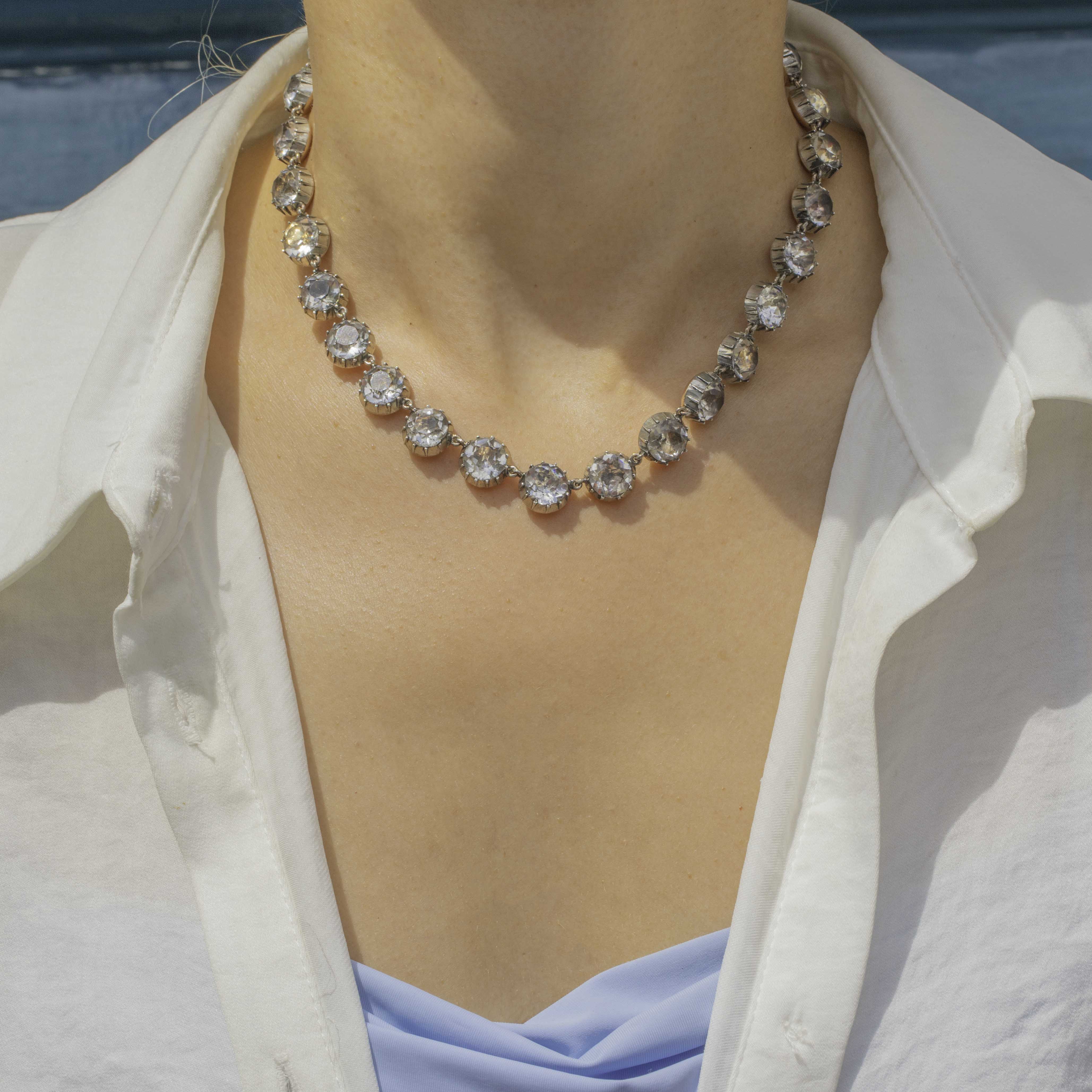 VERY GOOD-EXCELLENT. Each of the Paste gemstones is secure in its traditional piecrust setting, complete with 9ct Gold domed backs for comfortable wear. There is some slight variation in colour to the foils behind a few of the Paste gemstones and a few surface marks on some of the facets, but this is only noticeable under close inspection. The Silver has a lovely lustre, and her piecrust settings have accrued an admirable patina for a dramatic finish, enhancing the sparkle of the gemstones! The tongue clasp is in perfect working order, allowing you to wear her confidently, whatever the occasion. Over 200 years old, we can't quite believe the incredible condition this Georgian necklace is in, a rare find for sure!