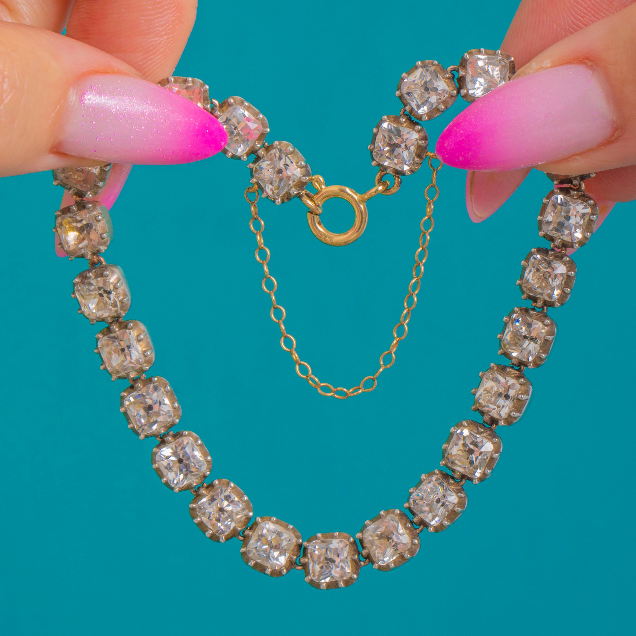 An exquisite early 19th-century Georgian Paste tennis bracelet, set with a continuous line of cushion-cut Back Dot Paste stones that shimmer with refined, candlelit allure. Each stone is housed in traditional Gold-backed Silver piecrust settings, creating that soft glow so beloved of the Georgian era.