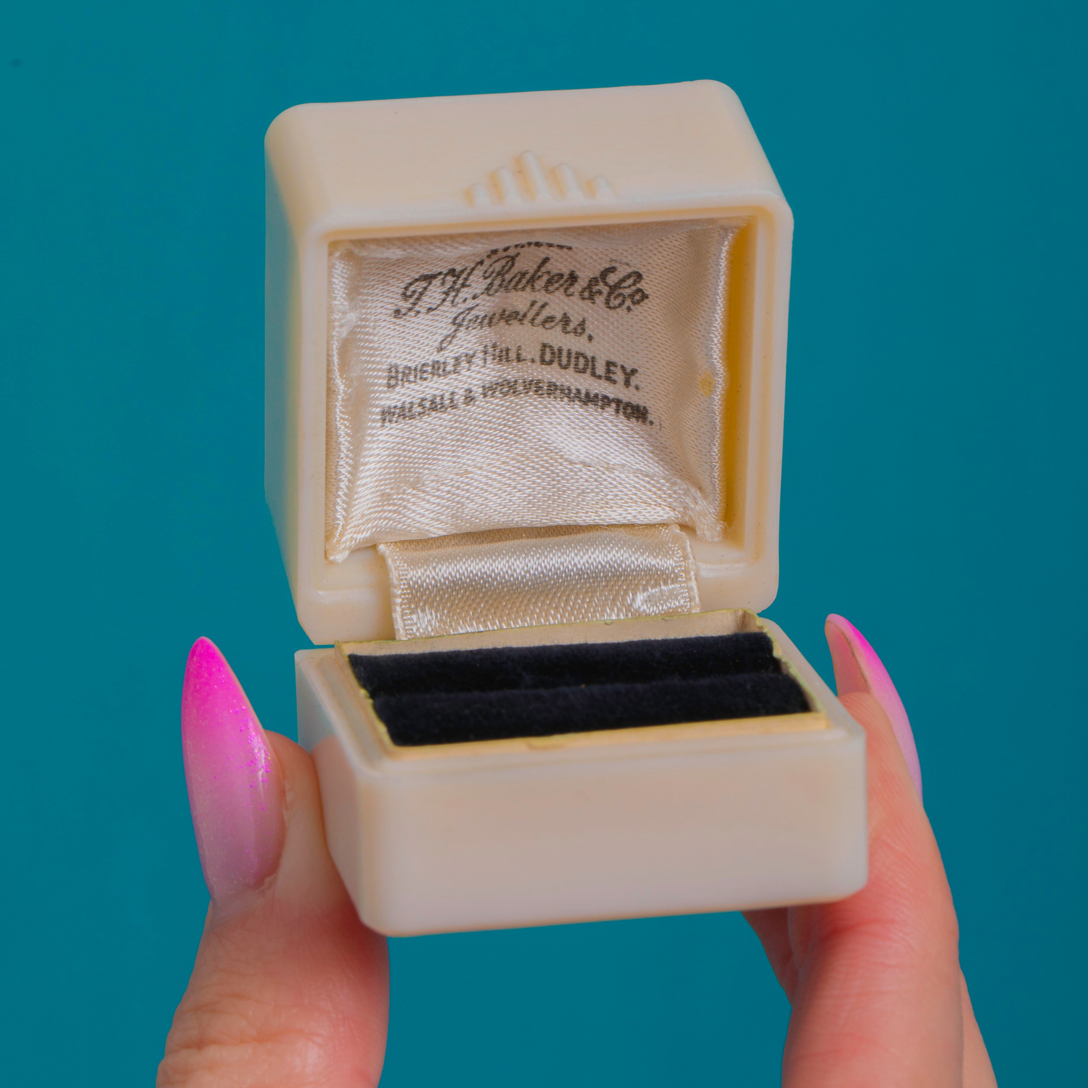 The satin lid is printed “Est 1856 T H Baker & Co Jewellers” with branch locations, while the base is stamped “MADE IN ENGLAND”. Petite yet distinctive, it’s an elegant way to present or store a treasured ring and a delightful collectible in its own right.