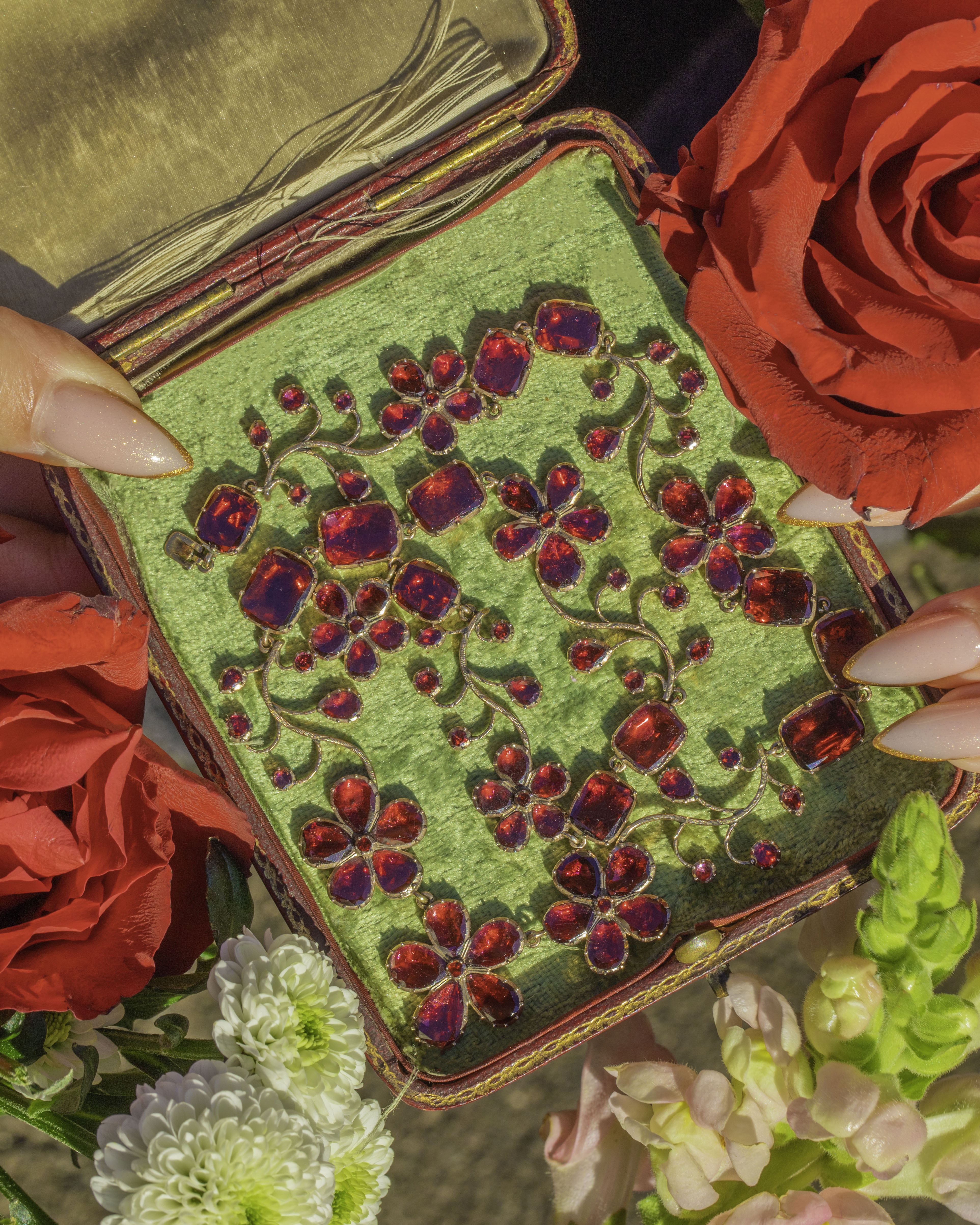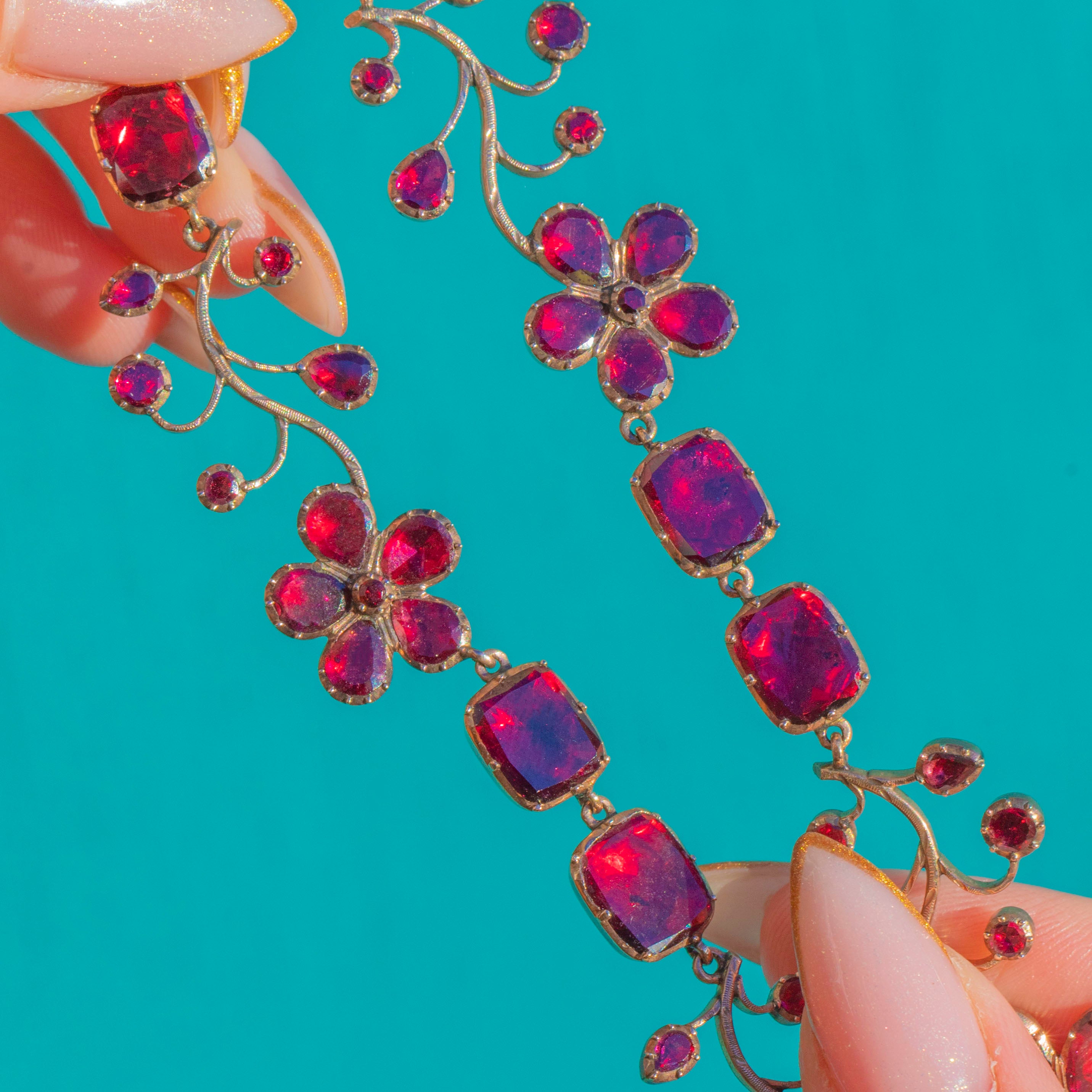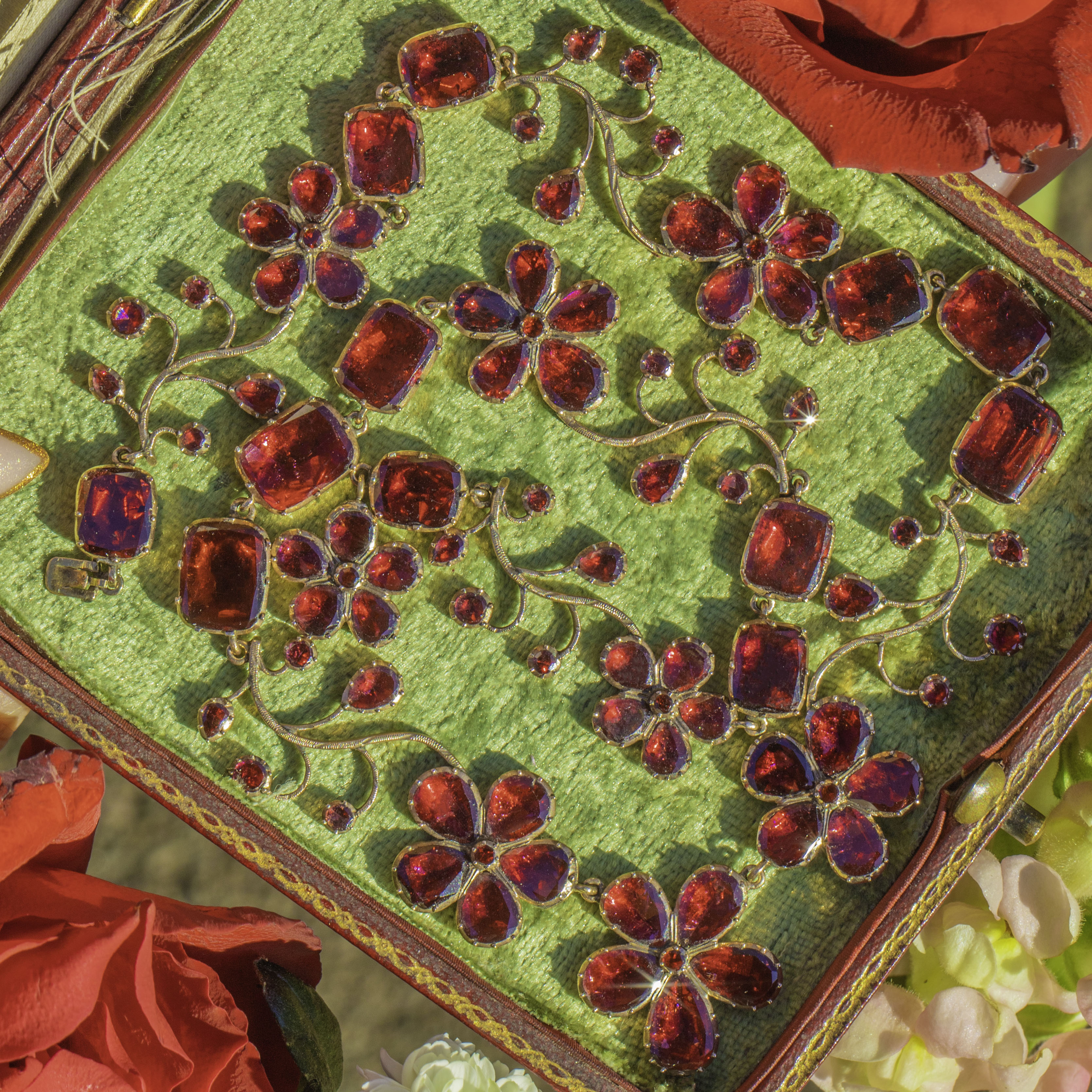 The necklace flows with botanical grace, blending cushion-cut Garnets with delicately arranged floral sprays and exquisitely formed pansies. These sentimental blooms symbolised remembrance, love, and “think of me”, making this an especially romantic and meaningful treasure. With its striking design, generous carat weight, and rare survival in such exceptional condition, this is a museum-worthy jewel for the most discerning antique collector.