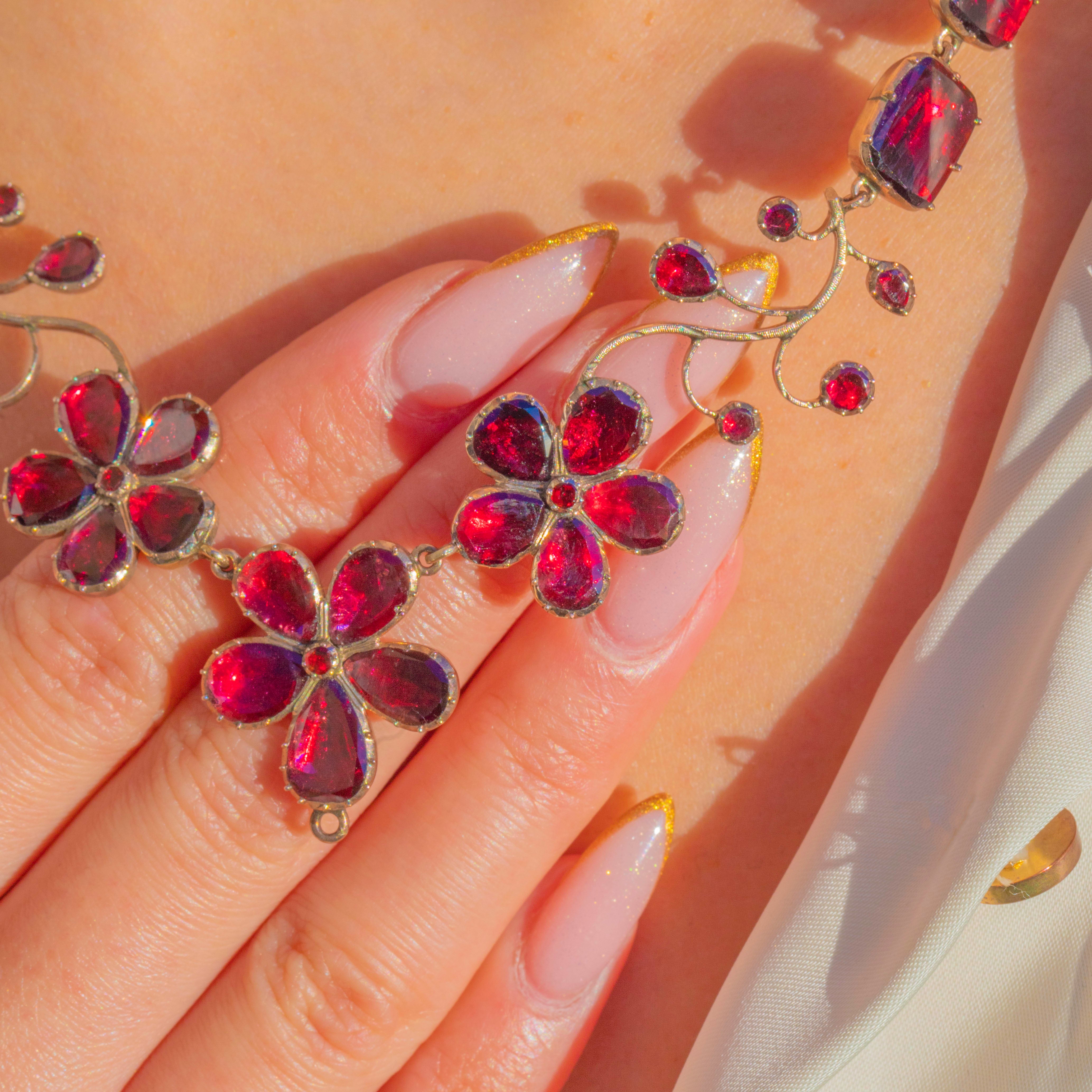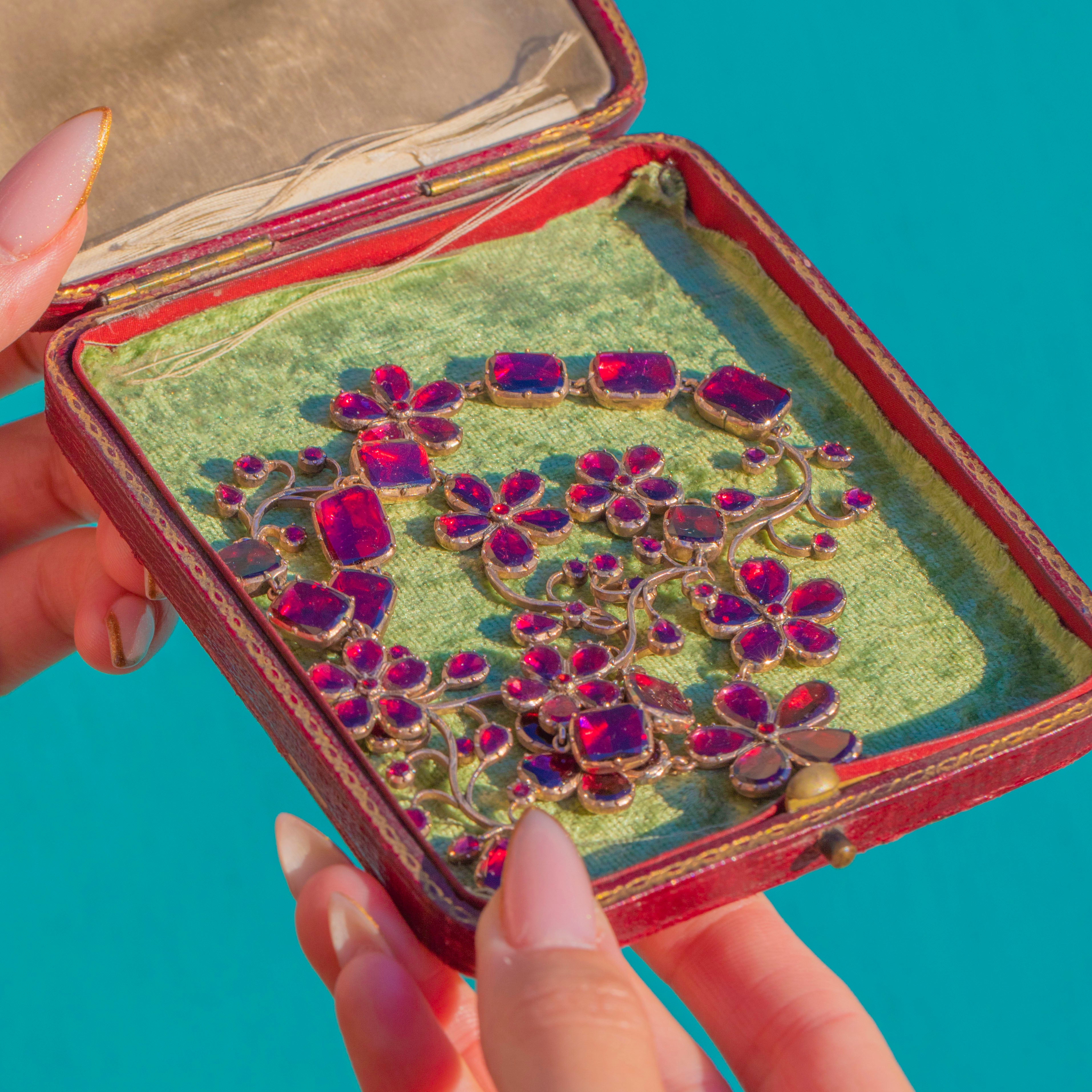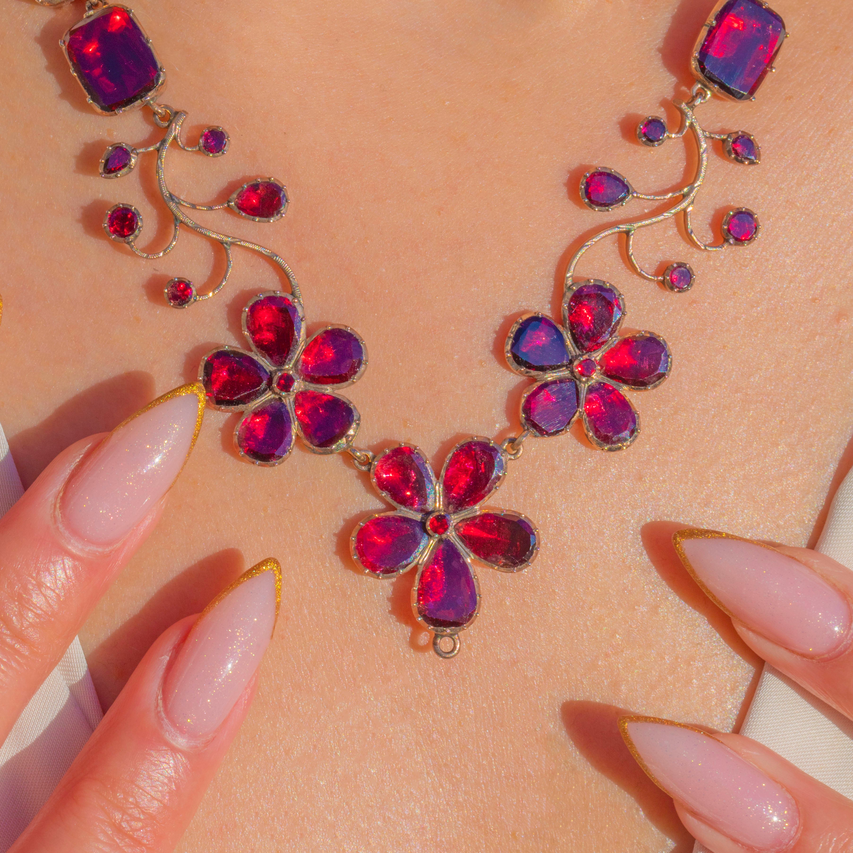 A once-in-a-lifetime Georgian foiled Garnet pansy necklace, crafted circa 1820 and preserved in astonishing condition. This is the kind of jewel collectors dream of, elegant, complete, richly coloured, and utterly evocative of the early 19th century.
