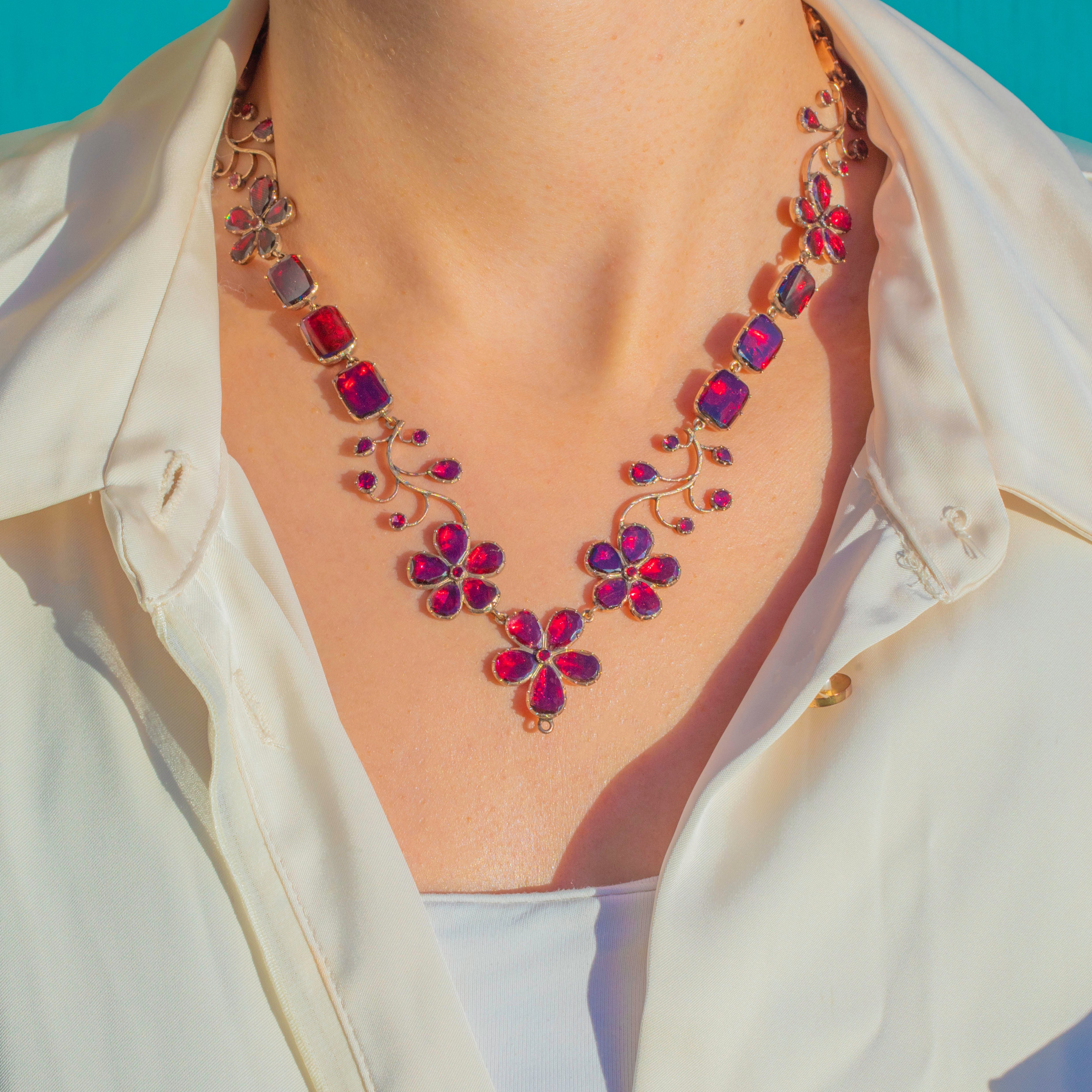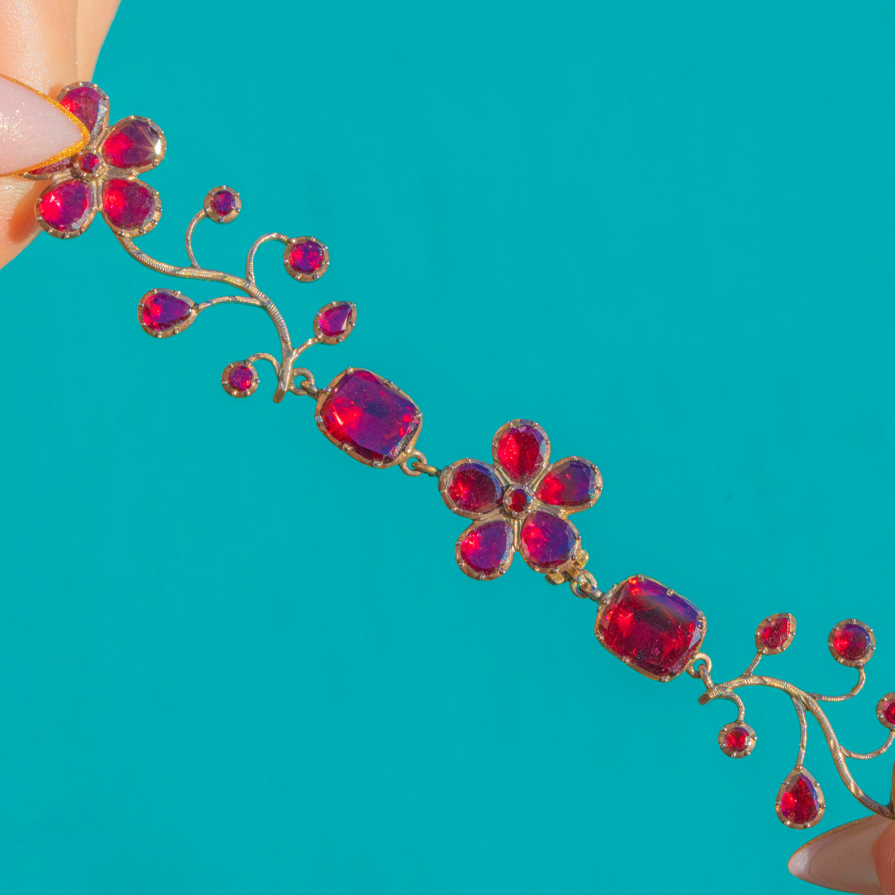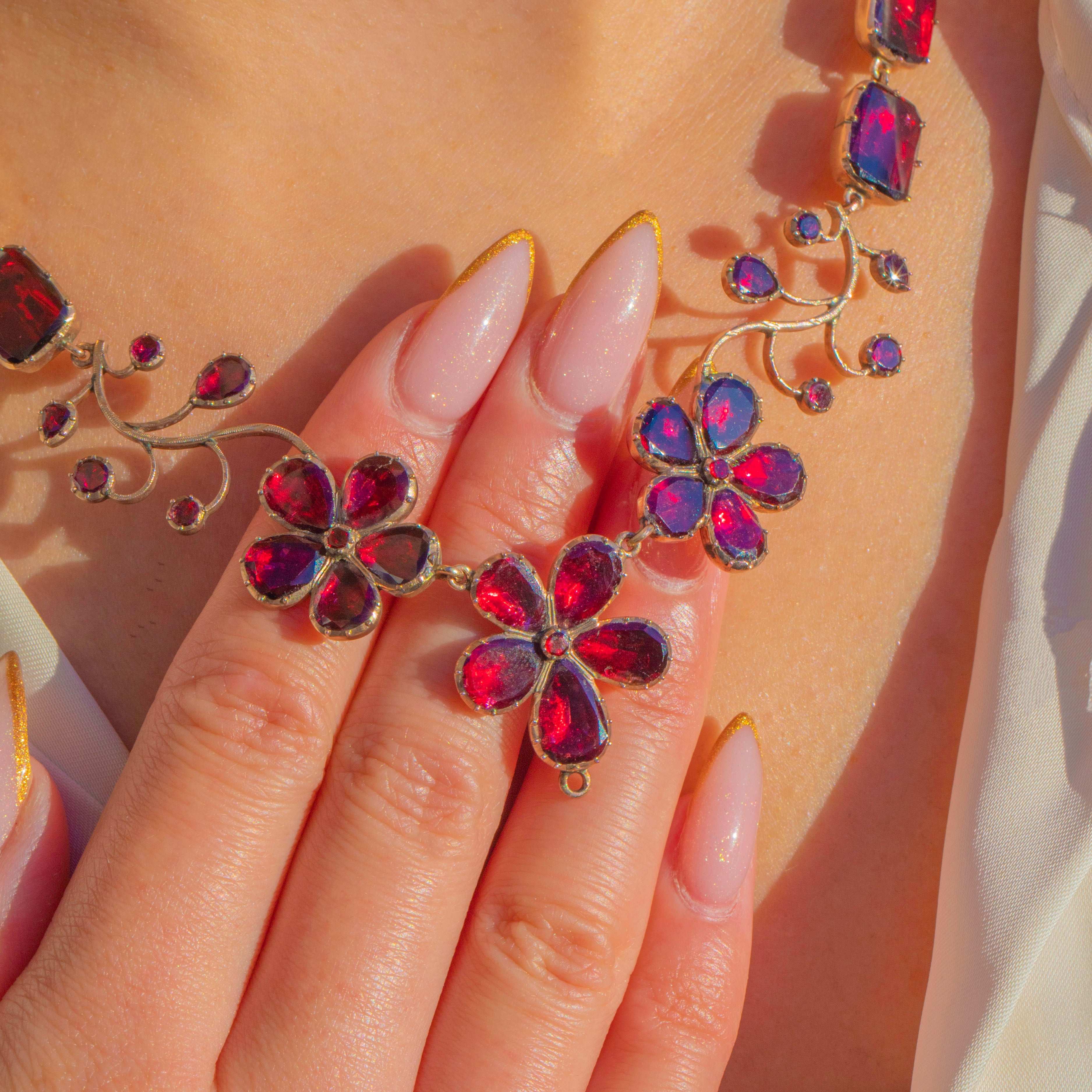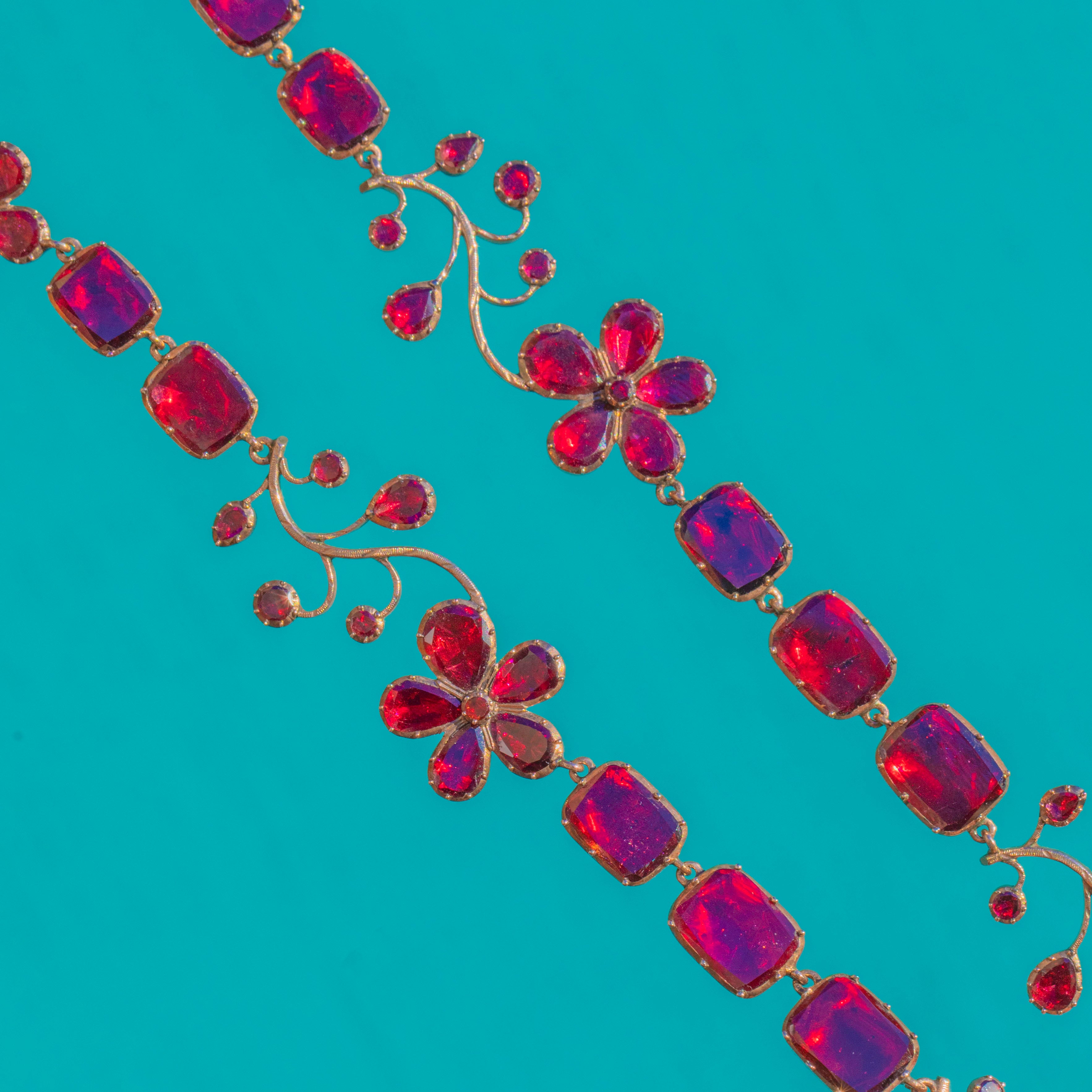 A once-in-a-lifetime Georgian foiled Garnet pansy necklace, crafted circa 1820 and preserved in astonishing condition. This is the kind of jewel collectors dream of, elegant, complete, richly coloured, and utterly evocative of the early 19th century.