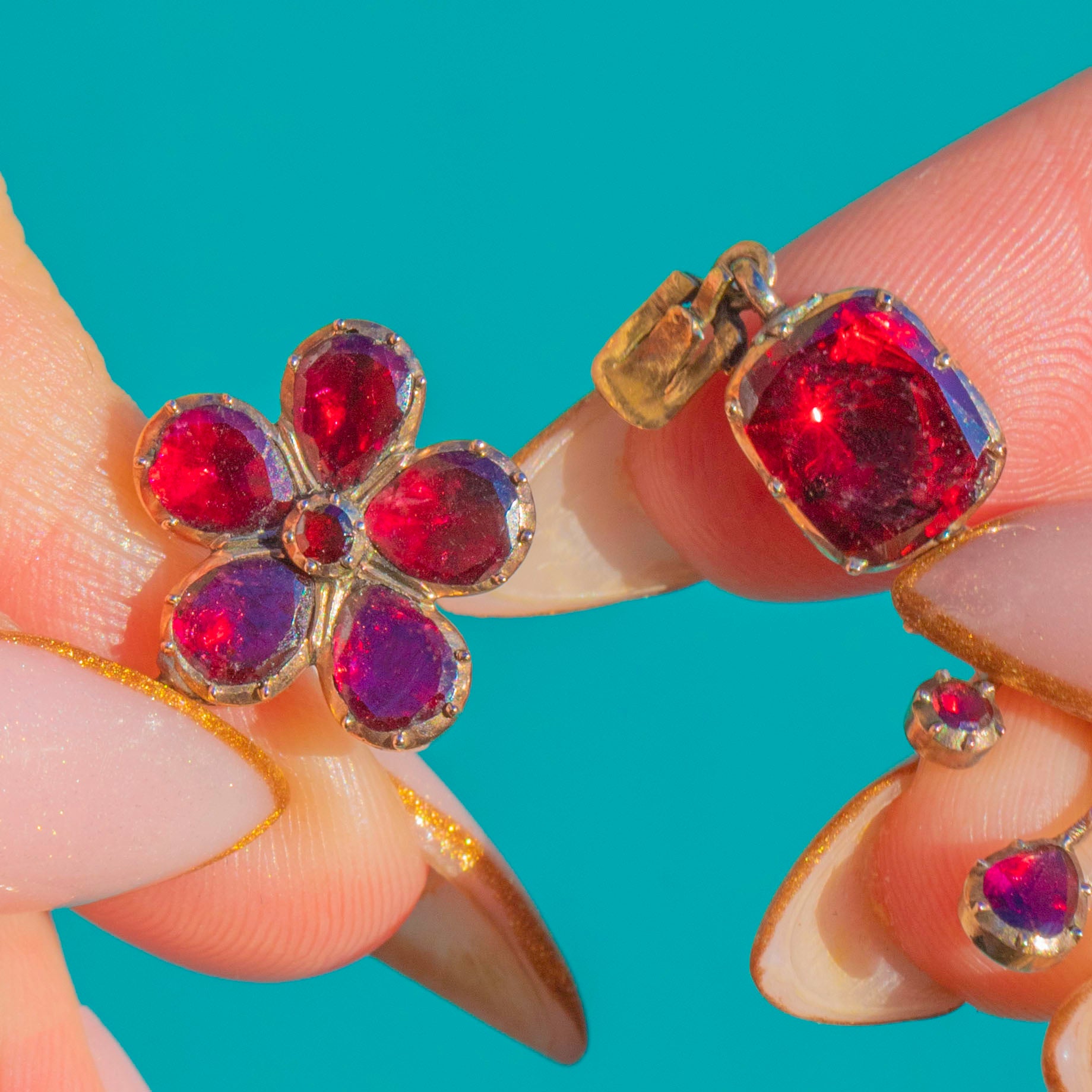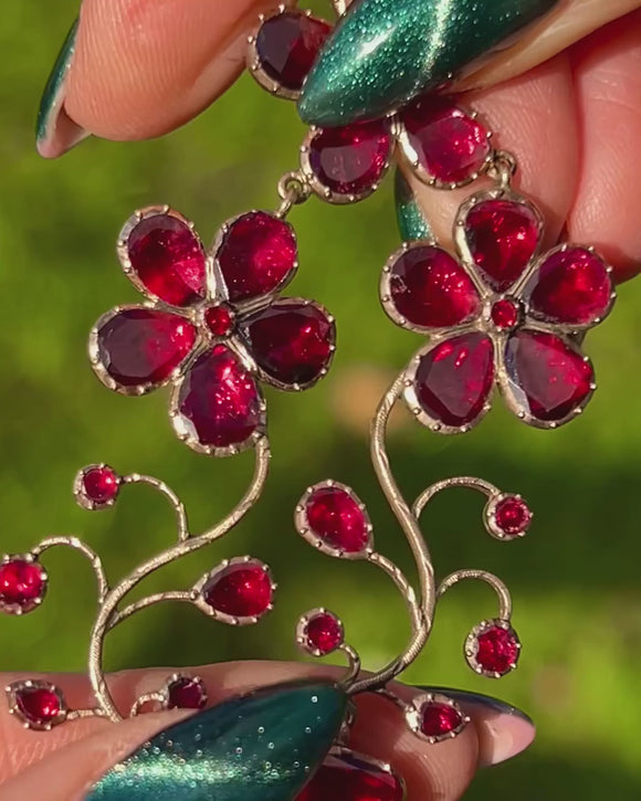 Each Garnet is beautifully foil-backed, igniting with velvety crimson fire that glows even in the softest light, an unmistakable hallmark of Georgian era craftsmanship, set in solid 9ct Gold.