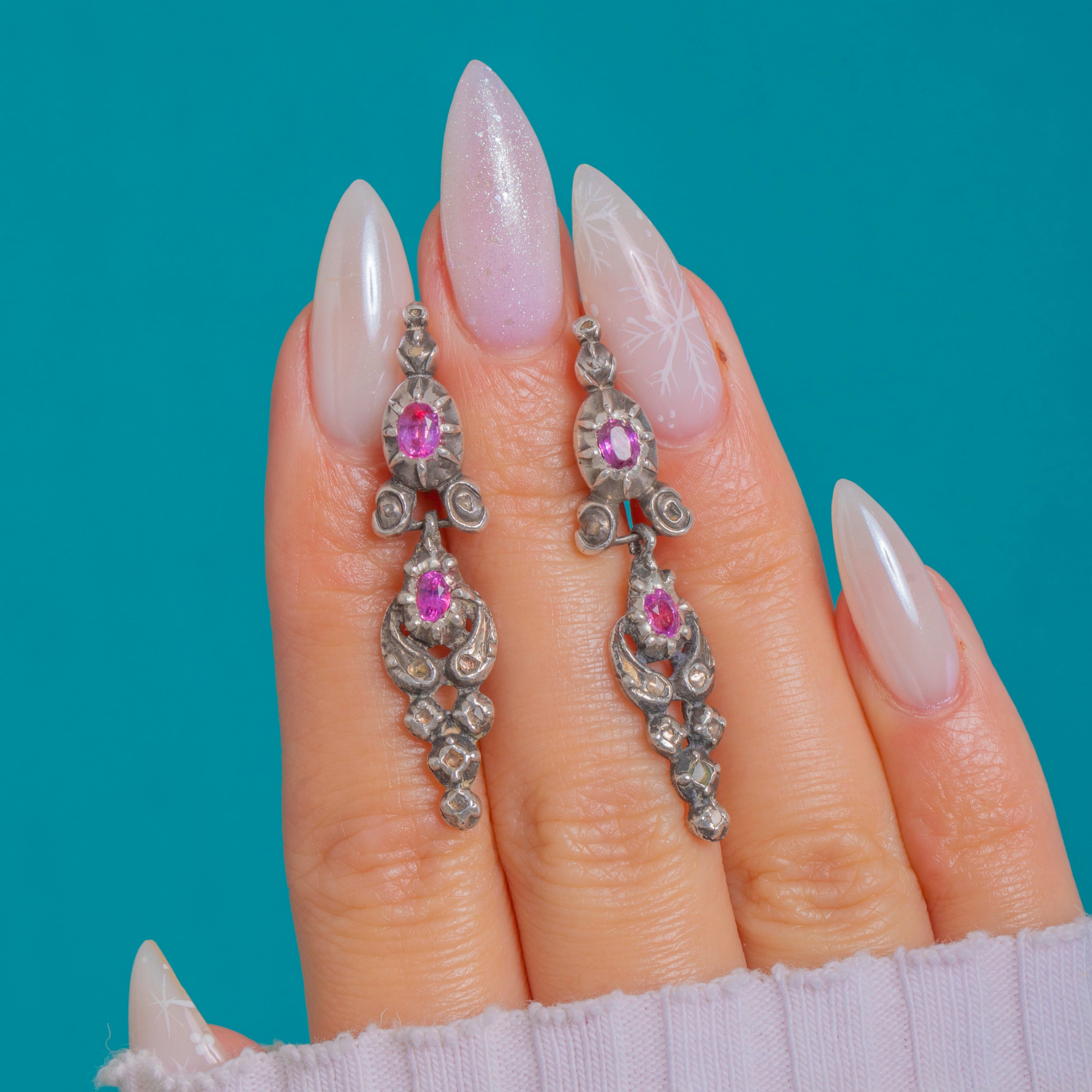 Delicate and ornate, these Georgian drop earrings unfurl in scrolling openwork, each articulated to sway with a graceful, tapering silhouette. Two lively Rubies per earring anchor the design, framed by a constellation of tiny rose-cut Diamonds that scatter a soft, antique sparkle.