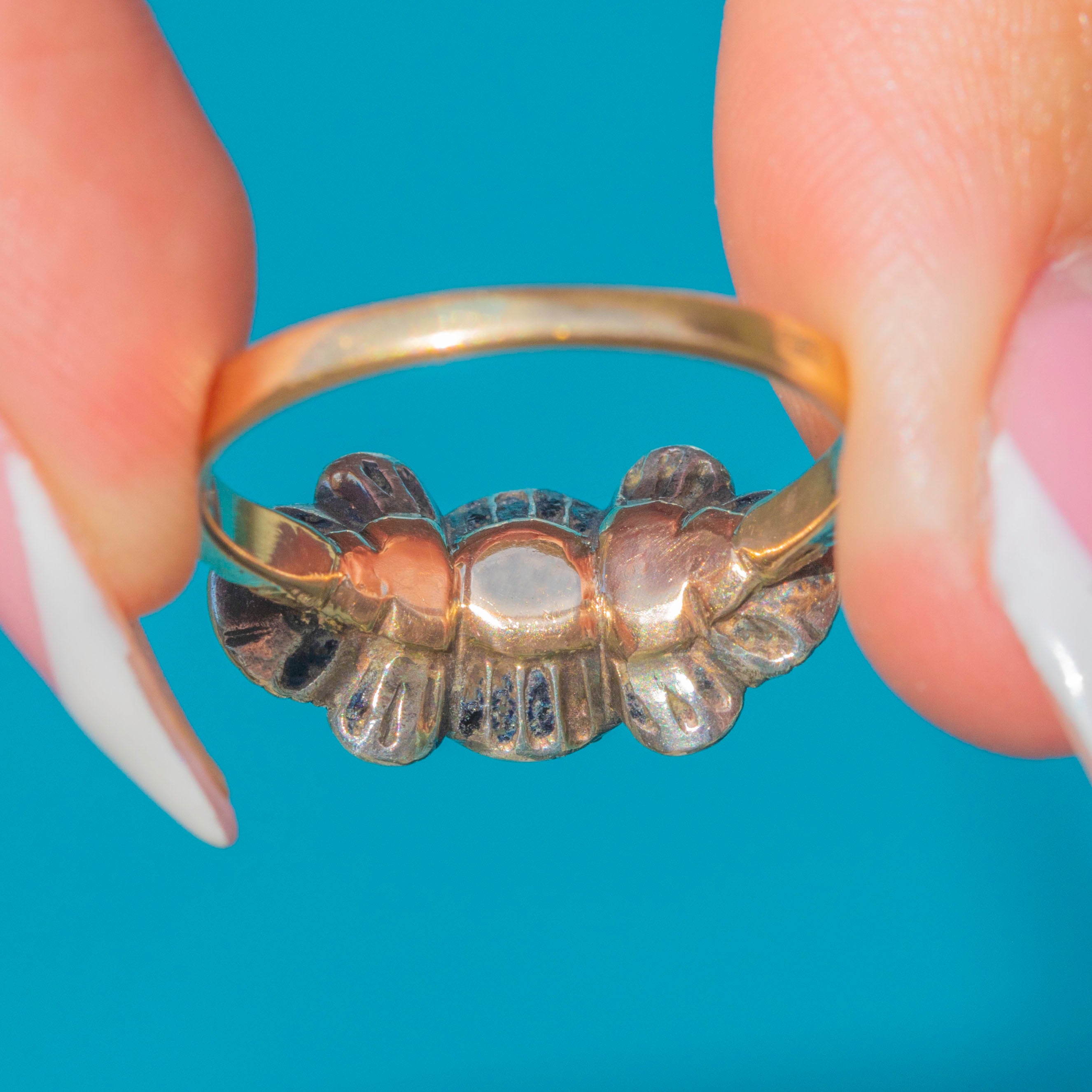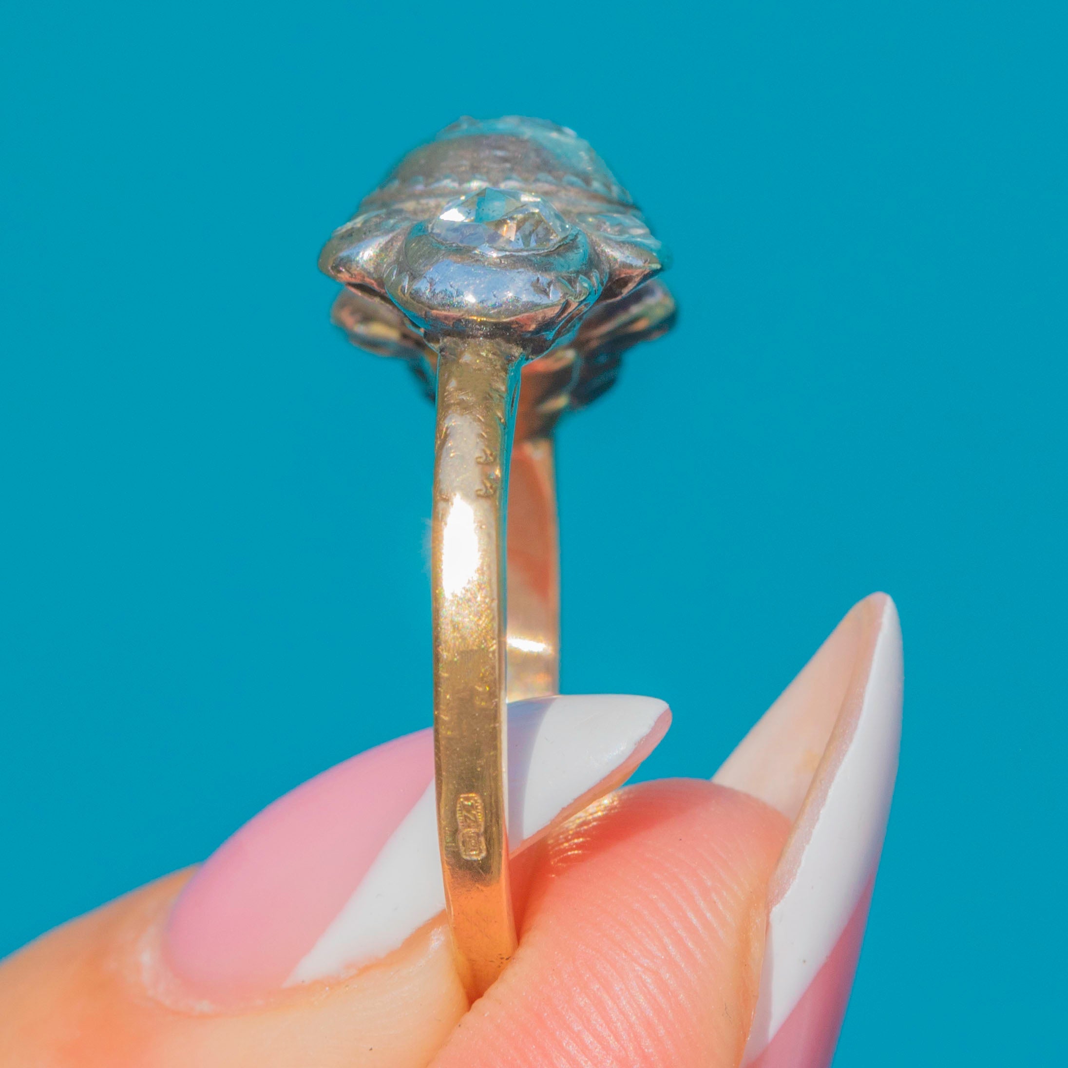 The Diamonds are mounted in Silver settings backed with Enamel, resting on a rich 18ct Gold band. Its low, domed profile and vibrant foiling are characteristic of the Iberian aesthetic, making this a true collector's piece from the Georgian era.