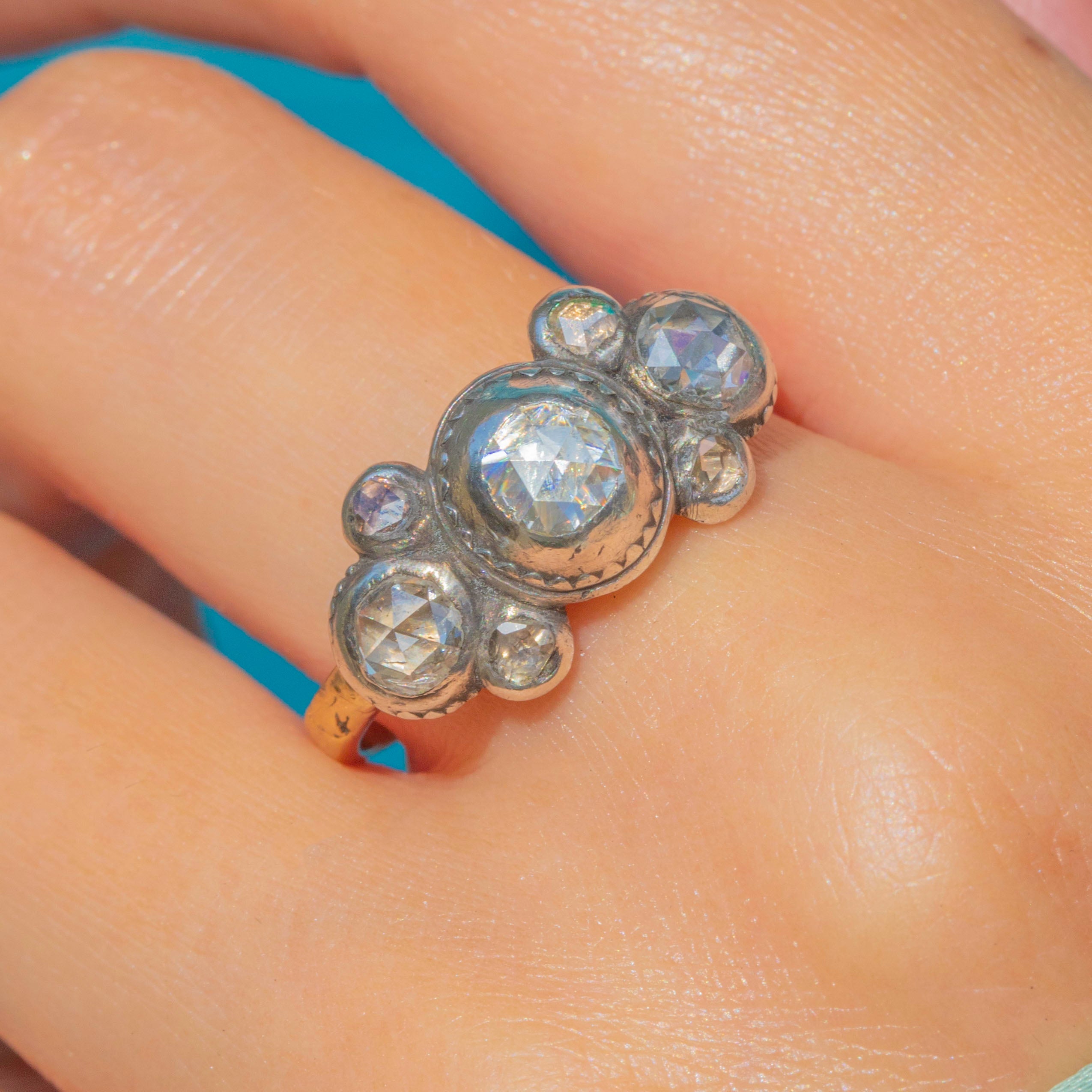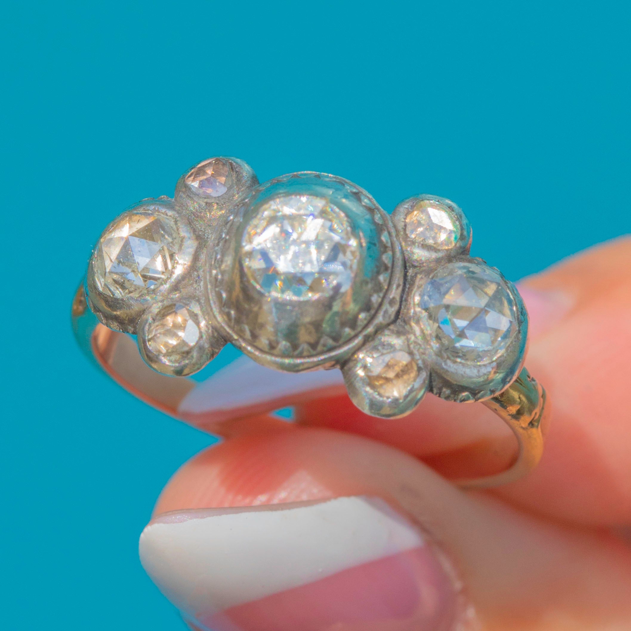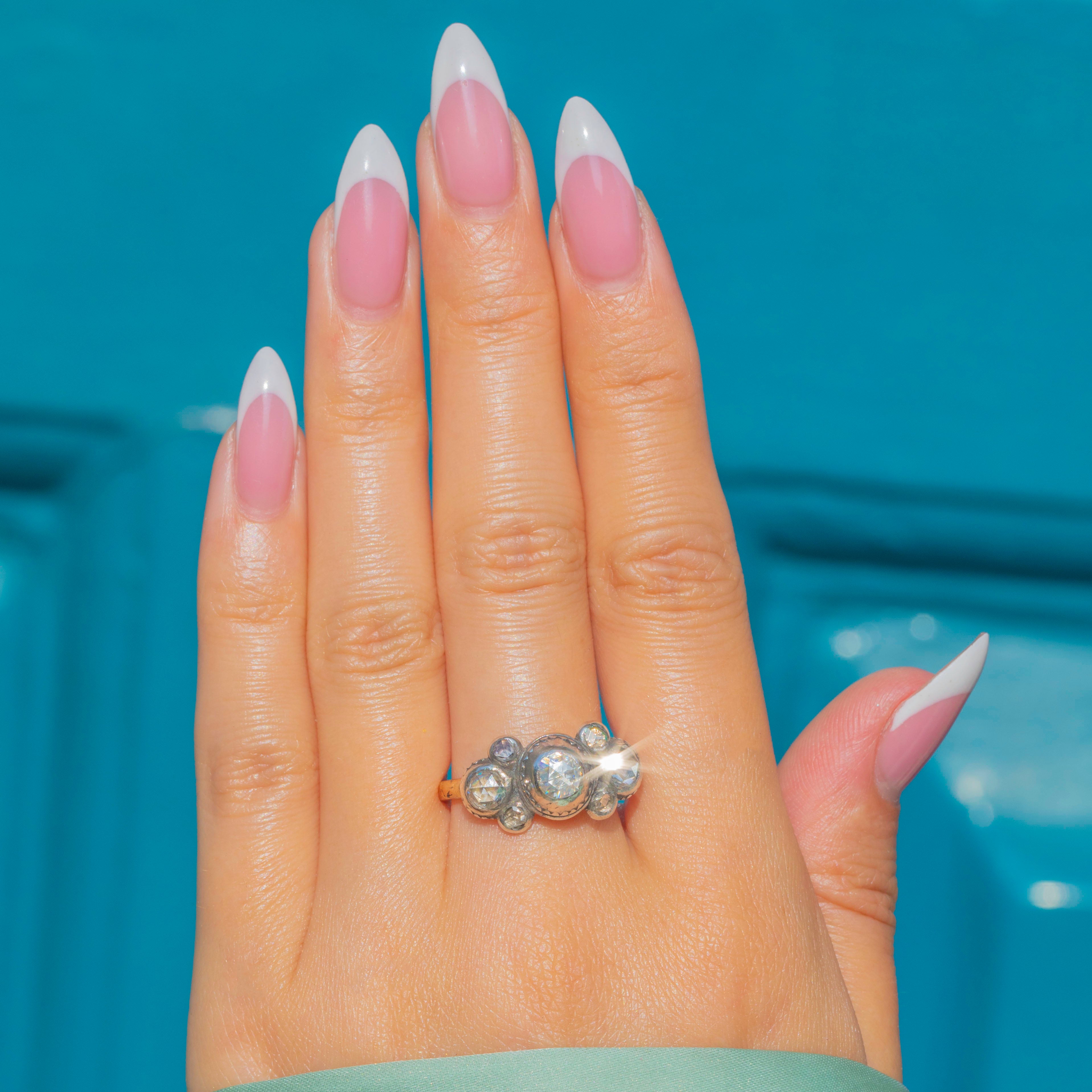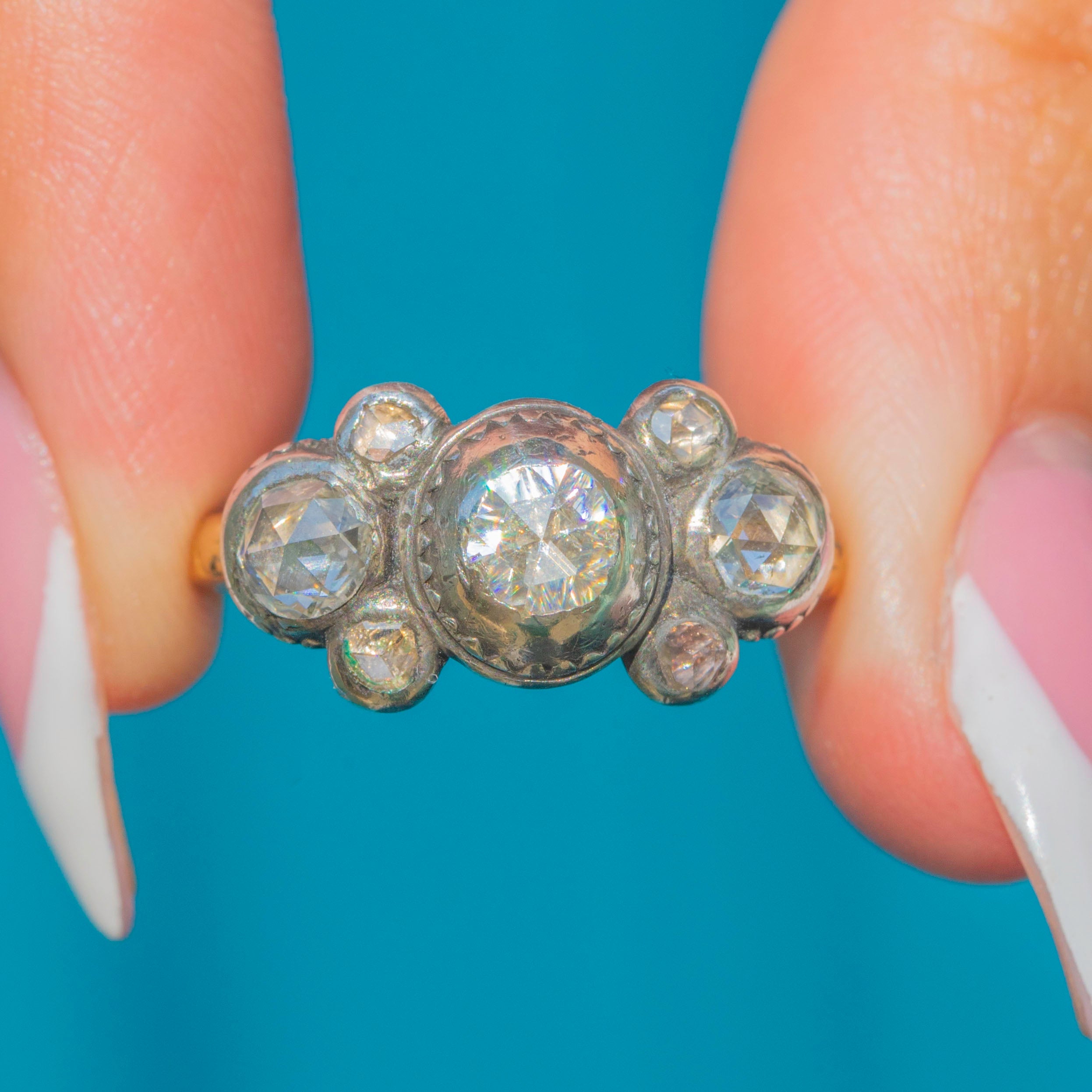 This rare and beautiful Iberian ring dates circa 1780 and showcases the fine craftsmanship of late 18th-century jewellery. Set with seven foiled rose-cut Diamonds adding up to 0.60ct combined, the ring dazzles from every angle.